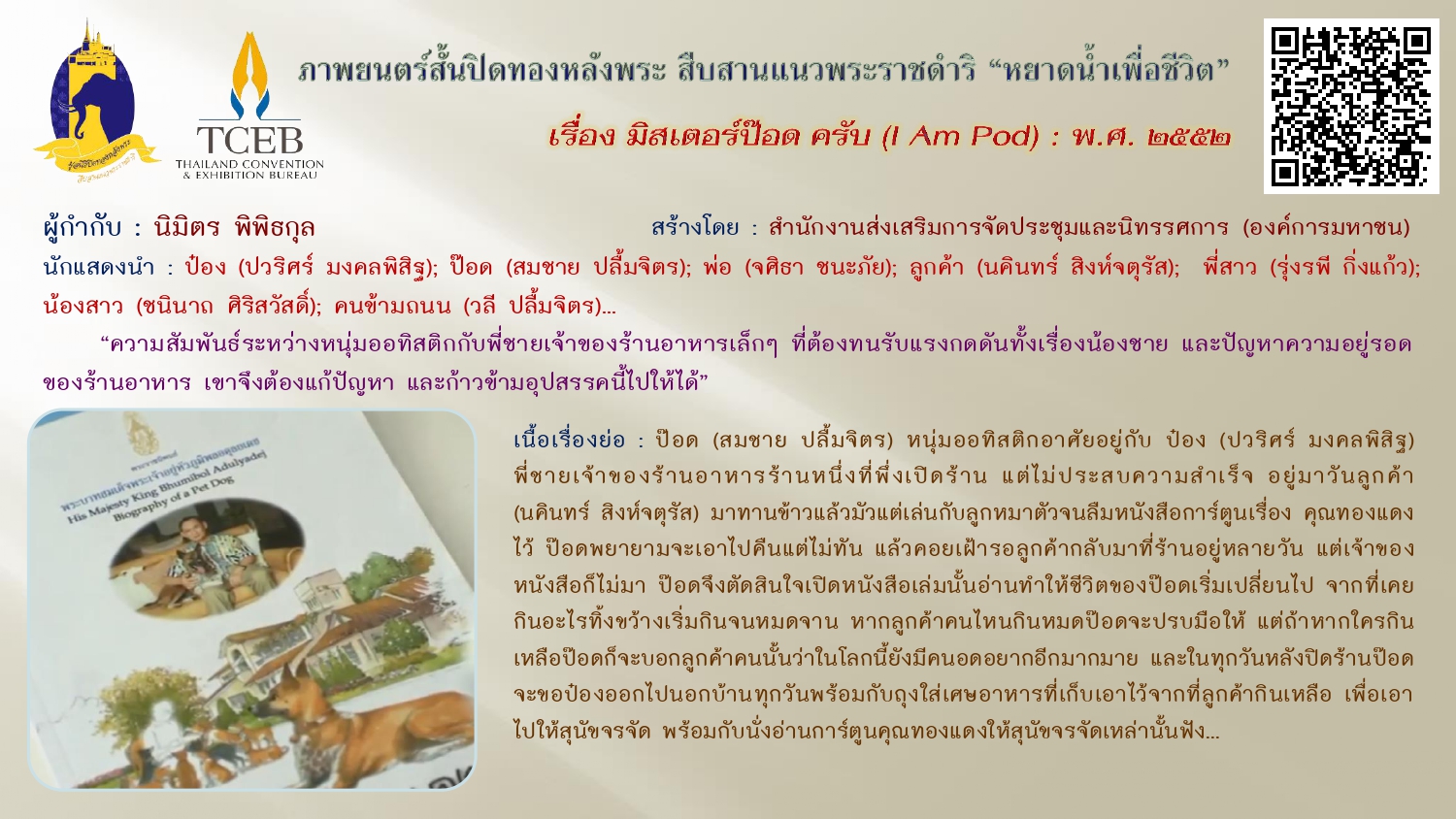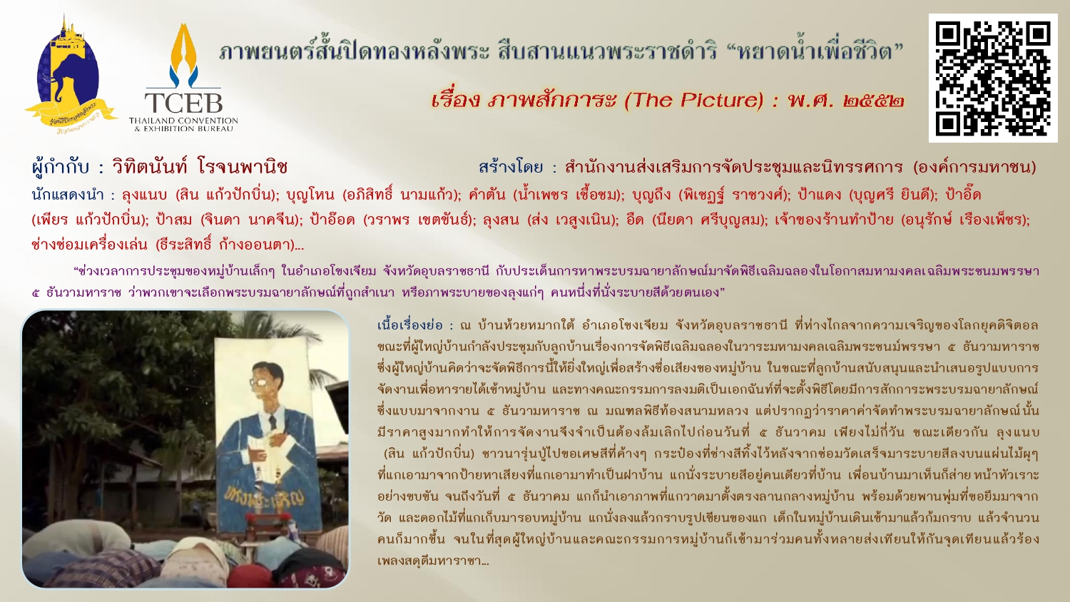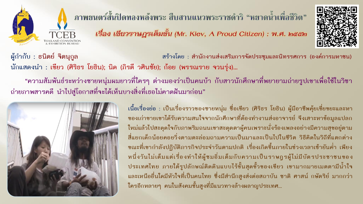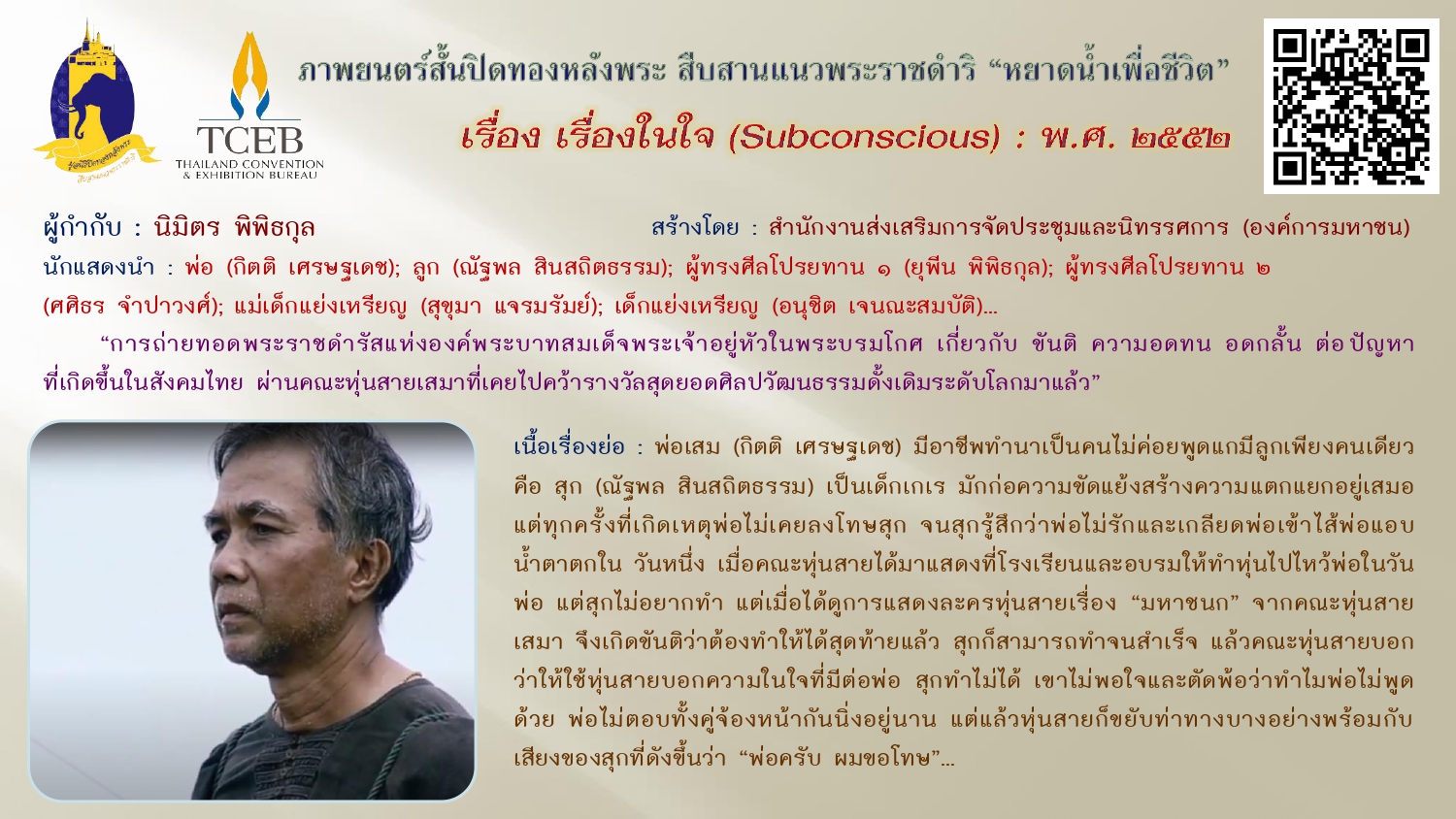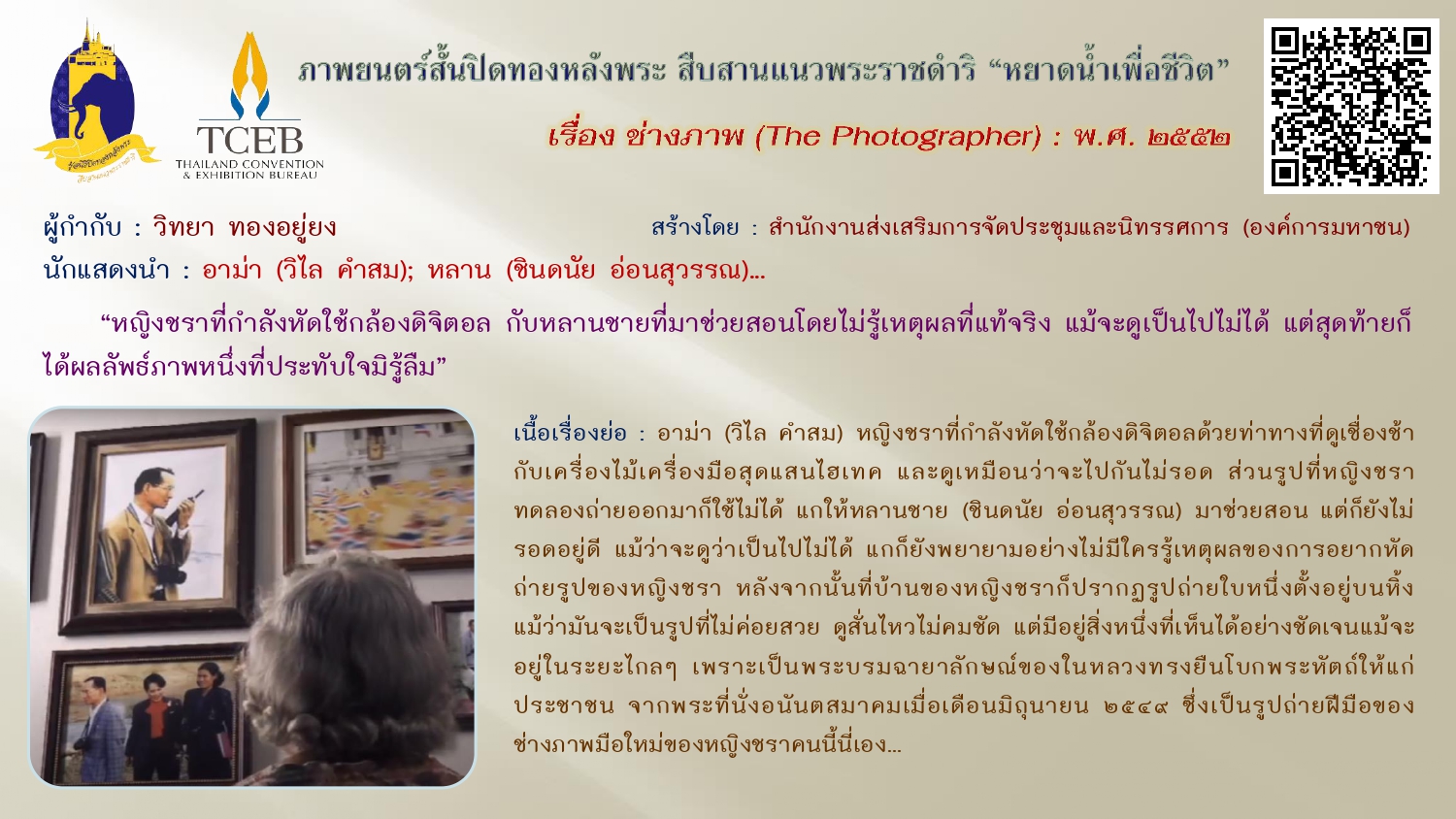 เนื่องในวันคล้ายวันพระบรมราชสมภพของพระบาทสมเด็จพระบรมชนกาธิเบศร มหาภูมิพลอดุลยเดชมหาราช บรมนาถบพิตร วันชาติ และวันพ่อแห่งชาติ ๕ ธันวาคม ๒๕๖๗ ขอเผยแพร่ภาพยนตร์สั้นเฉลิมพระเกียรติฯ “หยาดน้ำเพื่อชีวิต” ในโครงการปิดทองหลังพระสืบสานแนวพระราชดำริ โดยสำนักงานส่งเสริมการจัดประชุมและนิทรรศการ (องค์การมหาชน) จัดสร้างภาพยนตร์สั้นโดยผู้กำกับและศิลปินรุ่นใหม่ สะท้อนความคิดและแรงบันดาลใจเกี่ยวกับแนวพระราชดำริต่างๆ เพื่อเฉลิมฉลองโอกาสที่พระบาทสมเด็จสมเด็จพระเจ้าอยู่หัว ทรงพระราชทานศูนย์ศึกษาแห่งแรกที่เขาหินซ้อนจังหวัดฉะเชิงเทรา ให้ประชาชนครบรอบ ๓๐ ปี เมื่อเดือนสิงหาคม ๒๕๕๒ ทั้งนี้เพื่อเป็นการน้อมรำลึกในพระมหากรุณาธิคุณ