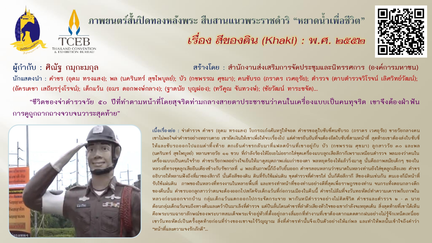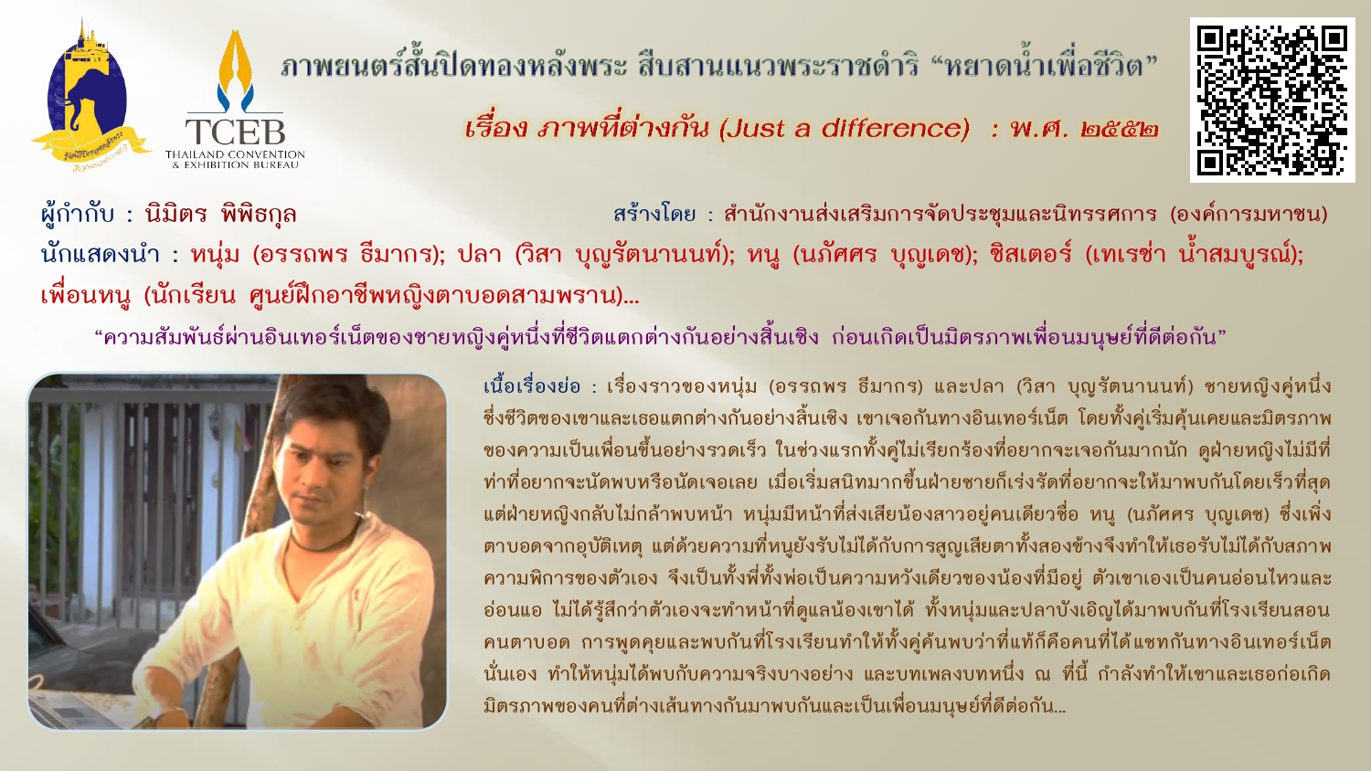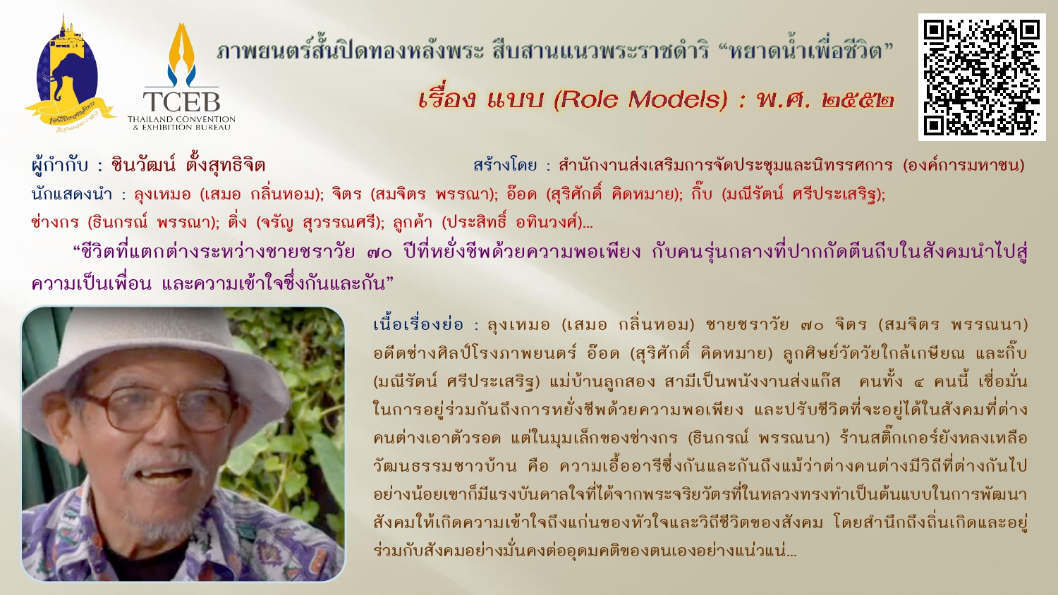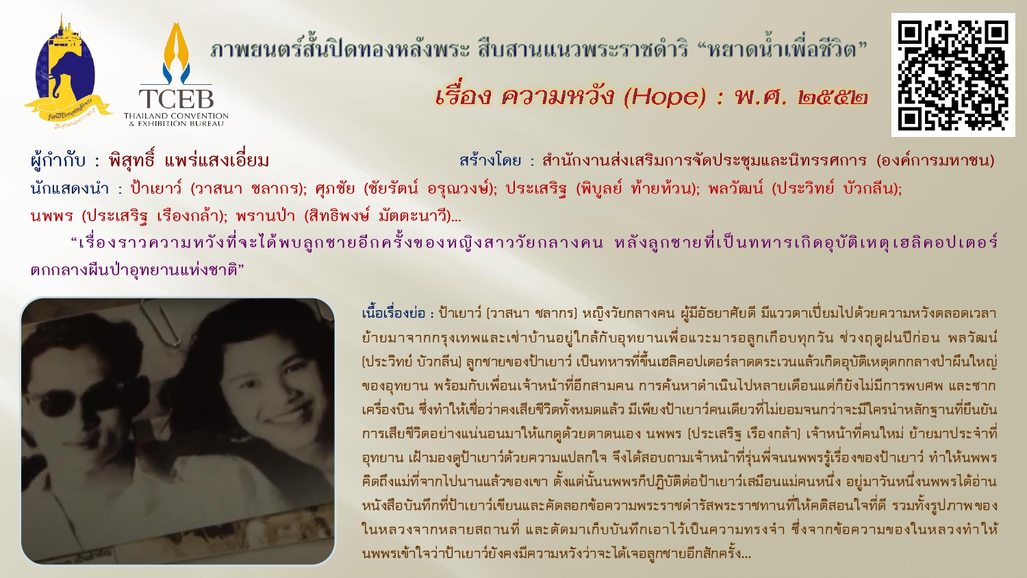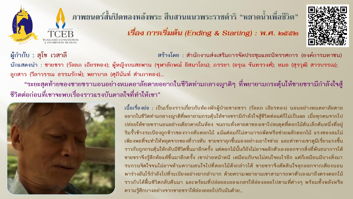 เนื่องในวันคล้ายวันพระบรมราชสมภพของพระบาทสมเด็จพระบรมชนกาธิเบศร มหาภูมิพลอดุลยเดชมหาราช บรมนาถบพิตร วันชาติ และวันพ่อแห่งชาติ ๕ ธันวาคม ๒๕๖๗ ขอเผยแพร่ภาพยนตร์สั้นเฉลิมพระเกียรติฯ “หยาดน้ำเพื่อชีวิต” ในโครงการปิดทองหลังพระสืบสานแนวพระราชดำริ โดยสำนักงานส่งเสริมการจัดประชุมและนิทรรศการ (องค์การมหาชน) จัดสร้างภาพยนตร์สั้นโดยผู้กำกับและศิลปินรุ่นใหม่ สะท้อนความคิดและแรงบันดาลใจเกี่ยวกับแนวพระราชดำริต่างๆ เพื่อเฉลิมฉลองโอกาสที่พระบาทสมเด็จสมเด็จพระเจ้าอยู่หัว ทรงพระราชทานศูนย์ศึกษาแห่งแรกที่เขาหินซ้อนจังหวัดฉะเชิงเทรา ให้ประชาชนครบรอบ ๓๐ ปี เมื่อเดือนสิงหาคม ๒๕๕๒ ทั้งนี้เพื่อเป็นการน้อมรำลึกในพระมหากรุณาธิคุณ