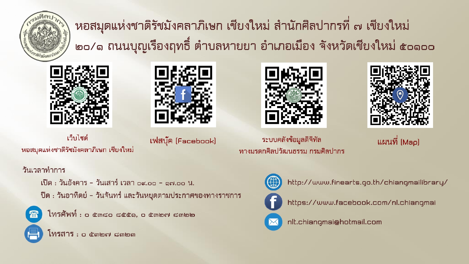 หอสมุดแห่งชาติรัชมังคลาภิเษก เชียงใหม่ สำนักศิลปากรที่ ๗ เชียงใหม่ กรมศิลปากร กระทรวงวัฒนธรรม