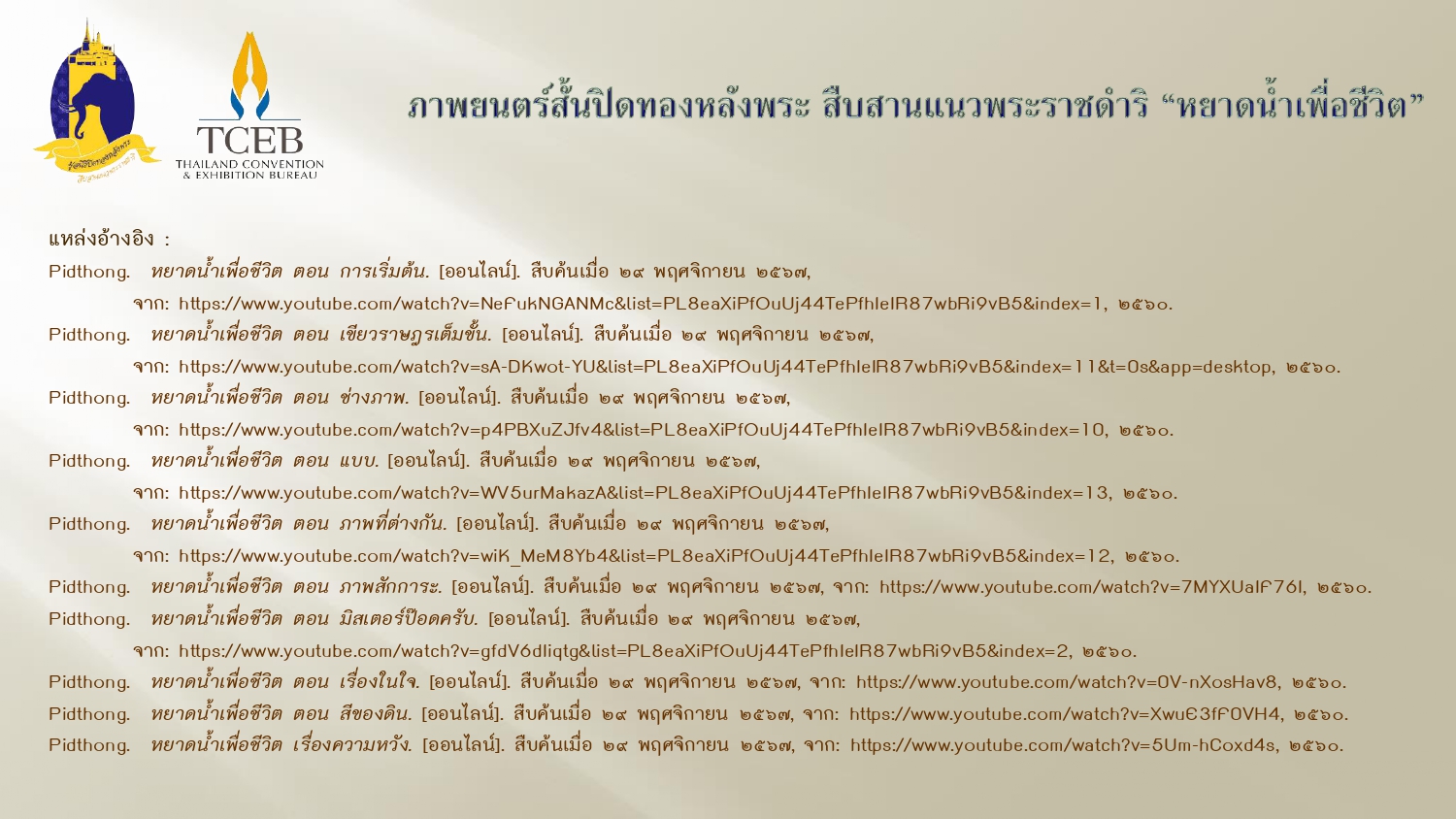 Pidthong. หยาดน้ำเพื่อชีวิต ตอน เรื่องในใจ. [ออนไลน์]. สืบค้นเมื่อ ๒๙ พฤศจิกายน ๒๕๖๗, จาก: https://www.youtube.com/watch?v=0V-nXosHav8, ๒๕๖๐.