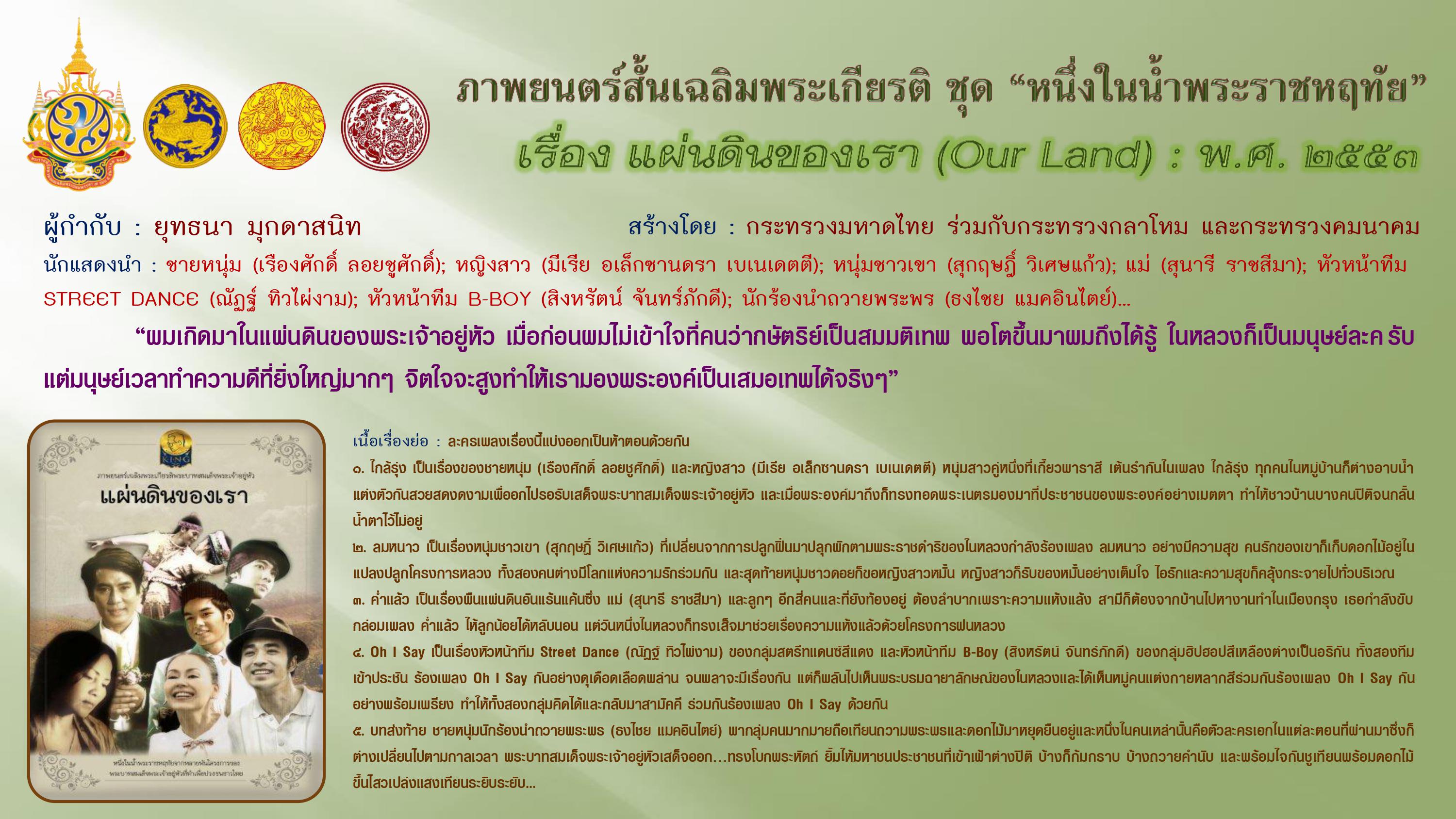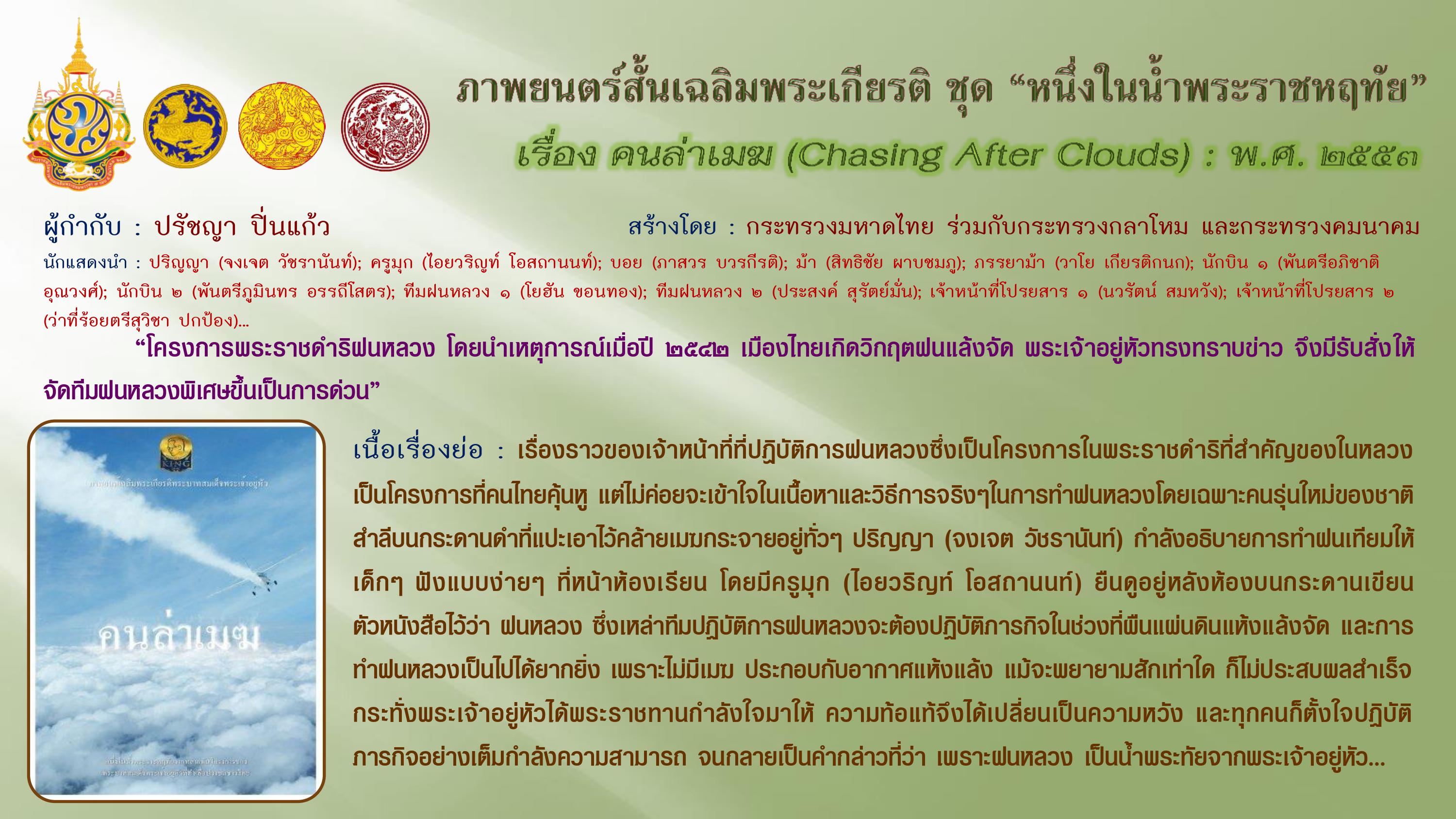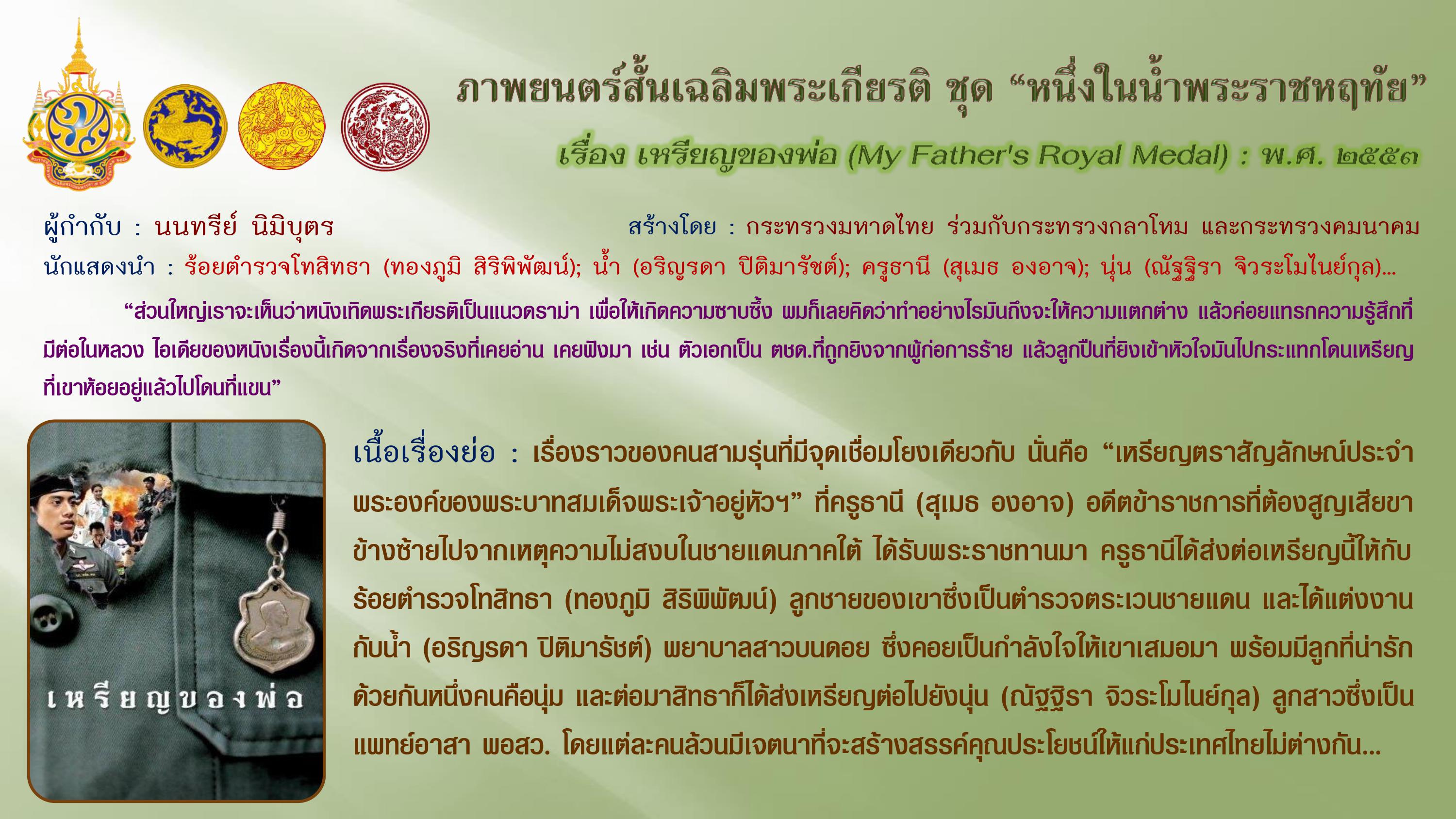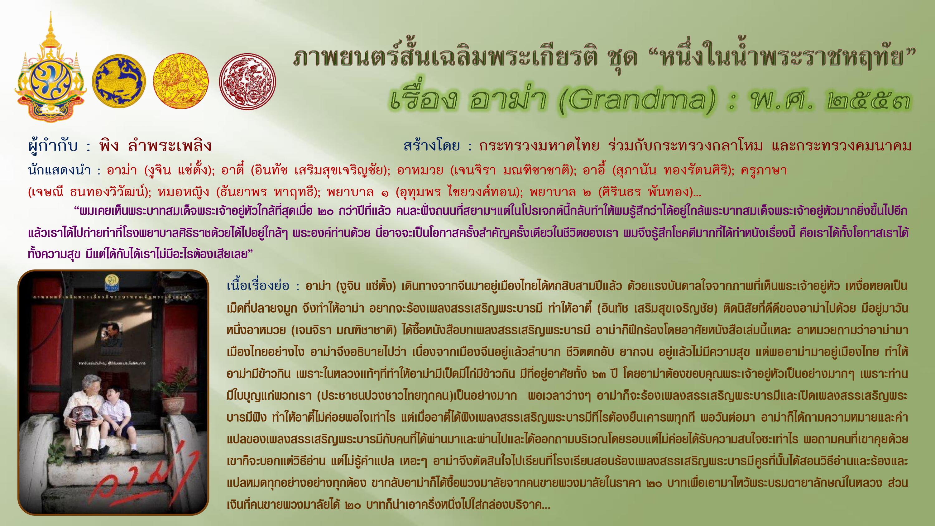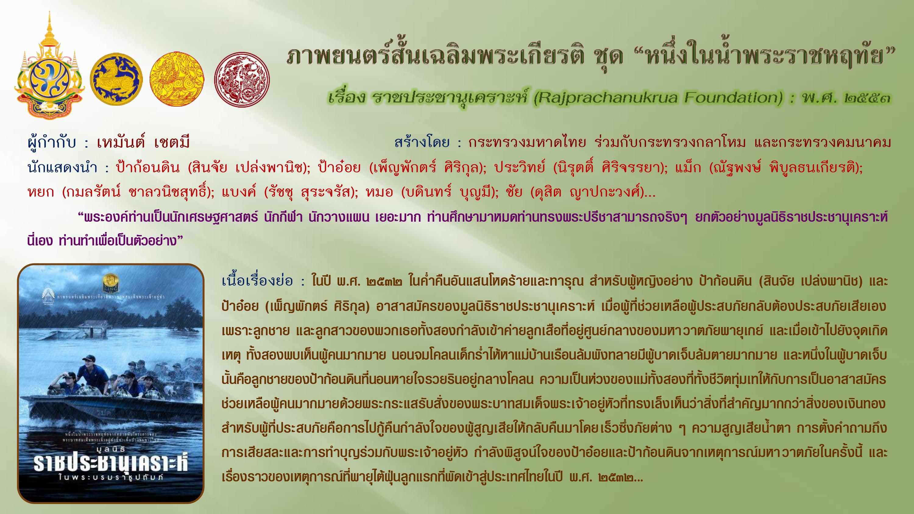 ภาพยนตร์สั้นเฉลิมพระเกียรติ ชุด “หนึ่งในน้ำพระราชหฤทัย” เนื่องในโอกาสมหามงคลเฉลิมพระชนมพรรษา ๘๓ พรรษา ๕ ธันวาคม ๒๕๕๓ และทรงเจริญพระชนมพรรษา ๗ รอบ ในวันที่ ๕ ธันวาคม ๒๕๕๔