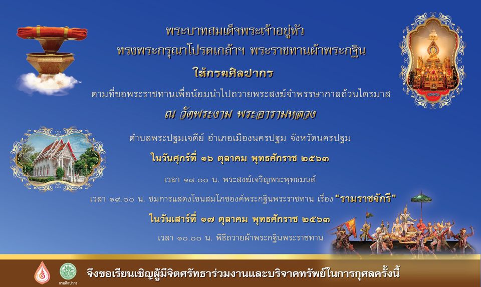 วันเสาร์ที่ ๑๗ ตุลาคม ๒๕๖๓ เวลา ๑๐.๐๐ น. นางวราภรณ์ วสุนธรารัตน์ ผู้อำนวยการหอสมุดแห่งชาติรัชมังคลาภิเษก เชียงใหม่ เข้าร่วมพิธีถวายผ้าพระกฐินพระราชทาน ประจำปี ๒๕๖๓ ณ วัดพระงาม ตำบลพระปฐมเจดีย์ อำเภอเมืองนครปฐม จังหวัดนครปฐม โดยมีนายประทีป เพ็งตะโก อธิบดีกรมศิลปากร เป็นประธานในพิธีฯ มีผู้บริหาร ข้าราชการ และเจ้าหน้าที่กรมศิลปากร ตลอดจนพุทธศาสนิกชนในพื้นที่เข้าร่วมในพิธี