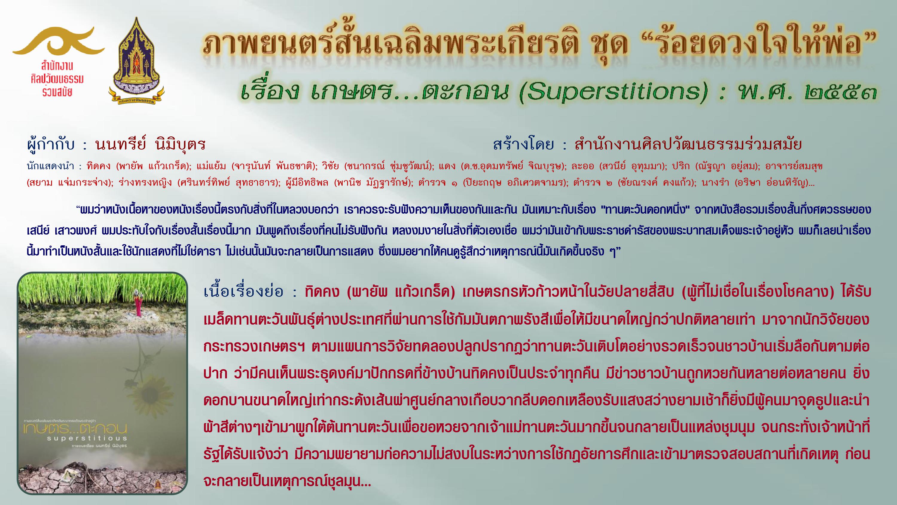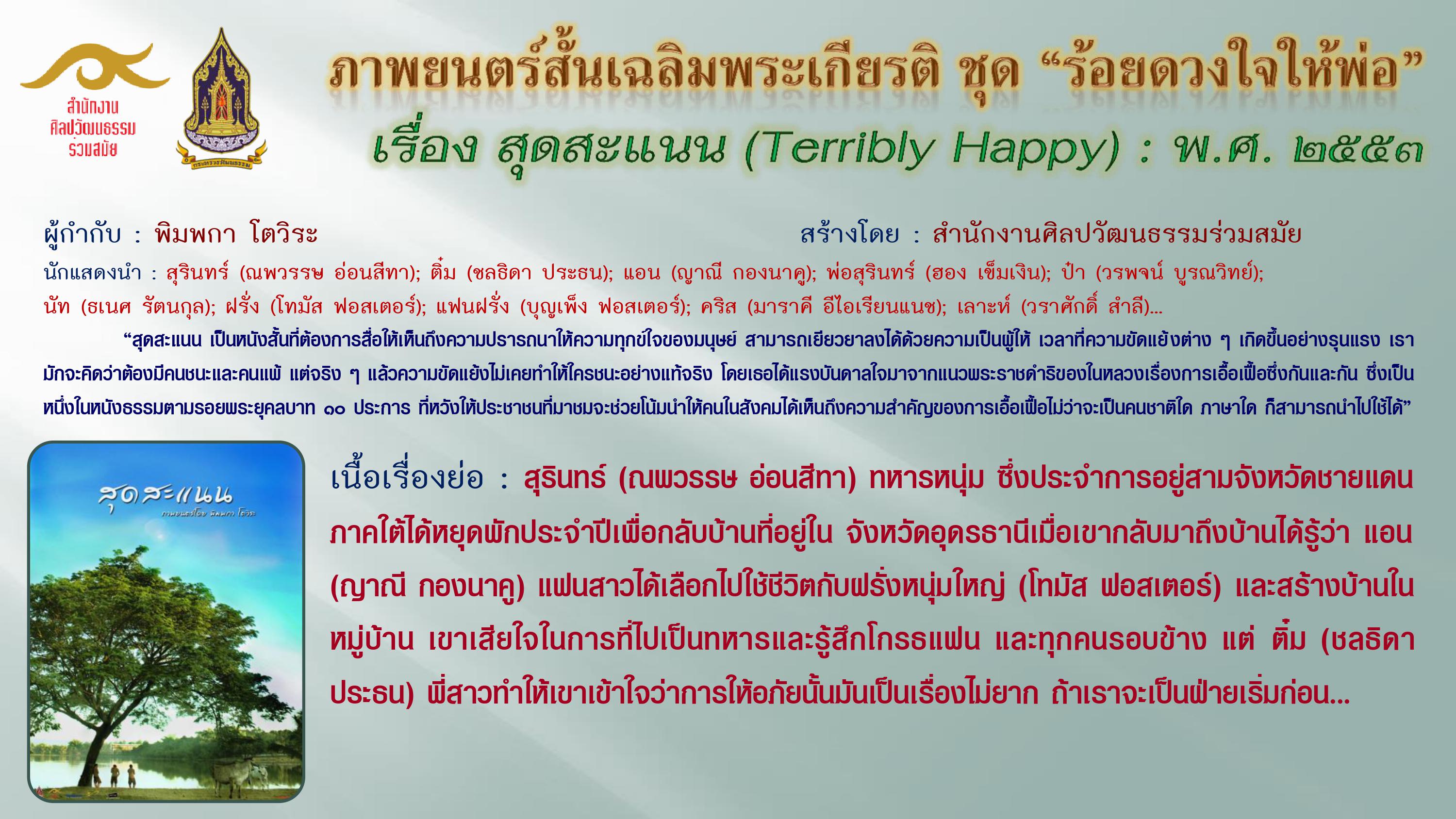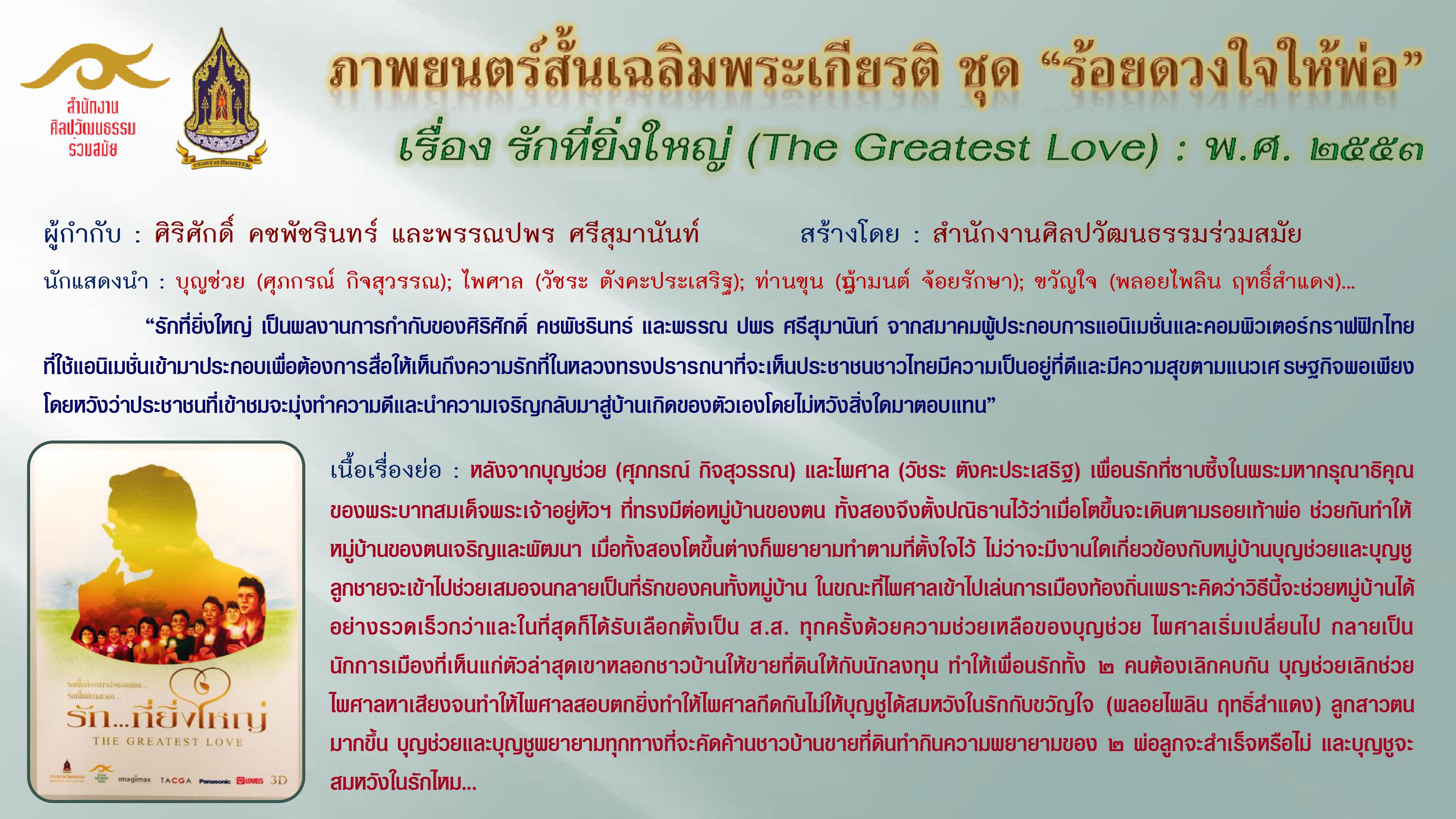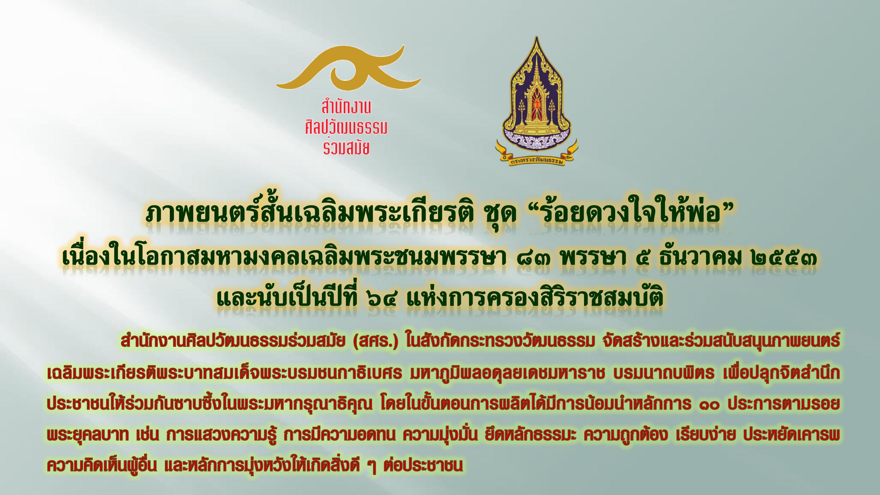 ๓. ภาพยนตร์สั้นเฉลิมพระเกียรติ ชุด “ร้อยดวงใจให้พ่อ” จัดสร้างและร่วมสนับสนุนโดยสำนักงานศิลปวัฒนธรรมร่วมสมัย (สศร.) ในสังกัดกระทรวงวัฒนธรรม เพื่อปลุกจิตสำนึกประชาชนให้ร่วมกันซาบซึ้งในพระมหากรุณาธิคุณ โดยน้อมนำหลักการ ๑๐ ประการตามรอยพระยุคลบาท เช่น การแสวงความรู้ การมีความอดทน ความมุ่งมั่น ยึดหลักธรรมะ ความถูกต้อง เรียบง่าย ประหยัดเคารพความคิดเห็นผู้อื่น และหลักการมุ่งหวังให้เกิดสิ่งดี ๆ ต่อประชาชน