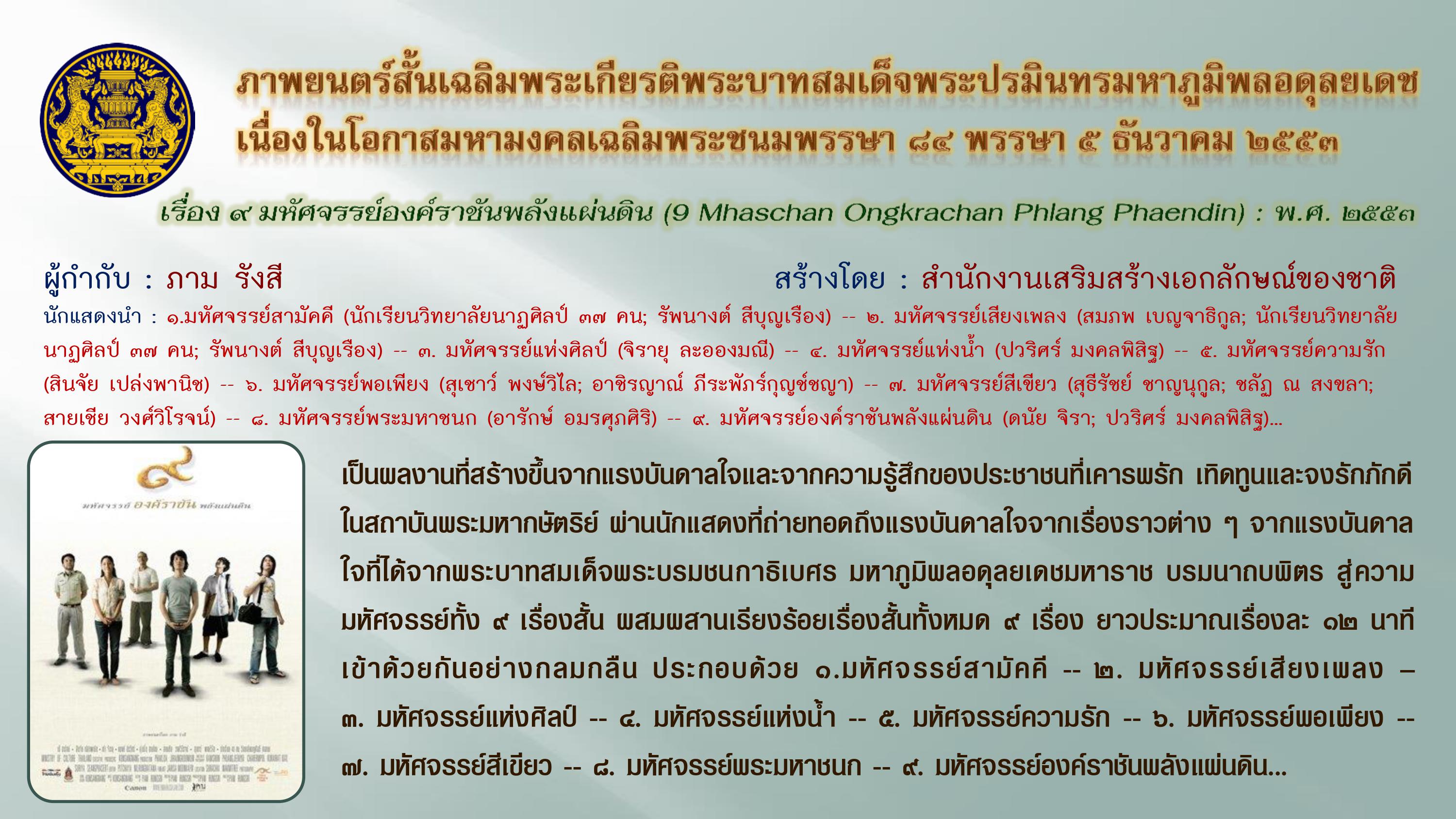 ๑. ภาพยนตร์ ๙ มหัศจรรย์องค์ราชันพลังแผ่นดิน เป็นผลงานที่สร้างขึ้นจากแรงบันดาลใจและจากความรู้สึกของประชาชนที่เคารพรัก เทิดทูนและจงรักภักดีในสถาบันพระมหากษัตริย์ ผ่านนักแสดงที่ถ่ายทอดถึงแรงบันดาลใจจากเรื่องราวต่าง ๆ จากแรงบันดาลใจที่ได้จากพระบาทสมเด็จพระบรมชนกาธิเบศร มหาภูมิพลอดุลยเดชมหาราช บรมนาถบพิตรสู่ความมหัศจรรย์ทั้ง ๙ เรื่องสั้น ผสมผสานเรียงร้อยเรื่องสั้นทั้งหมด ๙ เรื่อง ยาวประมาณเรื่องละ ๑๒ นาที