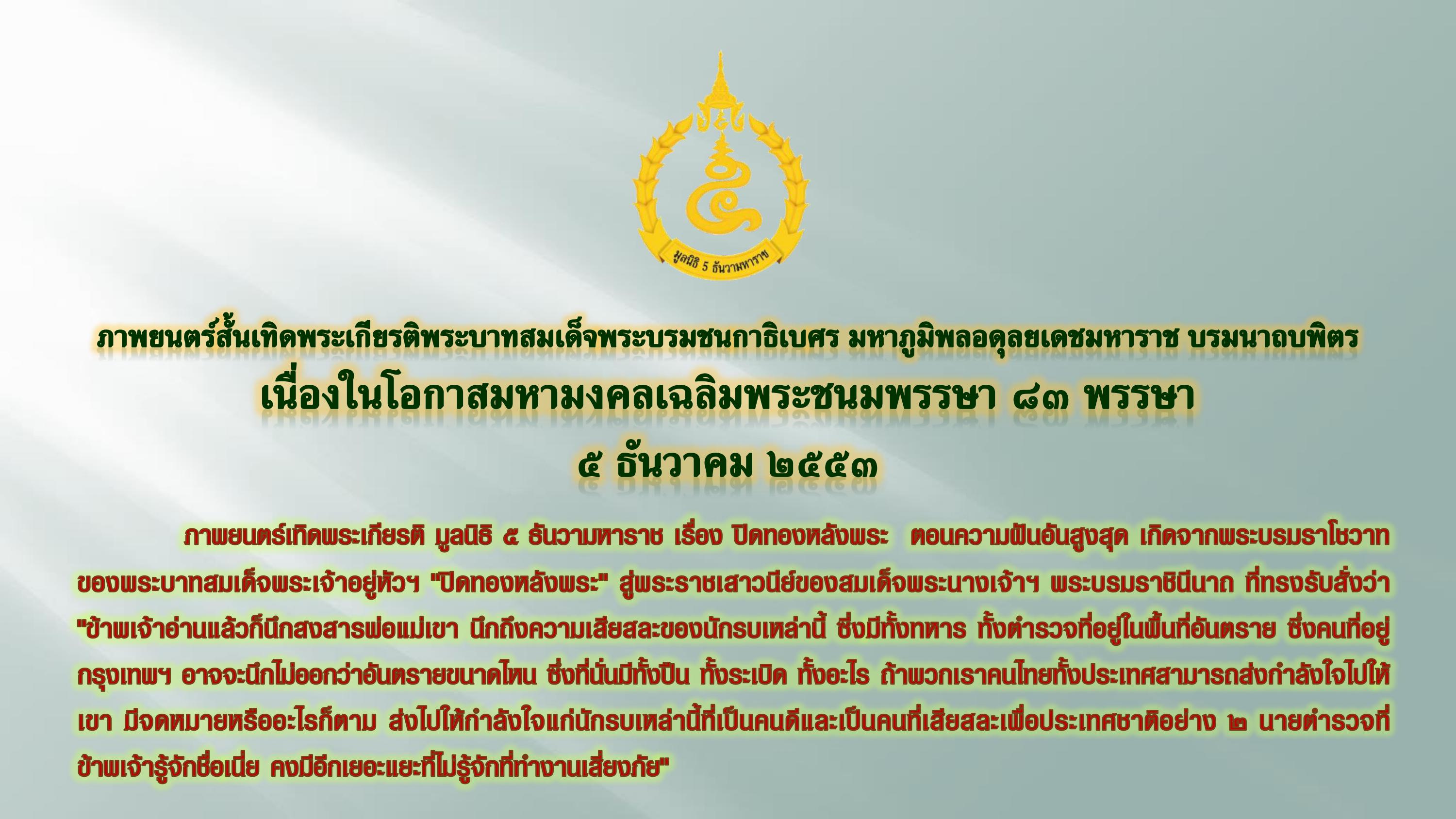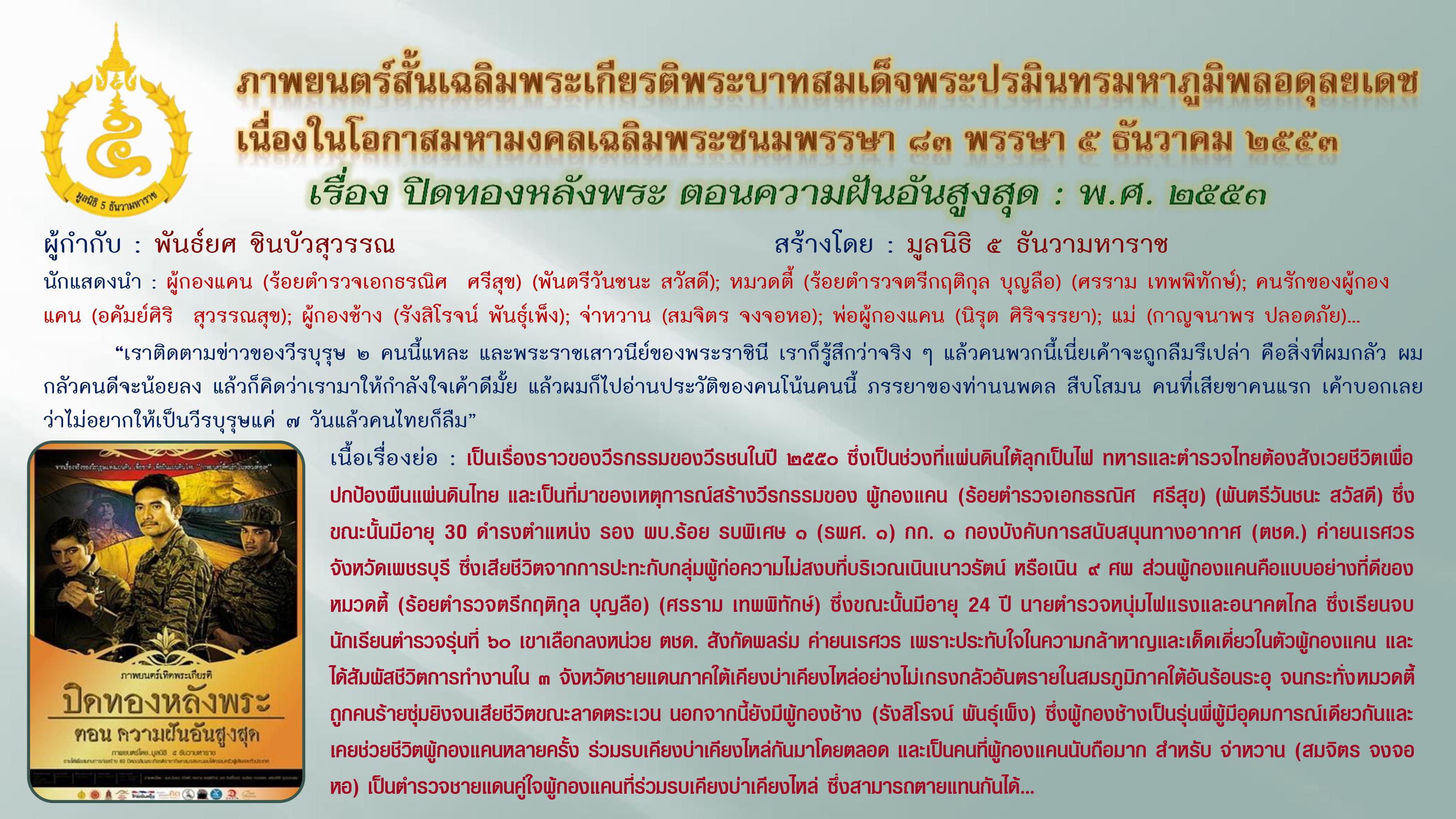 ๒. ภาพยนตร์เทิดพระเกียรติ มูลนิธิ ๕ ธันวามหาราช เรื่อง ปิดทองหลังพระ ตอนความฝันอันสูงสุด เกิดจากพระบรมราโชวาทของพระบาทสมเด็จพระเจ้าอยู่หัวฯ "ปิดทองหลังพระ" สู่พระราชเสาวนีย์ของสมเด็จพระนางเจ้าฯ พระบรมราชินีนาถ ที่ทรงรับสั่งว่า "ข้าพเจ้าอ่านแล้วก็นึกสงสารพ่อแม่เขา นึกถึงความเสียสละของนักรบเหล่านี้ ซี่งมีทั้งทหาร ทั้งตำรวจที่อยู่ในพื้นที่อันตราย ซึ่งคนที่อยู่กรุงเทพฯ อาจจะนึกไม่ออกว่าอันตรายขนาดไหน ซึ่งที่นั่นมีทั้งปืน ทั้งระเบิด ทั้งอะไร ถ้าพวกเราคนไทยทั้งประเทศสามารถส่งกำลังใจไปให้เขา มีจดหมายหรืออะไรก็ตาม ส่งไปให้กำลังใจแก่นักรบเหล่านี้ที่เป็นคนดีและเป็นคนที่เสียสละเพื่อประเทศชาติอย่าง ๒ นายตำรวจที่ข้าพเจ้ารู้จักชื่อเนี่ย คงมีอีกเยอะแยะที่ไม่รู้จักที่ทำงานเสี่ยงภัย"
