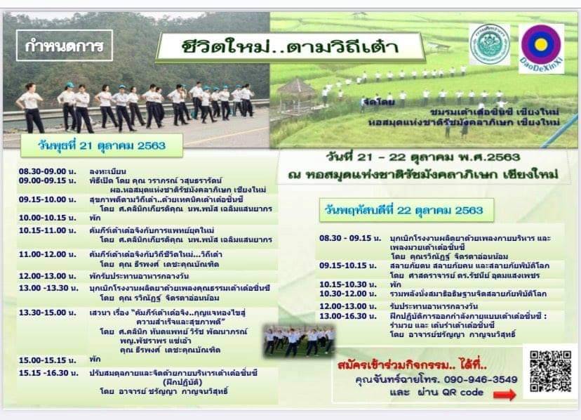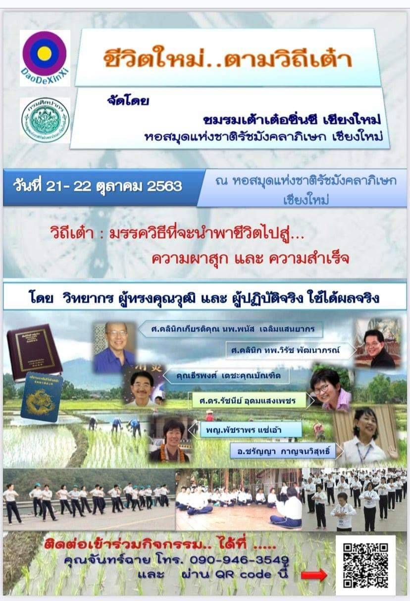 วันที่ ๒๑ - ๒๒ ตุลาคม ๒๕๖๓ เวลา ๐๘.๓๐ - ๑๖.๓๐ น. ชมรมเต้าเต๋อซิ่นซี เชียงใหม่ ร่วมกับหอสมุดแห่งชาติรัชมังคลาภิเษก เชียงใหม่ จัดโครงการอบรมชีวิตใหม่...ตามวิถีเต๋า โดยมีนางสาวสุคนธ์ทิพย์ จันทะลุน บรรณารักษ์ชำนาญการ รักษาราชการแทนผู้อำนวยการหอสมุดแห่งชาติรัชมังคลาภิเษก เชียงใหม่ เป็นประธานในพิธีเปิด ซึ่งโครงการดังกล่าวมีการฝึกปฏิบัติการออกกำลังกายแบบเทคนิคเต้าเต๋อซิ่นซี ทำการสอนโดยอาจารย์จากศูนย์ฝึกปฏิบัติเทคนิคเต้าเต๋อซิ่นซีสากลโดยตรง ณ ห้องประชุม หอสมุดแห่งชาติรัชมังคลาภิเษก เชียงใหม่