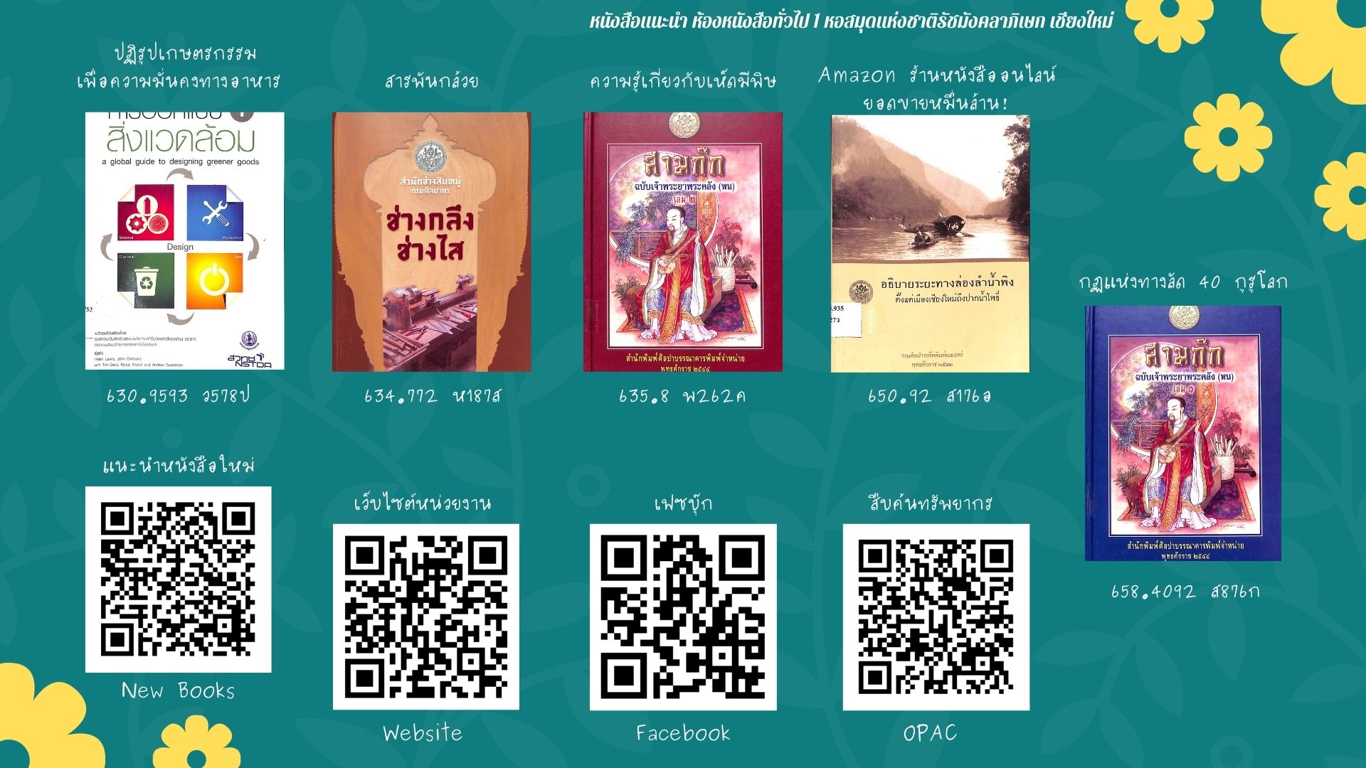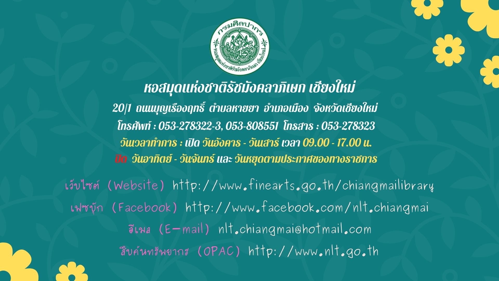 หอสมุดแห่งชาติรัชมังคลาภิเษก เชียงใหม่ ขอแนะนำหนังสือใหม่ประจำเดือน ตุลาคม ๒๕๖๓ ที่จัดให้บริการ ณ ห้องหนังสือทั่วไป ๑ ทั้งหนังสือทั่วไปและหนังสือที่จัดพิมพ์โดยกรมศิลปากรที่น่าสนใจ จำนวน ๕๙ รายการ โดยผู้ใช้บริการสามารถเข้าชมหนังสือแนะนำประจำเดือน พร้อมรายละเอียดได้ที่ หนังสือแนะนำ และเข้าชมรายการหนังสือใหม่ประจำเดือนได้ที่ ข่าวประชาสัมพันธ์ หรือ เฟซบุ๊ก (Facebook) หอสมุดแห่งชาติรัชมังคลาภิเษก เชียงใหม่ นอกจากนี้ยังสามารถสืบค้นข้อมูลทรัพยากรสารสนเทศของทางหน่วยงานได้ที่ บริการสืบค้นข้อมูล โดยผู้ที่สนใจสามารถเข้าใช้บริการหนังสือใหม่ตัวเล่มจริงได้ที่ ห้องหนังสือทั่วไป ๑ ตั้งแต่บัดนี้เป็นต้นไป ตามวันเวลาทำการปกติของหน่วยงาน >> เปิด : วันอังคาร - วันเสาร์ เวลา ๐๙.๐๐ - ๑๗.๐๐ น. ปิด : วันอาทิตย์ - วันจันทร์ และวันหยุดตามประกาศของทางราชการ สอบถามข้อมูลเพิ่มเติมได้ที่ ๐๕๓ - ๘๐๘๕๕๑ ต่อ ๑๙ หรือทาง เฟซบุ๊ก (Facebook) หอสมุดแห่งชาติรัชมังคลาภิเษก เชียงใหม่ หรือ ทางอีเมล (E-mail) : nlt.chiangmai.hotmail.com