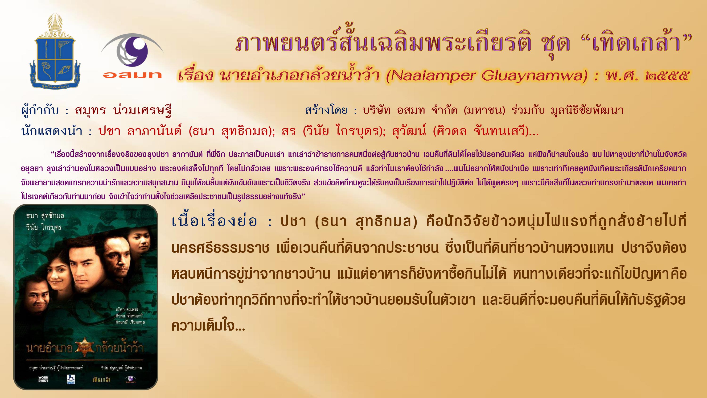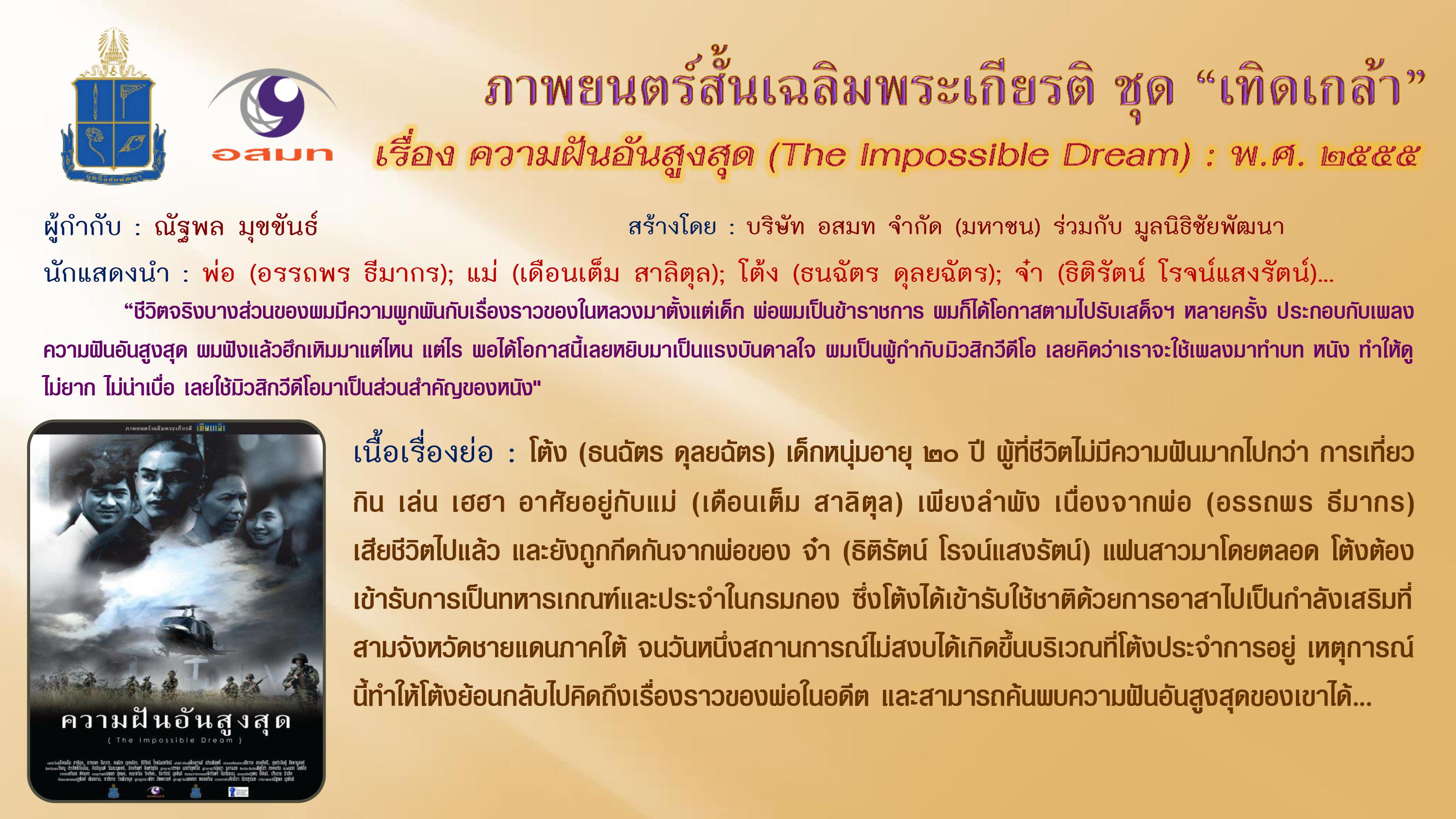 บริษัท อสมท จำกัด (มหาชน) ร่วมกับ มูลนิธิชัยพัฒนา จัดทำขึ้นด้วยการสร้างภาพยนตร์ ๙ เรื่อง สุดยิ่งใหญ่ที่คนไทยต้องดู โดยได้น้อมนำพระราชดำริของ พระบาทสมเด็จพระบรมชนกาธิเบศร มหาภูมิพลอดุลยเดชมหาราช บรมนาถบพิตร มาถ่ายทอดเป็นเรื่องราวประทับใจบนแผ่นฟิล์ม เพื่อเป็นการเฉลิมพระเกียรติ เนื่องในโอกาสปีมหามงคลที่พระองค์ทรงเจริญพระชนมพรรษา ๘๕ พรรษา ๕ ธันวาคม ๒๕๕๕