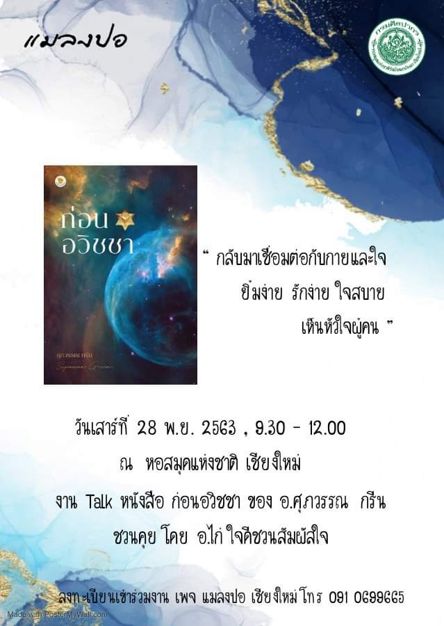 เพจแมลงปอ เชียงใหม่ ร่วมกับหอสมุดแห่งชาติรัชมังคลาภิเษกเชียงใหม่ และเพจห้องยกใจ ร่วมจัดงาน Talk หนังสือ ก่อนอวิชชา ของอาจารย์ศุภวรรณ กรีน ชวนคุย