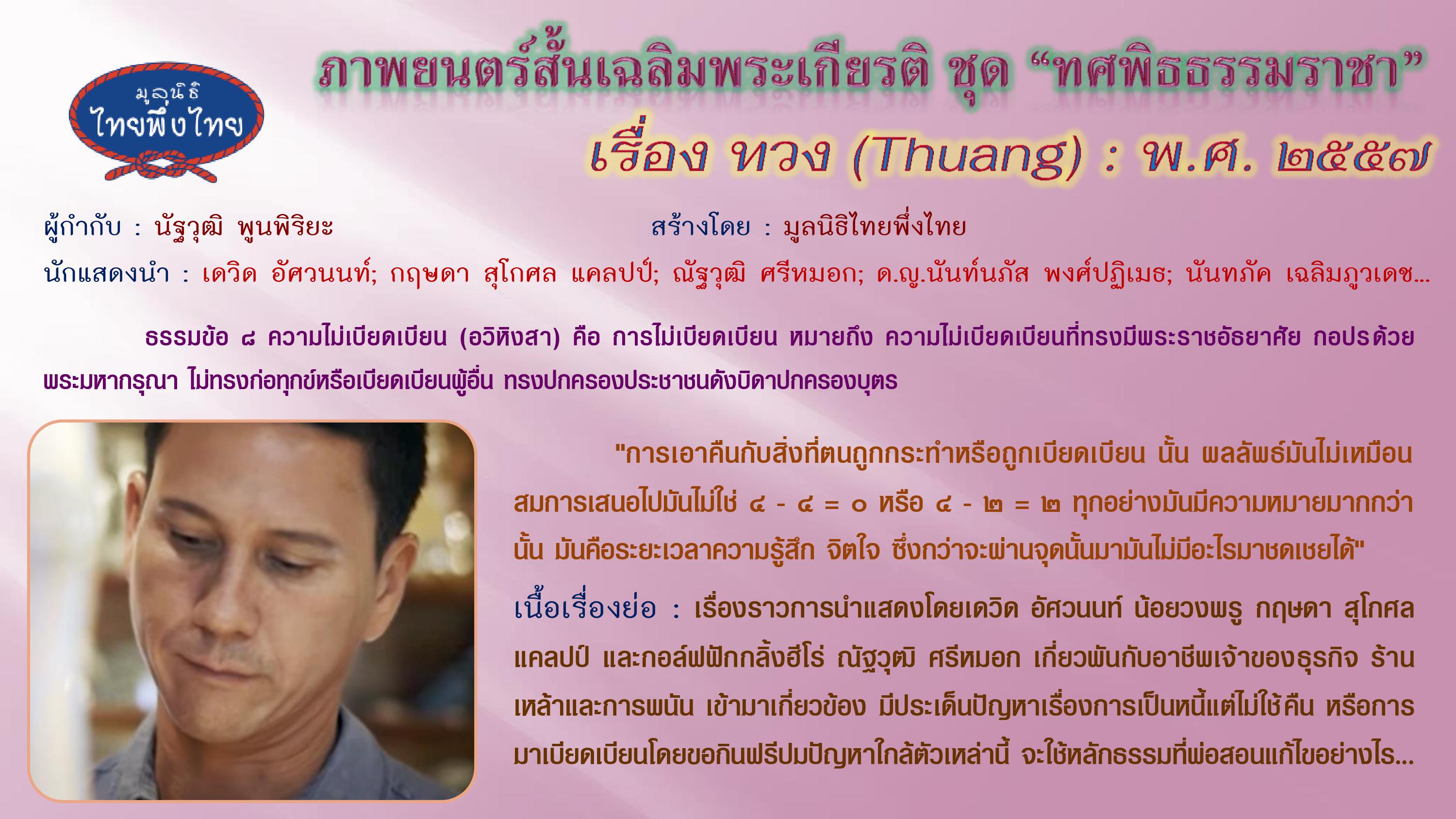 ภาพยนตร์สั้นเฉลิมพระเกียรติ ชุด “ทศพิธธรรมราชา” เนื่องในโอกาสพระราชพิธีเฉลิมพระชนมพรรษา ๕ ธันวาคม ๒๕๕๗ และในโอกาสฉลองสิริราชสมบัติ ๖๘ ปี โดยมูลนิธิไทยพึ่งไทย ได้จัดทำโครงการ “ทศพิธธรรมราชา” เนื่องในโอกาสพระราชพิธีเฉลิมพระชนมพรรษา ๕ ธันวาคม ๒๕๕๗ และในโอกาสฉลองสิริราชสมบัติ ๖๘ ปี โดยมีการผลิตภาพยนตร์สั้นเฉลิมพระเกียรติ “ทศพิธธรรมราชา” ด้วยการน้อมนำหลักทศพิธราชธรรม ๑๐ ประการ มาเป็นแนวทางในการรณรงค์ปลูกฝังคุณธรรมจริยธรรมของคนไทย เพื่อให้ประชาชนชาวไทยได้ดำเนินตามรอยเบื้องพระยุคลบาท