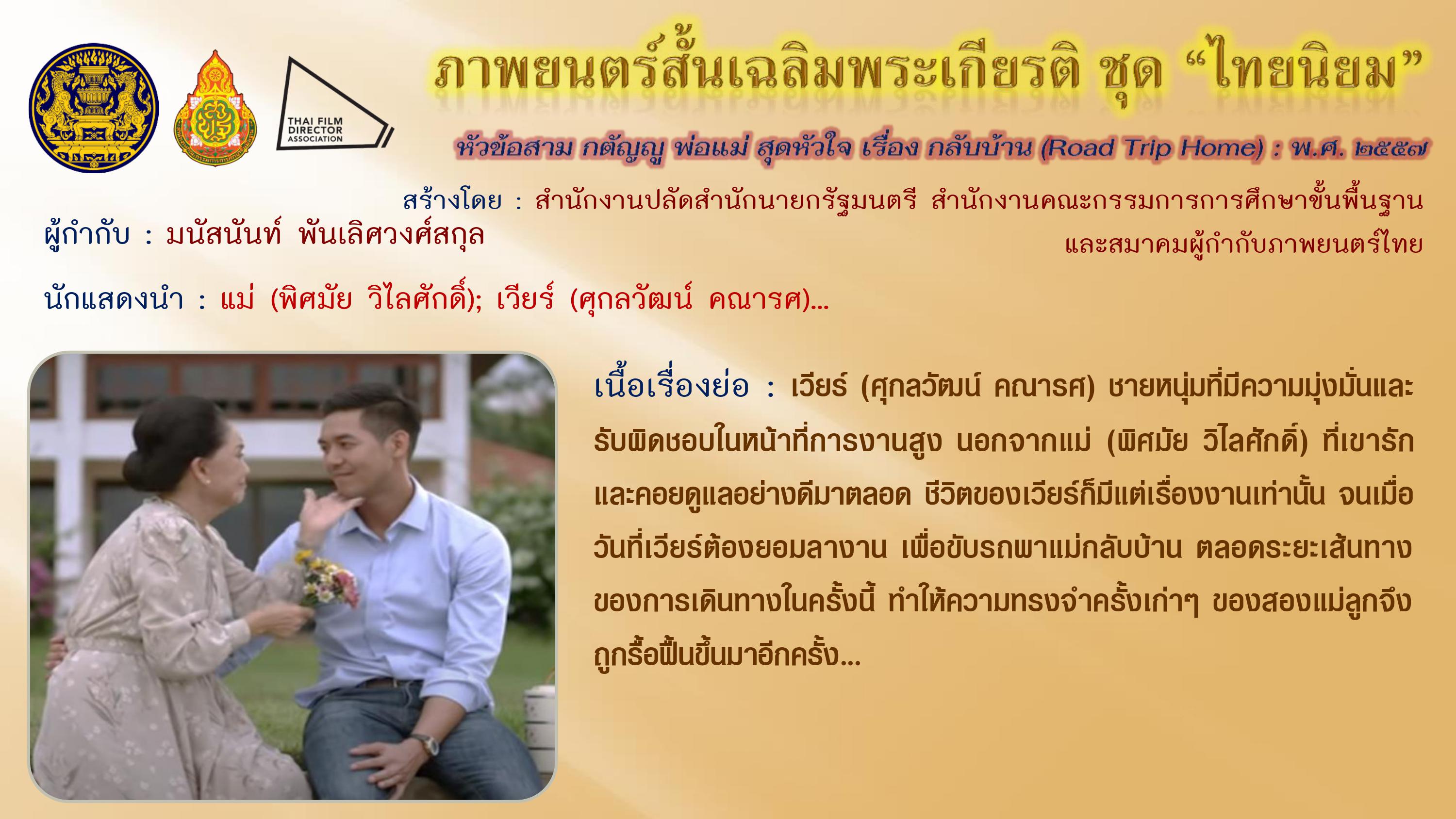 โครงการภาพยนตร์สั้น "ไทยนิยม" ที่ สำนักงานปลัดสำนักนายกรัฐมนตรี สำนักงานคณะกรรมการการศึกษาขั้นพื้นฐาน และสมาคมผู้กำกับภาพยนตร์ไทยร่วมกันจัดภาพยนตร์ขึ้นเพื่อเฉลิมพระเกียรติพระบาทสมเด็จพระเจ้าอยู่หัว เนื่องในโอกาสมหามงคลเฉลิมพระชนมพรรษา ๘๗ พรรษา โดยโครงการดังกล่าวเป็นการนำค่านิยมหลักทั้ง ๑๒ ประการ เป็นผลงานภาพยนตร์สั้น ๑๒ เรื่อง ที่มีเนื้อหา การนำเสนอที่แตกต่างกัน แต่อยู่บนพื้นฐานของการส่งเสริม ปลูกฝังเด็กและเยาวชน ตลอดจนประชาชนคนไทย ให้ยึดมั่นในศีลธรรมความดี และนำไปประพฤติปฏิบัติเพื่อประโยชน์สุขของประเทศ