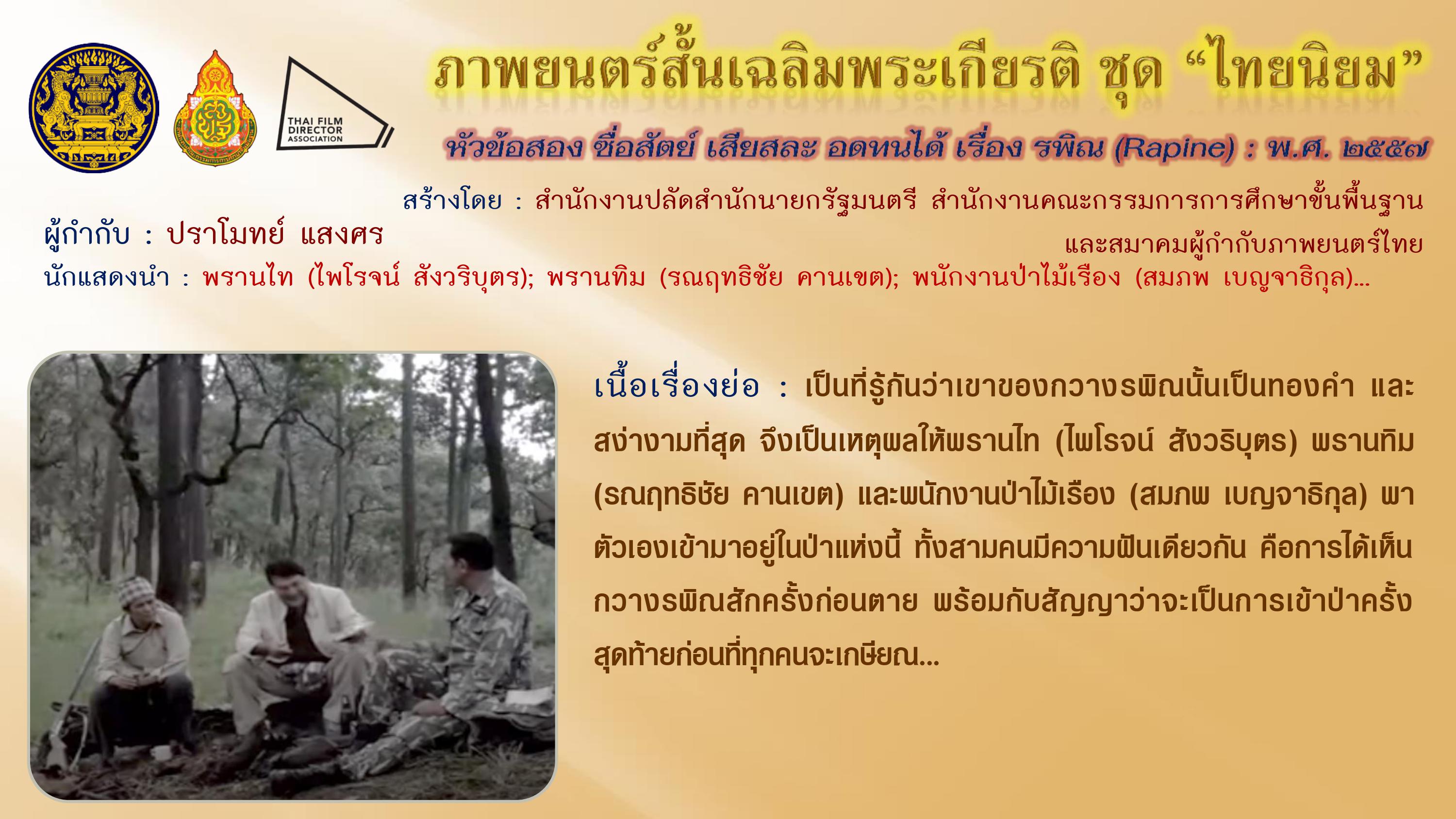 ภาพยนตร์สั้นเฉลิมพระเกียรติ ชุด “ไทยนิยม” เนื่องในโอกาสมหามงคลเฉลิมพระชนมพรรษา ๘๗ พรรษา ๕ ธันวาคม ๒๕๕๗