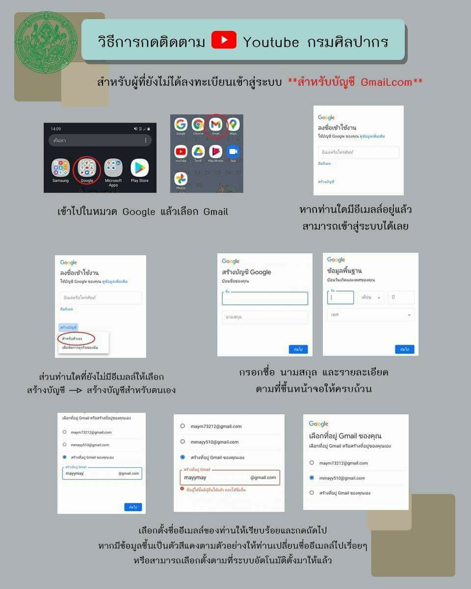 ช่องทางสื่อออนไลน์ของกรมศิลปากร สามารถกดติดตามเพื่อรับชมวีดิทัศน์ องค์ความรู้ และงานมรดกศิลปวัฒนธรรมของกรมศิลปากรได้ ตามขั้นตอนดังภาพ