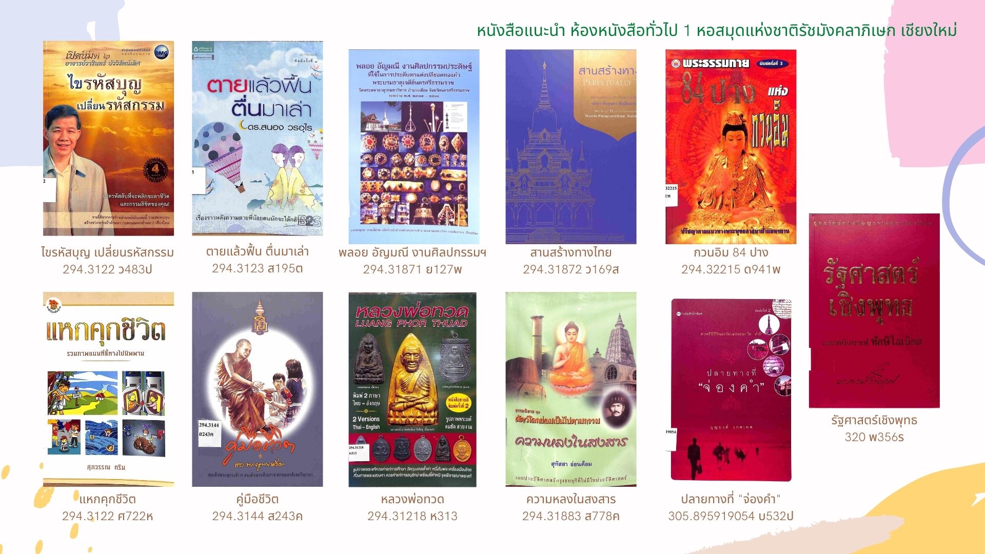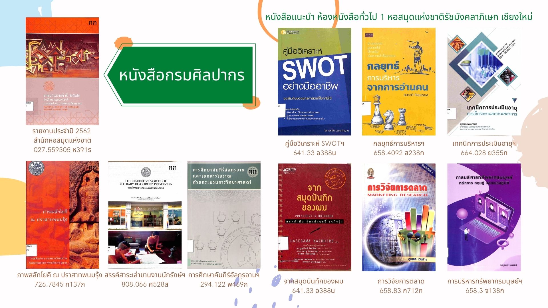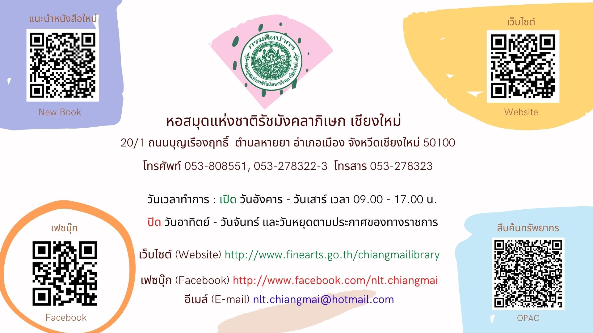 หอสมุดแห่งชาติรัชมังคลาภิเษก เชียงใหม่ ขอแนะนำหนังสือใหม่ประจำเดือน กุมภาพันธ์ ๒๕๖๔ ที่จัดให้บริการ ณ ห้องหนังสือทั่วไป ๑ ทั้งหนังสือทั่วไปและหนังสือที่จัดพิมพ์โดยกรมศิลปากรที่น่าสนใจ จำนวน ๘๕ รายการ โดยผู้ใช้บริการสามารถเข้าชมหนังสือแนะนำประจำเดือน พร้อมรายละเอียดได้ที่ หนังสือแนะนำ และเข้าชมรายการหนังสือใหม่ประจำเดือนได้ที่ ข่าวประชาสัมพันธ์ หรือ เฟซบุ๊ก (Facebook) หอสมุดแห่งชาติรัชมังคลาภิเษก เชียงใหม่ นอกจากนี้ยังสามารถสืบค้นข้อมูลทรัพยากรสารสนเทศของทางหน่วยงานได้ที่ บริการสืบค้นข้อมูลทรัพยากร โดยผู้ที่สนใจสามารถเข้าใช้บริการหนังสือใหม่ตัวเล่มจริงได้ที่ ห้องหนังสือทั่วไป ๑ ตามวันเวลาทำการปกติของหน่วยงาน >> เปิด : วันอังคาร-วันเสาร์ เวลา ๐๙.๐๐-๑๗.๐๐ น. ปิด : วันอาทิตย์ - วันจันทร์ และวันหยุดตามประกาศของทางราชการ สอบถามข้อมูลเพิ่มเติมได้ที่ ๐๕๓ - ๘๐๘๕๕๑ ต่อ ๑๙ หรือทาง เฟซบุ๊ก (Facebook) หอสมุดแห่งชาติรัชมังคลาภิเษก เชียงใหม่ หรือ ทางอีเมล (E-mail) : nlt.chiangmai.hotmail.com