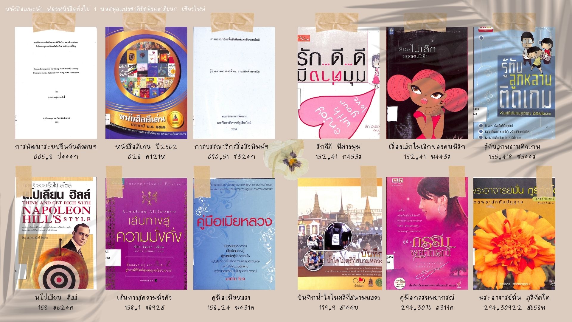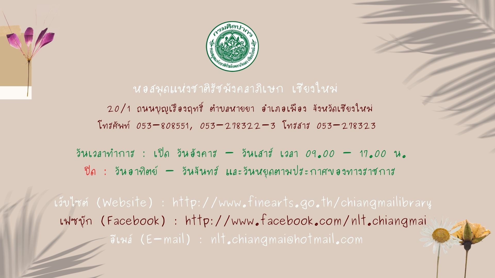 หอสมุดแห่งชาติรัชมังคลาภิเษก เชียงใหม่ ขอแนะนำหนังสือใหม่ประจำเดือน มีนาคม ๒๕๖๔ ที่จัดให้บริการ ณ ห้องหนังสือทั่วไป ๑ ทั้งหนังสือทั่วไปและหนังสือที่จัดพิมพ์โดยกรมศิลปากรที่น่าสนใจ จำนวน ๘๖ รายการ โดยผู้ใช้บริการสามารถเข้าชมหนังสือแนะนำประจำเดือน พร้อมรายละเอียดได้ที่ หนังสือแนะนำ และเข้าชมรายการหนังสือใหม่ประจำเดือนได้ที่ ข่าวประชาสัมพันธ์ หรือ เฟซบุ๊ก (Facebook) หอสมุดแห่งชาติรัชมังคลาภิเษก เชียงใหม่ นอกจากนี้ยังสามารถสืบค้นข้อมูลทรัพยากรสารสนเทศของทางหน่วยงานได้ที่ บริการสืบค้นข้อมูลทรัพยากร โดยผู้ที่สนใจสามารถเข้าใช้บริการหนังสือใหม่ตัวเล่มจริงได้ที่ ห้องหนังสือทั่วไป ๑ ตามวันเวลาทำการปกติของหน่วยงาน >> เปิด : วันอังคาร-วันเสาร์ เวลา ๐๙.๐๐-๑๗.๐๐ น. ปิด : วันอาทิตย์ - วันจันทร์ และวันหยุดตามประกาศของทางราชการ สอบถามข้อมูลเพิ่มเติมได้ที่ ๐๕๓ - ๘๐๘๕๕๑ ต่อ ๑๙ หรือทาง เฟซบุ๊ก (Facebook) หอสมุดแห่งชาติรัชมังคลาภิเษก เชียงใหม่ หรือ ทางอีเมล (E-mail) : nlt.chiangmai.hotmail.com