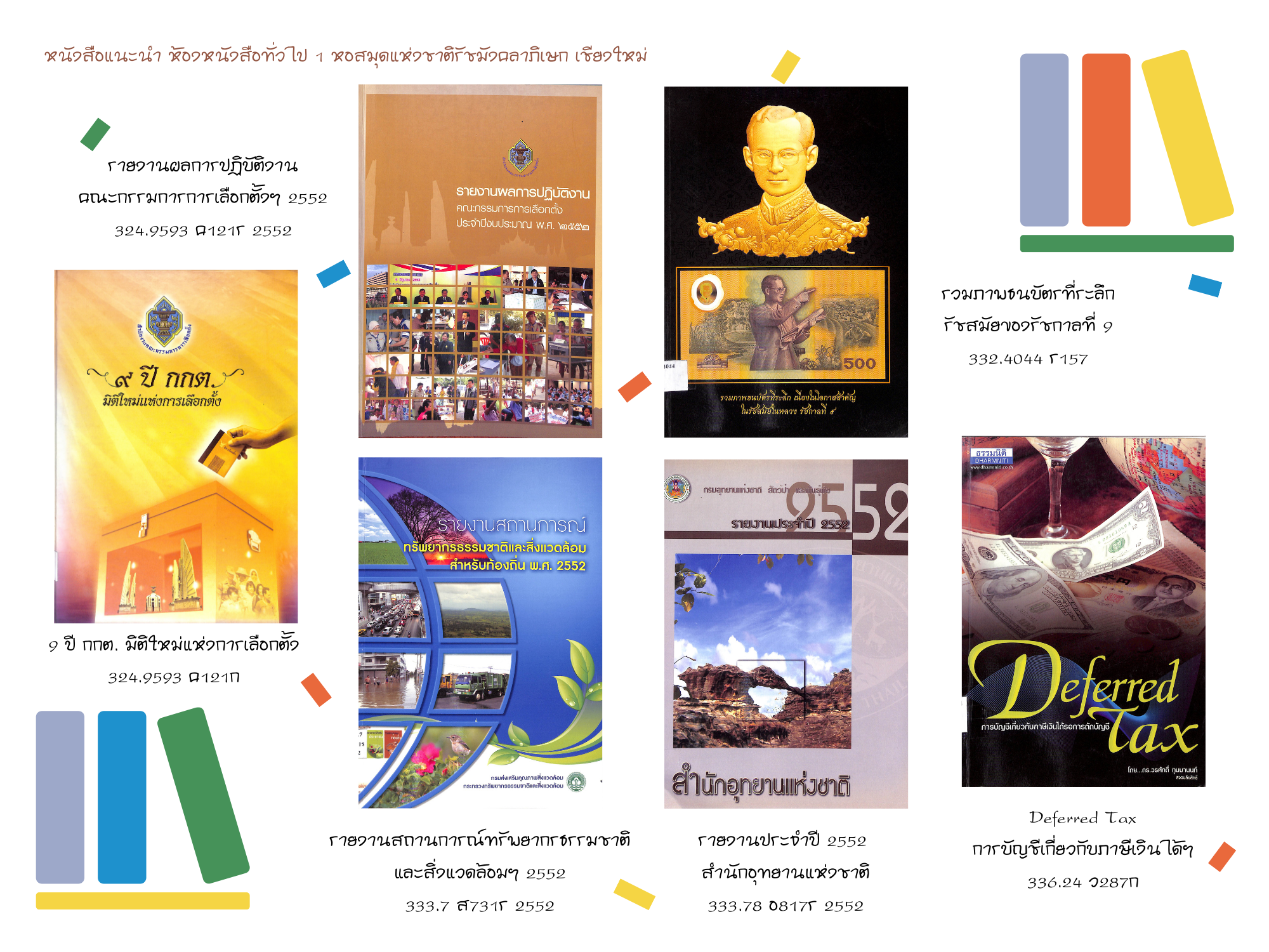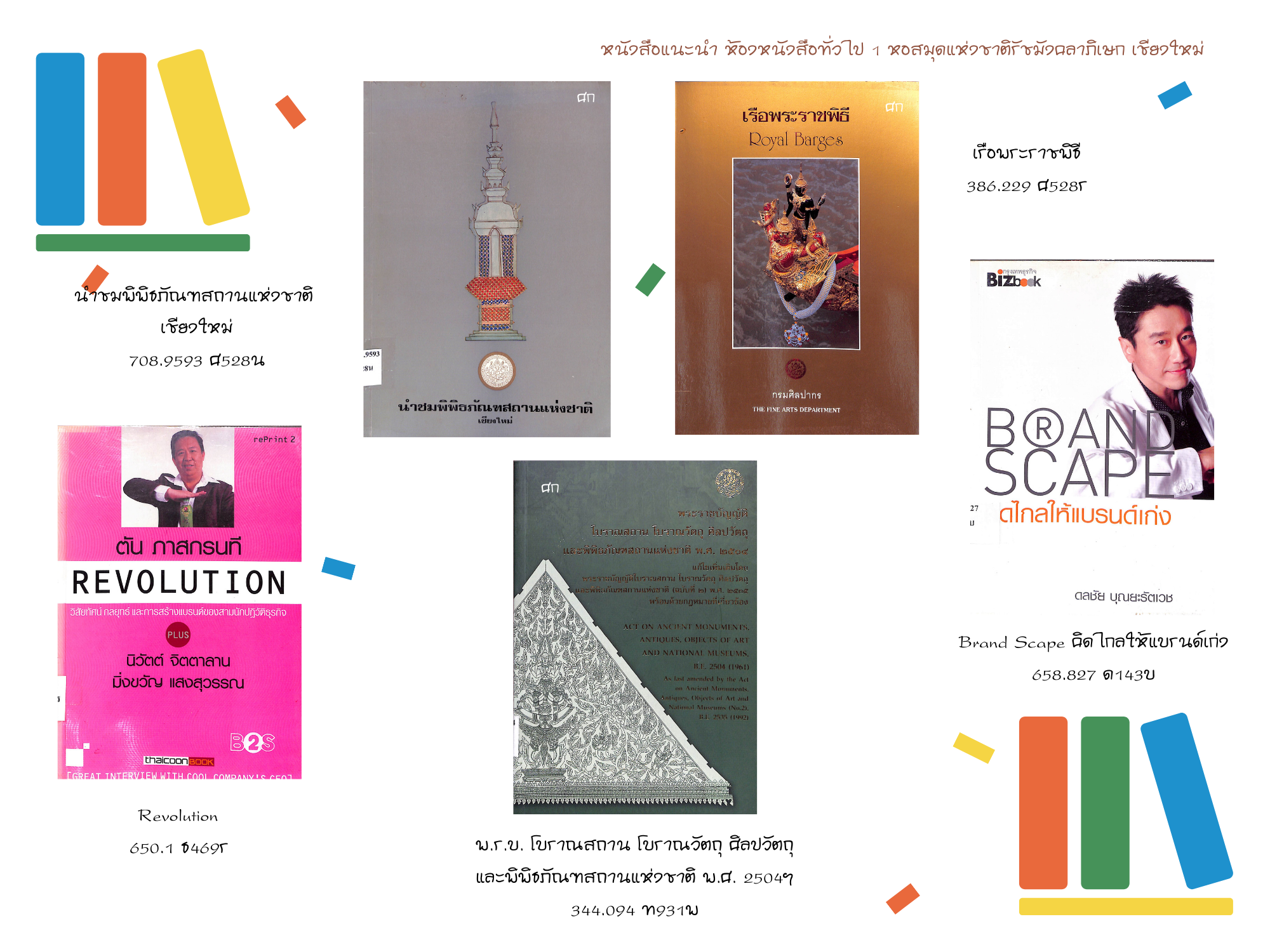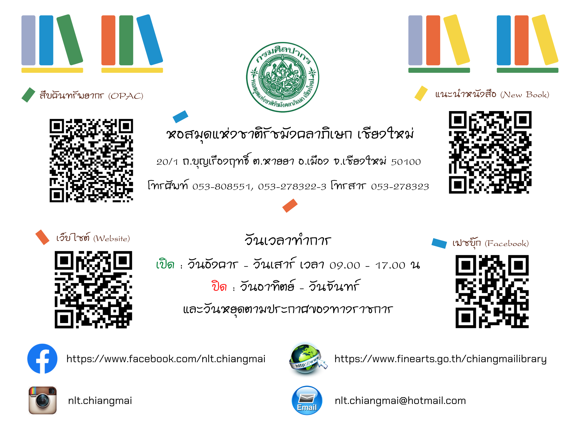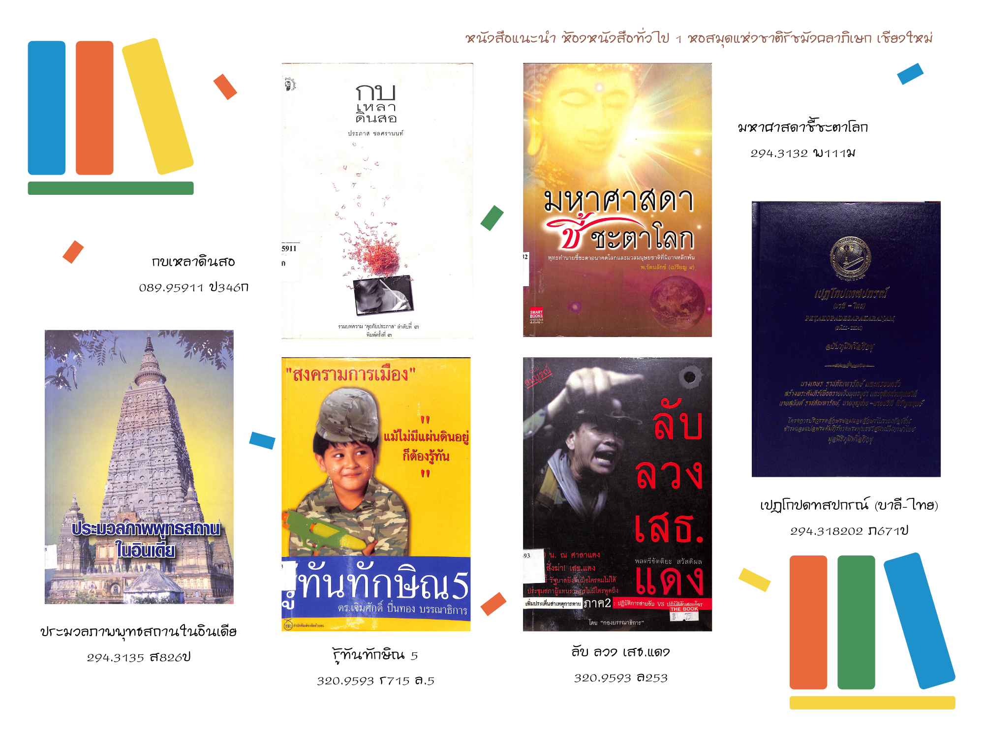 หอสมุดแห่งชาติรัชมังคลาภิเษก เชียงใหม่ ขอแนะนำหนังสือใหม่ ประจำเดือนเมษายน ๒๕๖๔ ที่จัดให้บริการ ณ ห้องหนังสือทั่วไป ๑ ทั้งหนังสือทั่วไปและหนังสือที่จัดพิมพ์โดยกรมศิลปากรที่น่าสนใจ จำนวน ๕๓ รายการ โดยผู้ใช้บริการสามารถเข้าชมหนังสือแนะนำประจำเดือน พร้อมรายละเอียดได้ที่ หนังสือแนะนำ และเข้าชมรายการหนังสือใหม่ประจำเดือนได้ที่ ข่าวประชาสัมพันธ์ หรือ เฟซบุ๊ก (Facebook) หอสมุดแห่งชาติรัชมังคลาภิเษก เชียงใหม่ นอกจากนี้ยังสามารถสืบค้นข้อมูลทรัพยากรสารสนเทศของทางหน่วยงานได้ที่ บริการสืบค้นข้อมูลทรัพยากร โดยผู้ที่สนใจสามารถเข้าใช้บริการหนังสือใหม่ตัวเล่มจริงได้ที่ ห้องหนังสือทั่วไป ๑ ตามวันเวลาทำการปกติของหน่วยงาน >> เปิด : วันอังคาร-วันเสาร์ เวลา ๐๙.๐๐-๑๗.๐๐ น. ปิด : วันอาทิตย์ - วันจันทร์ และวันหยุดตามประกาศของทางราชการ สอบถามข้อมูลเพิ่มเติมได้ที่ ๐๕๓ - ๘๐๘๕๕๑ ต่อ ๑๙ หรือทาง เฟซบุ๊ก (Facebook) หอสมุดแห่งชาติรัชมังคลาภิเษก เชียงใหม่ หรือ ทางอีเมล (E-mail) : nlt.chiangmai.hotmail.com