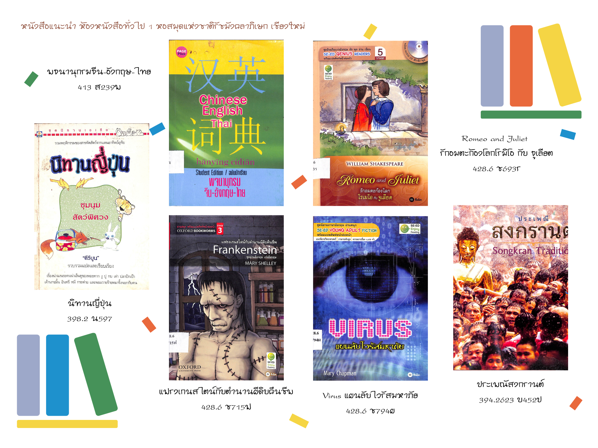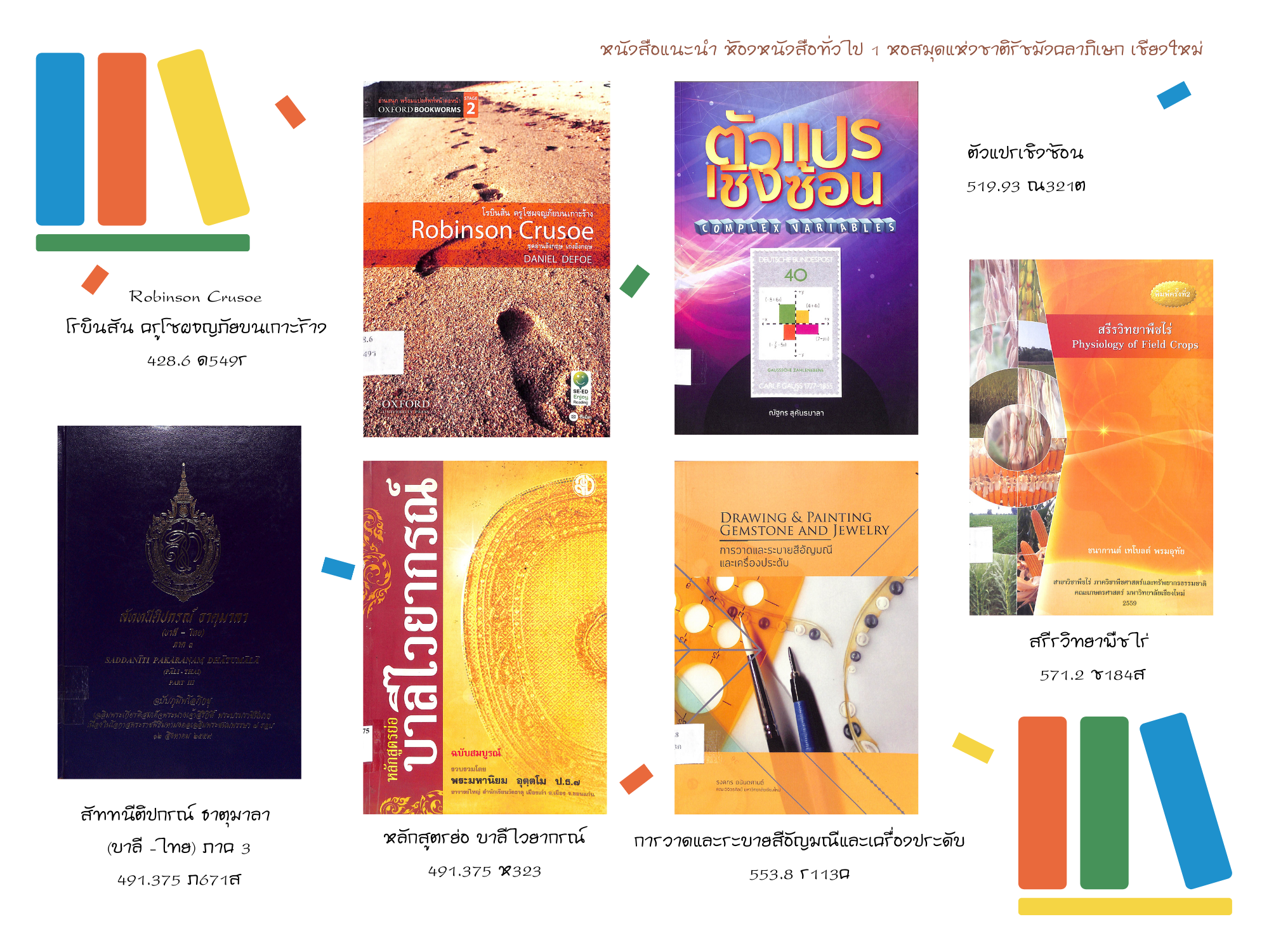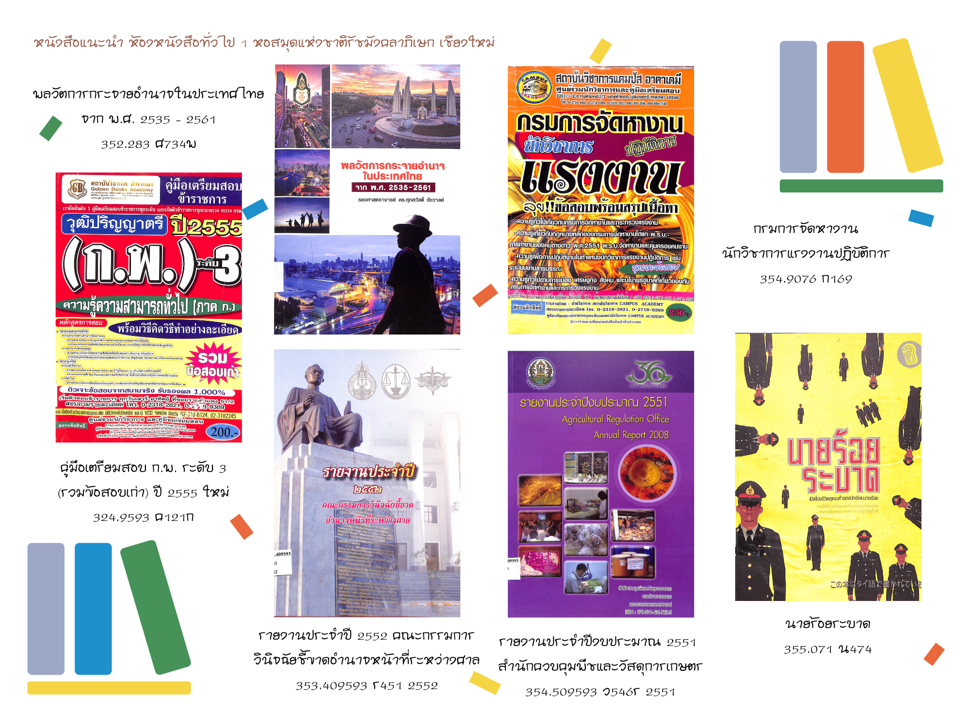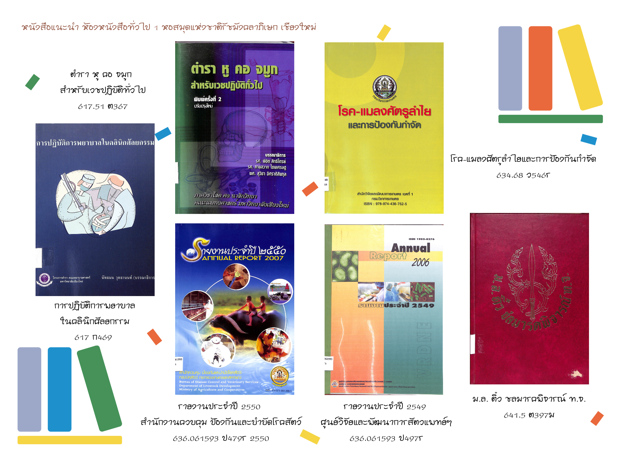 หอสมุดแห่งชาติรัชมังคลาภิเษก เชียงใหม่ ขอแนะนำหนังสือใหม่ ประจำเดือนเมษายน ๒๕๖๔ ที่จัดให้บริการ ณ ห้องหนังสือทั่วไป ๑ ทั้งหนังสือทั่วไปและหนังสือที่จัดพิมพ์โดยกรมศิลปากรที่น่าสนใจ จำนวน ๕๓ รายการ โดยผู้ใช้บริการสามารถเข้าชมหนังสือแนะนำประจำเดือน พร้อมรายละเอียดได้ที่ หนังสือแนะนำ และเข้าชมรายการหนังสือใหม่ประจำเดือนได้ที่ ข่าวประชาสัมพันธ์ หรือ เฟซบุ๊ก (Facebook) หอสมุดแห่งชาติรัชมังคลาภิเษก เชียงใหม่ นอกจากนี้ยังสามารถสืบค้นข้อมูลทรัพยากรสารสนเทศของทางหน่วยงานได้ที่ บริการสืบค้นข้อมูลทรัพยากร โดยผู้ที่สนใจสามารถเข้าใช้บริการหนังสือใหม่ตัวเล่มจริงได้ที่ ห้องหนังสือทั่วไป ๑ ตามวันเวลาทำการปกติของหน่วยงาน >> เปิด : วันอังคาร-วันเสาร์ เวลา ๐๙.๐๐-๑๗.๐๐ น. ปิด : วันอาทิตย์ - วันจันทร์ และวันหยุดตามประกาศของทางราชการ สอบถามข้อมูลเพิ่มเติมได้ที่ ๐๕๓ - ๘๐๘๕๕๑ ต่อ ๑๙ หรือทาง เฟซบุ๊ก (Facebook) หอสมุดแห่งชาติรัชมังคลาภิเษก เชียงใหม่ หรือ ทางอีเมล (E-mail) : nlt.chiangmai.hotmail.com