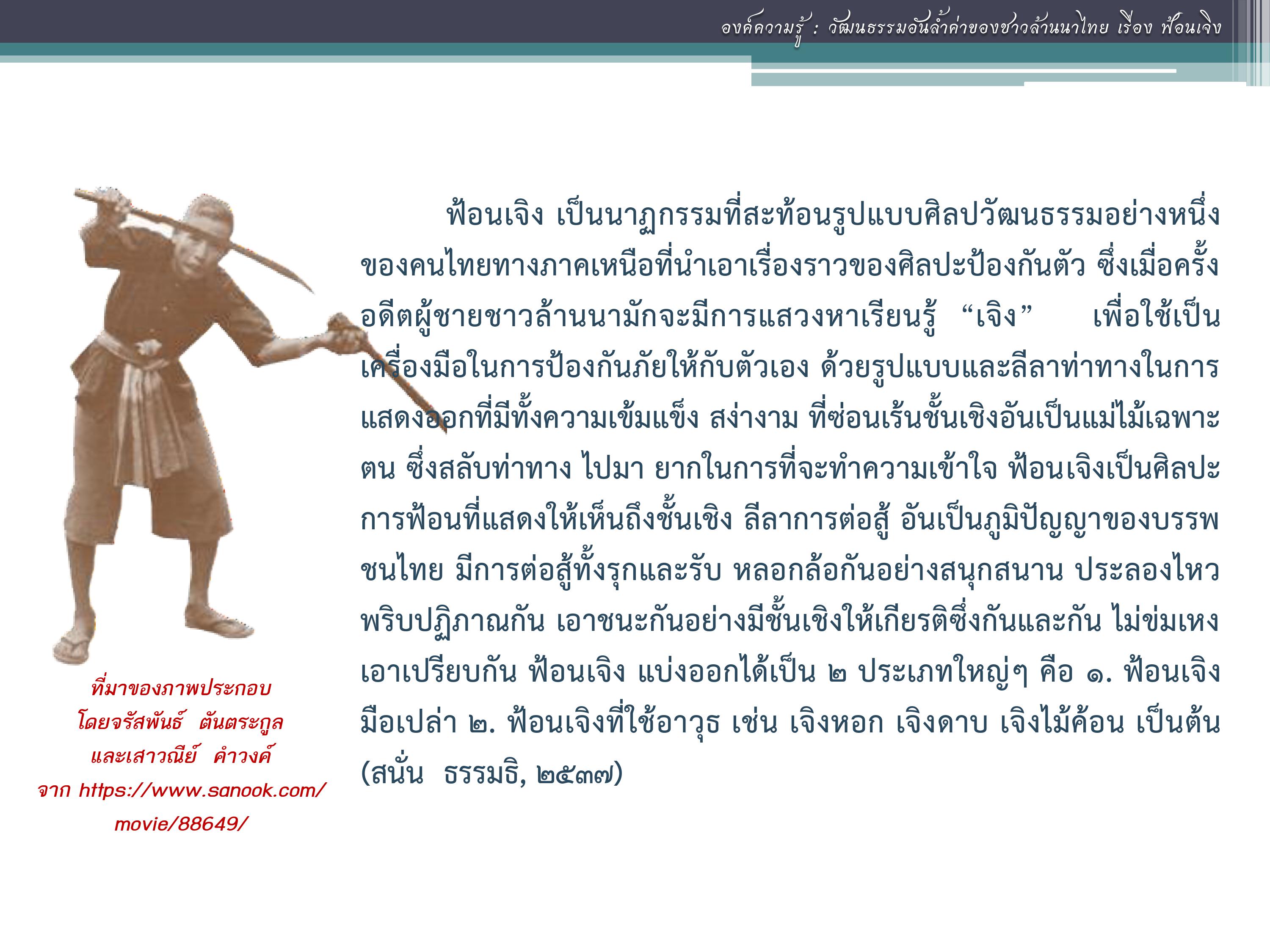 แผนงานสื่อศิลปวัฒนธรรม สร้างเสริมสุขภาพ. สื่อการสอนเพื่อการสืบสานภูมิปัญญาล้านนาฟ้อนเจิงขั้นพื้นฐาน (ตอนที่ ๑). [ออนไลน์]. สืบค้นเมื่อ ๓๐ มิถุนายน ๒๕๖๔,