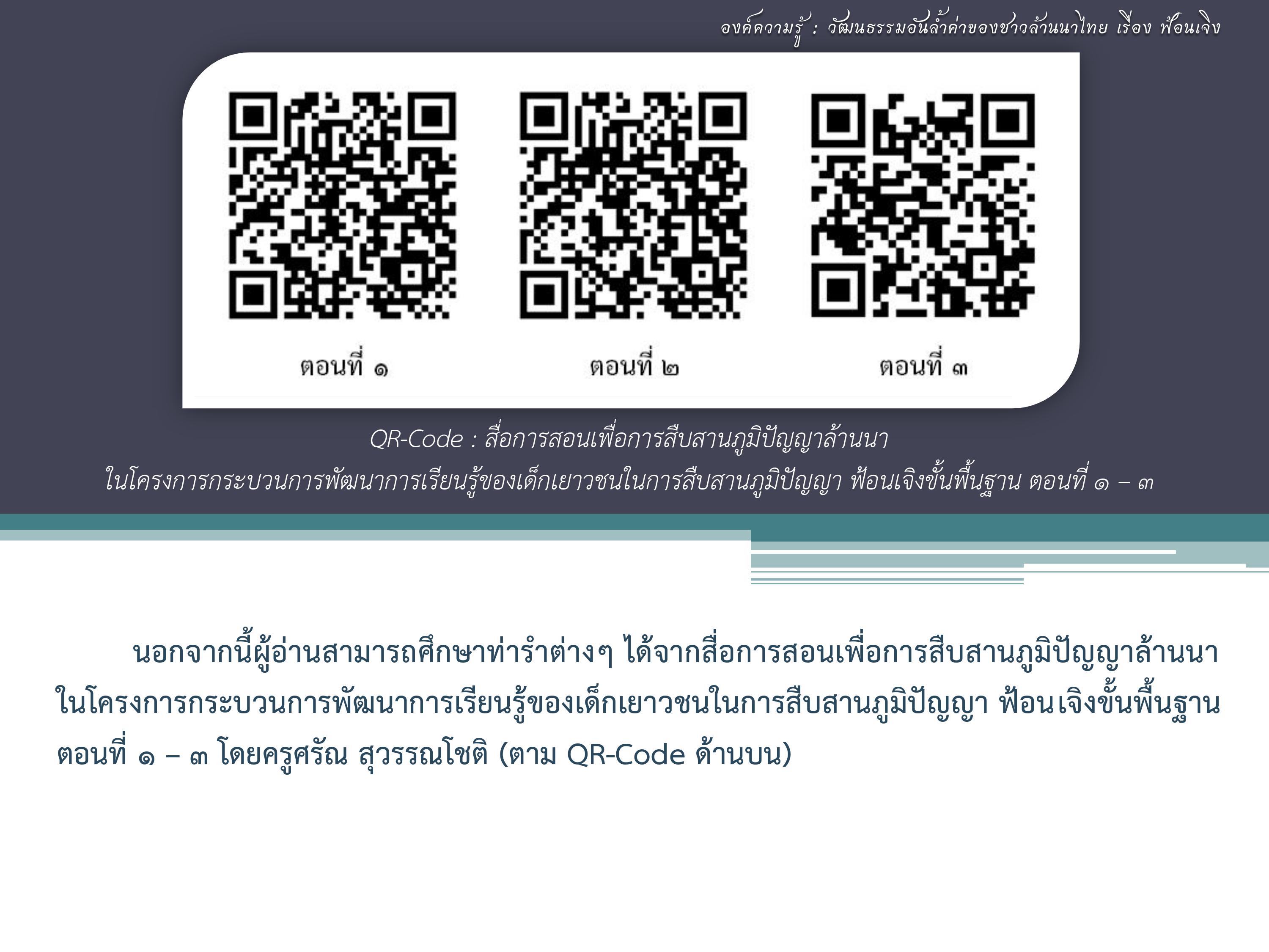 แผนงานสื่อศิลปวัฒนธรรม สร้างเสริมสุขภาพ. สื่อการสอนเพื่อการสืบสานภูมิปัญญาล้านนาฟ้อนเจิงขั้นพื้นฐาน (ตอนที่ ๓). [ออนไลน์]. สืบค้นเมื่อ ๓๐ มิถุนายน ๒๕๖๔,