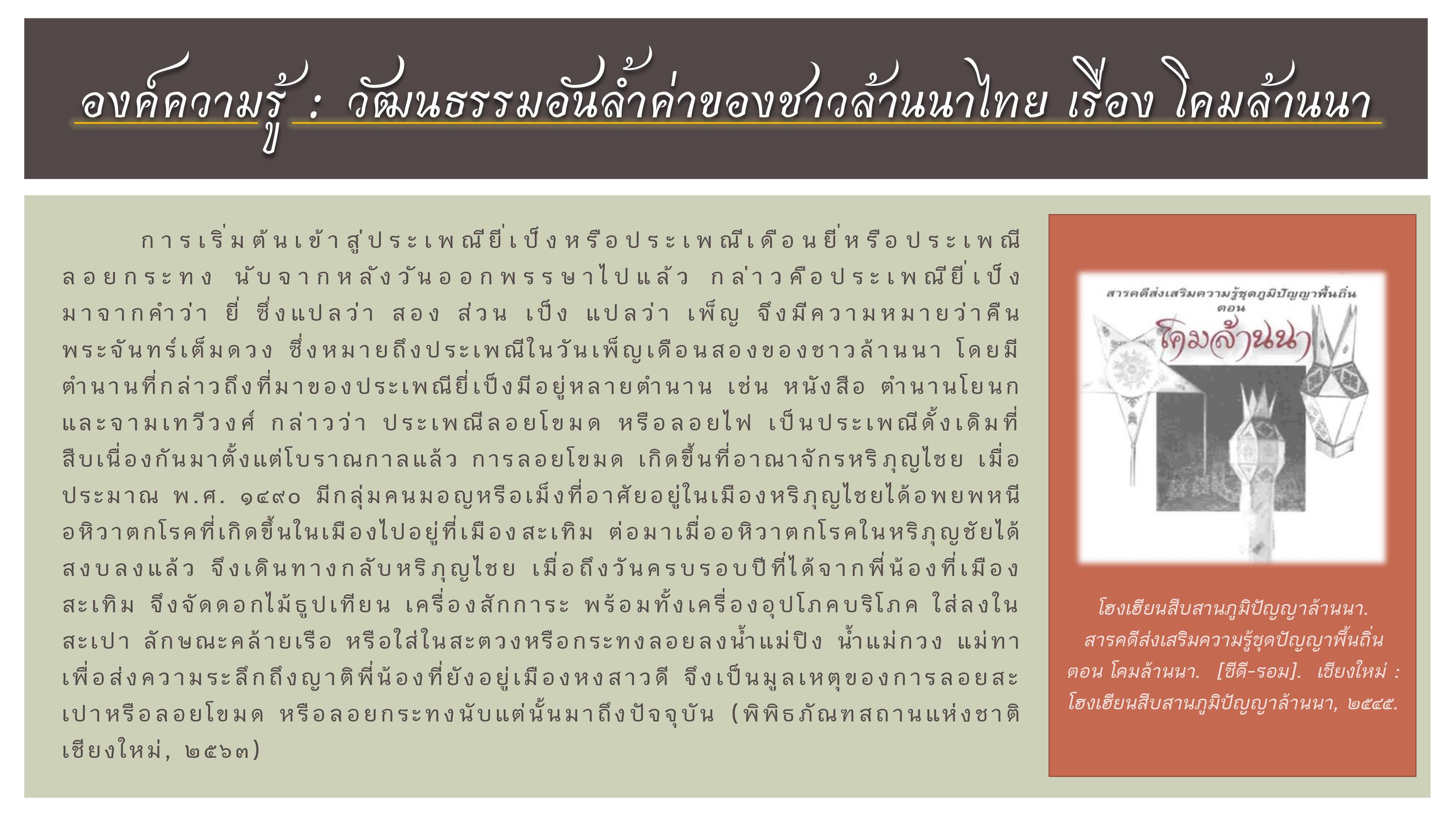 ประเพณียี่เป็ง. [ออนไลน์]. สืบค้นเมื่อ ๑๘ สิงหาคม ๒๕๖๔, จาก https://www.finearts.go.th/chiangmaimuseum/view/21724-ประเพณียี่เป็ง, ๒๕๖๓.