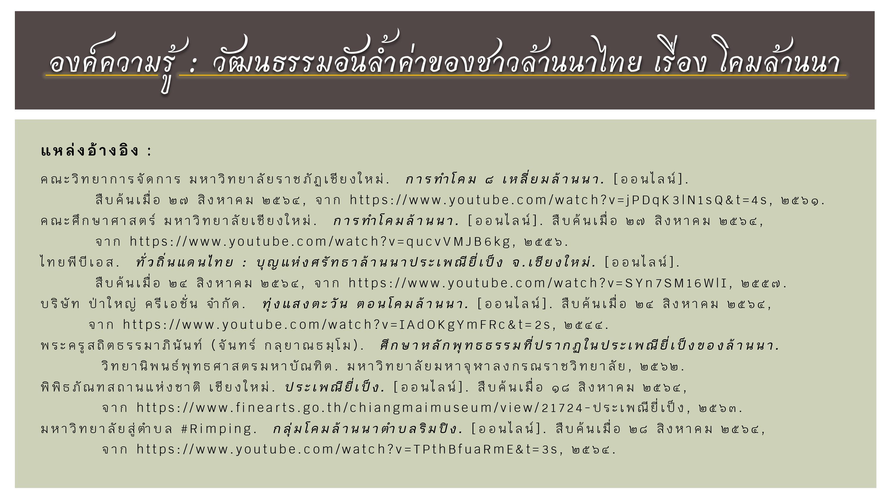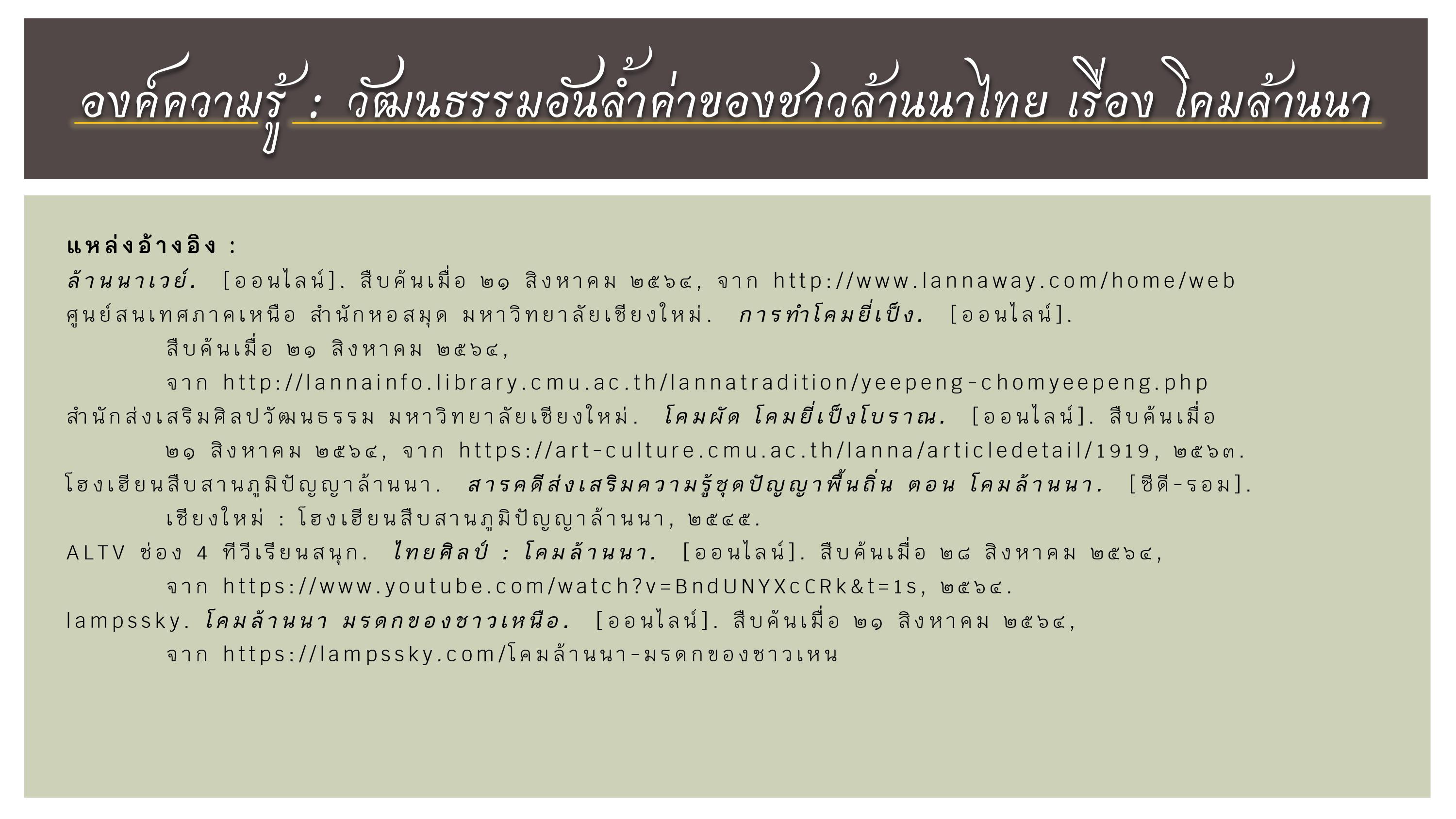 ALTV ช่อง 4 ทีวีเรียนสนุก. ไทยศิลป์ : โคมล้านนา. [ออนไลน์]. สืบค้นเมื่อ ๒๘ สิงหาคม ๒๕๖๔, จาก https://www.youtube.com/watch?v=BndUNYXcCRk&t=1s, ๒๕๖๔.