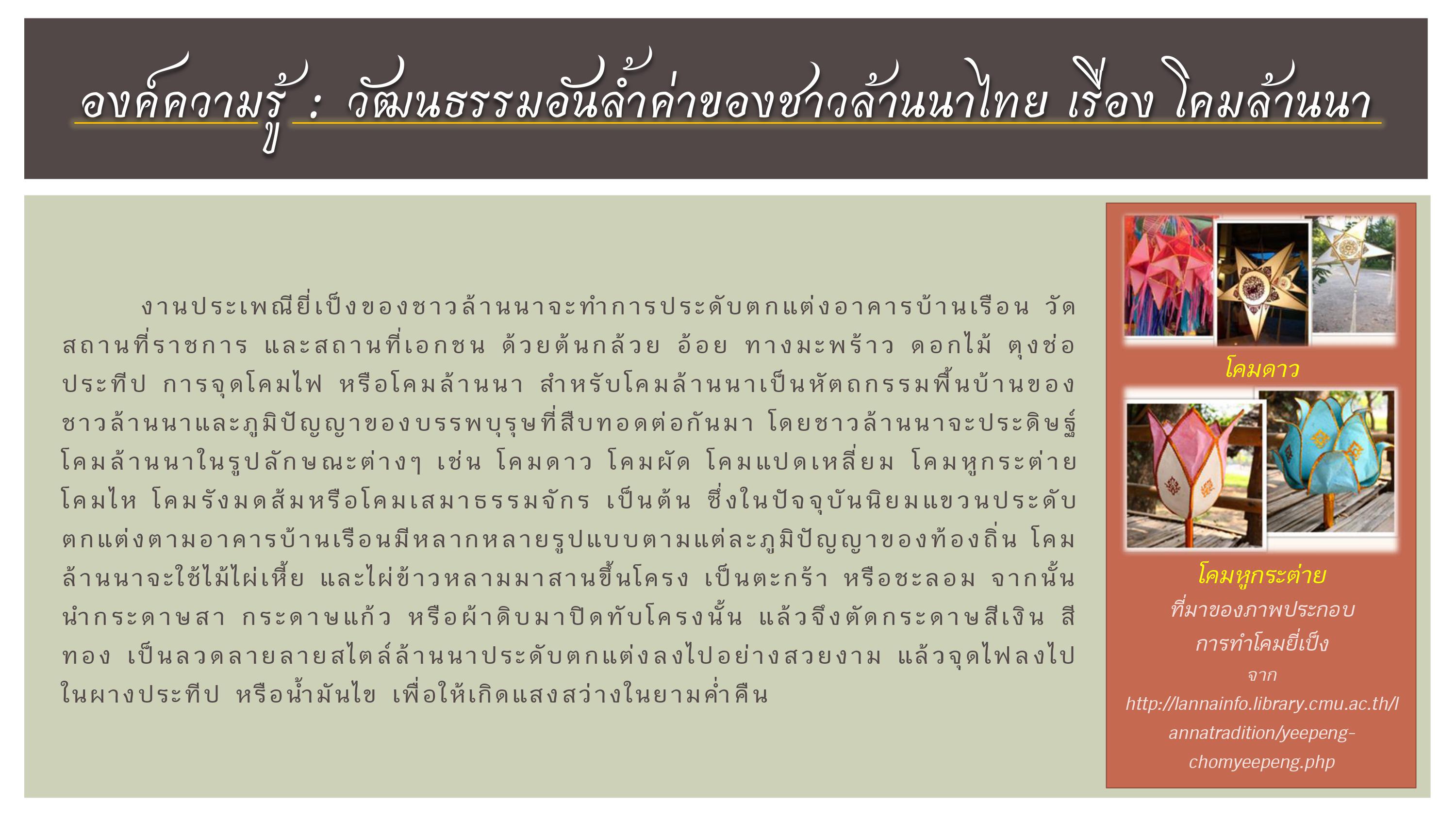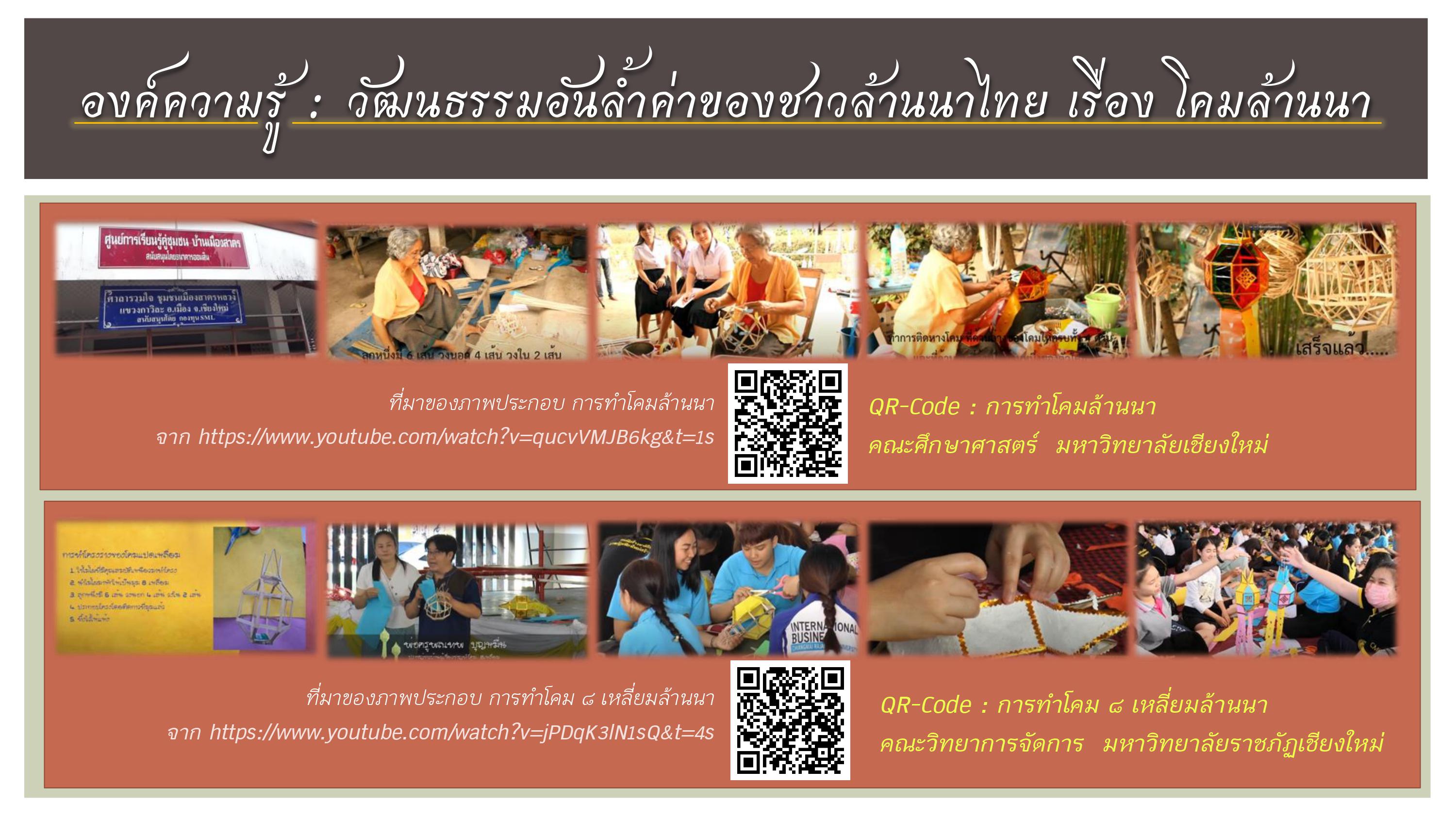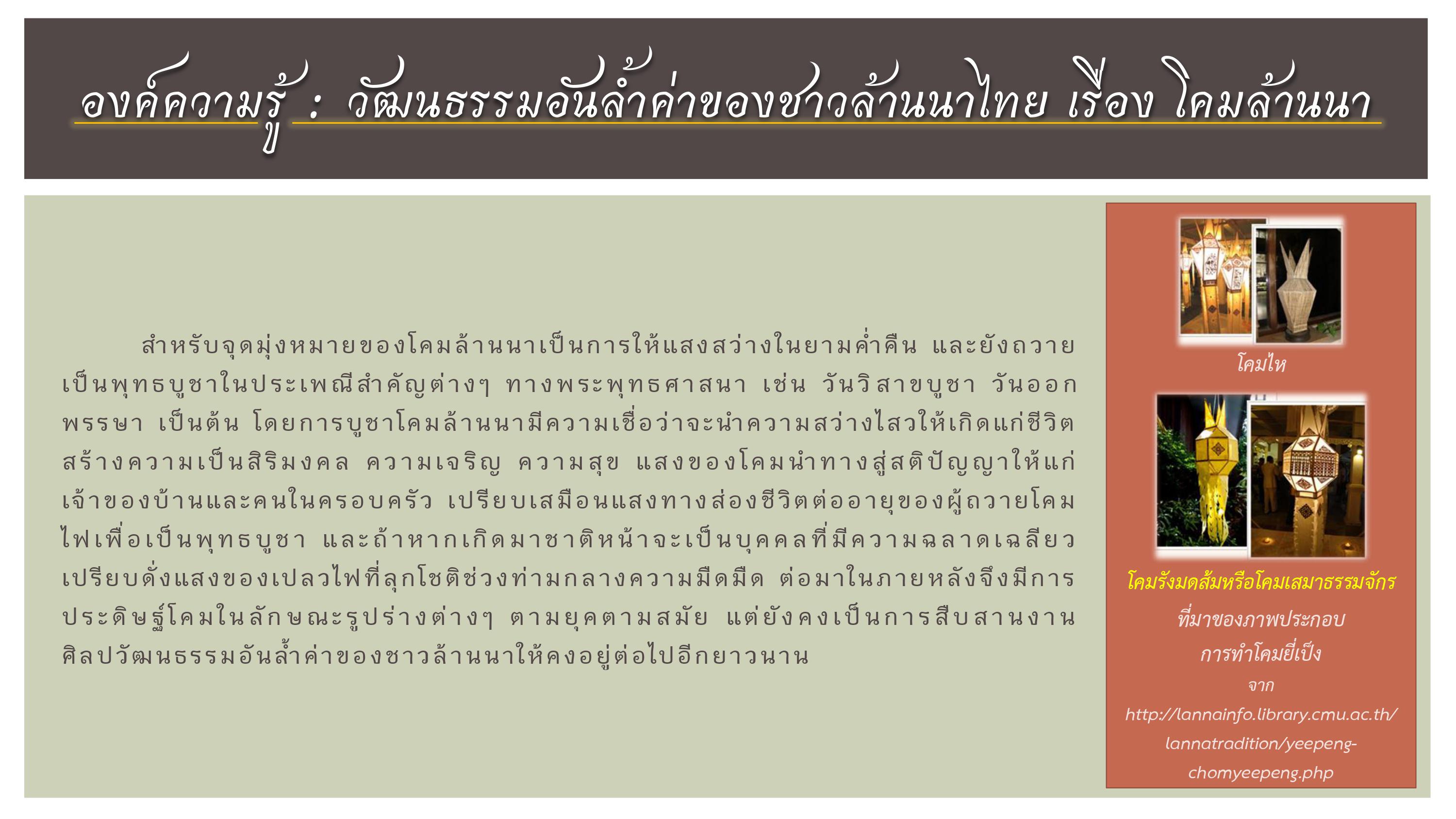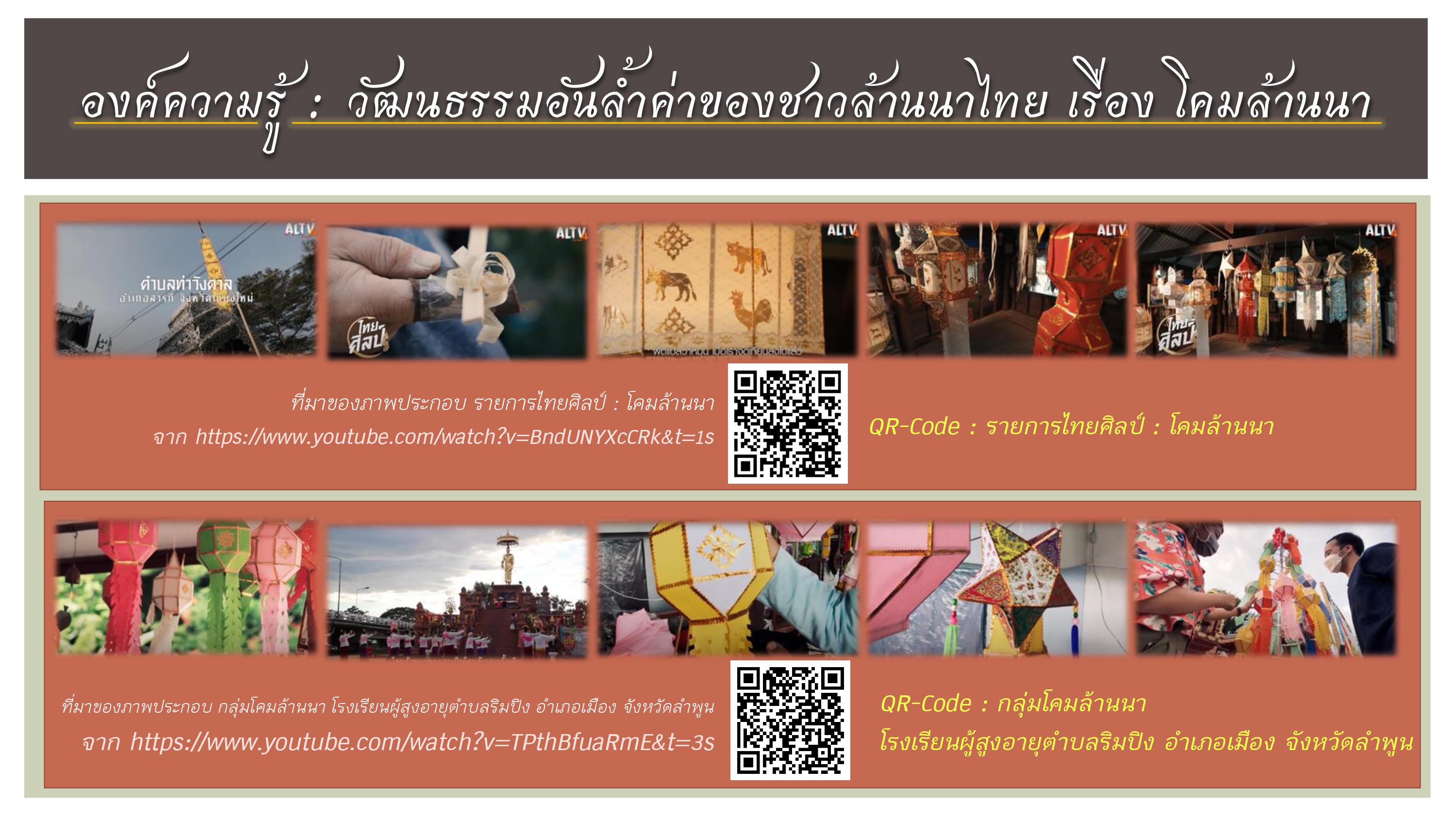 ALTV ช่อง 4 ทีวีเรียนสนุก. ไทยศิลป์ : โคมล้านนา. [ออนไลน์]. สืบค้นเมื่อ ๒๘ สิงหาคม ๒๕๖๔, จาก https://www.youtube.com/watch?v=BndUNYXcCRk&t=1s, ๒๕๖๔.