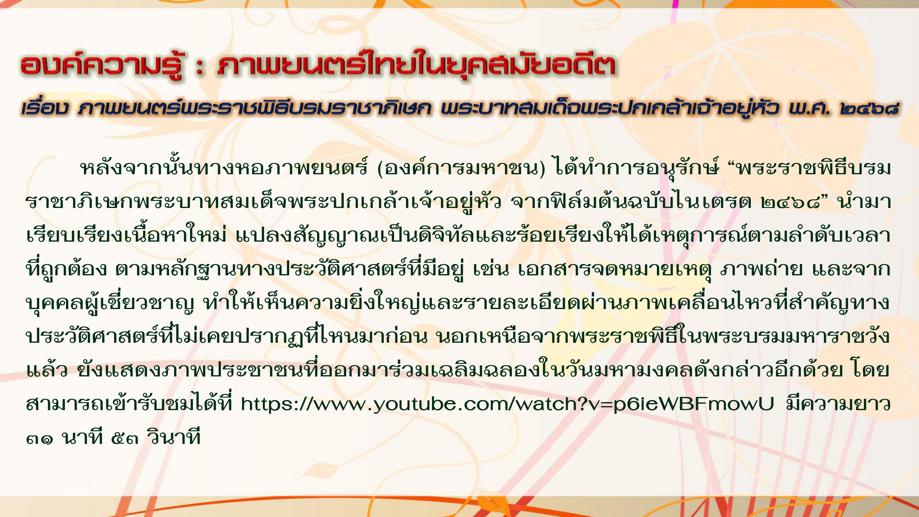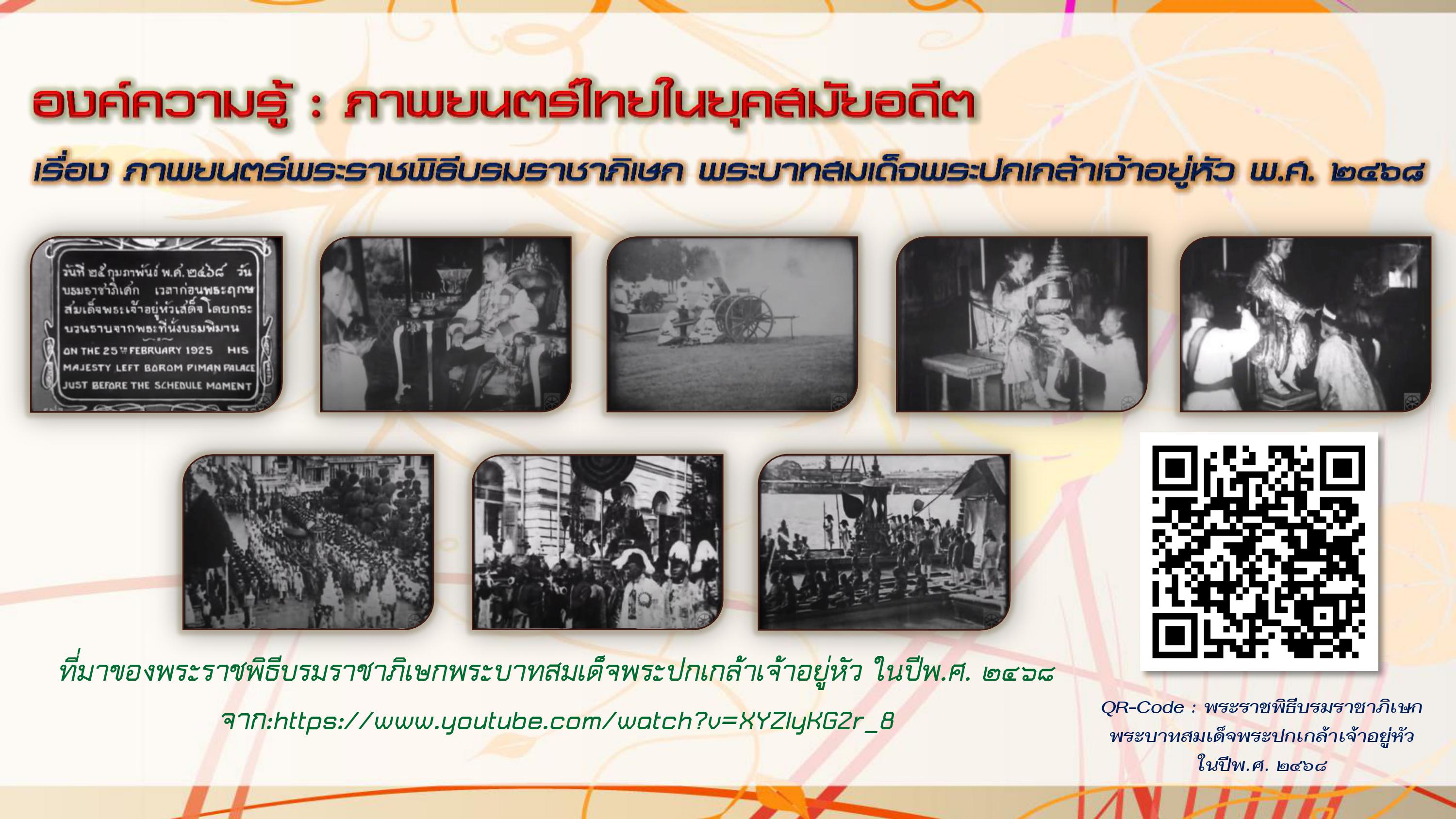 หอภาพยนตร์ (องค์การมหาชน). พระราชพิธีบรมราชาภิเษกพระบาทสมเด็จพระปกเกล้าเจ้าอยู่หัว จากฟิล์มต้นฉบับไนเตรต ๒๔๖๘. [ออนไลน์].