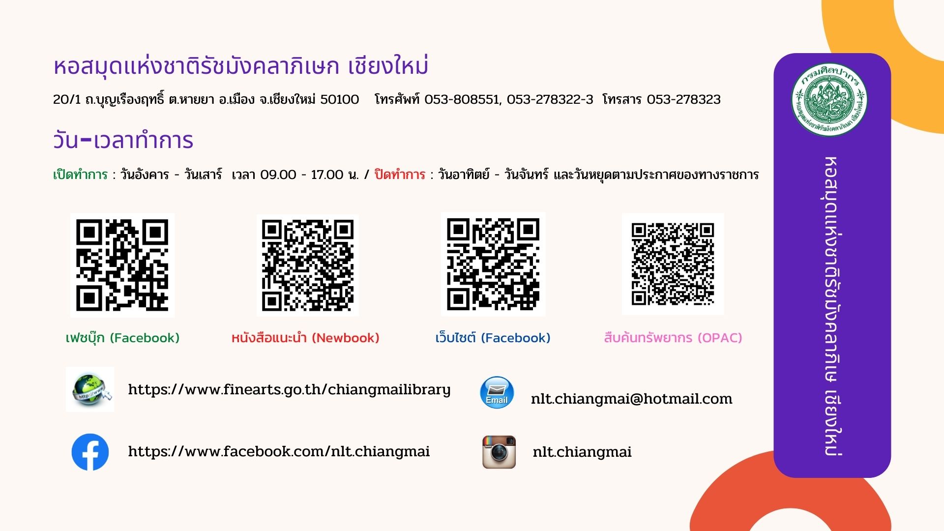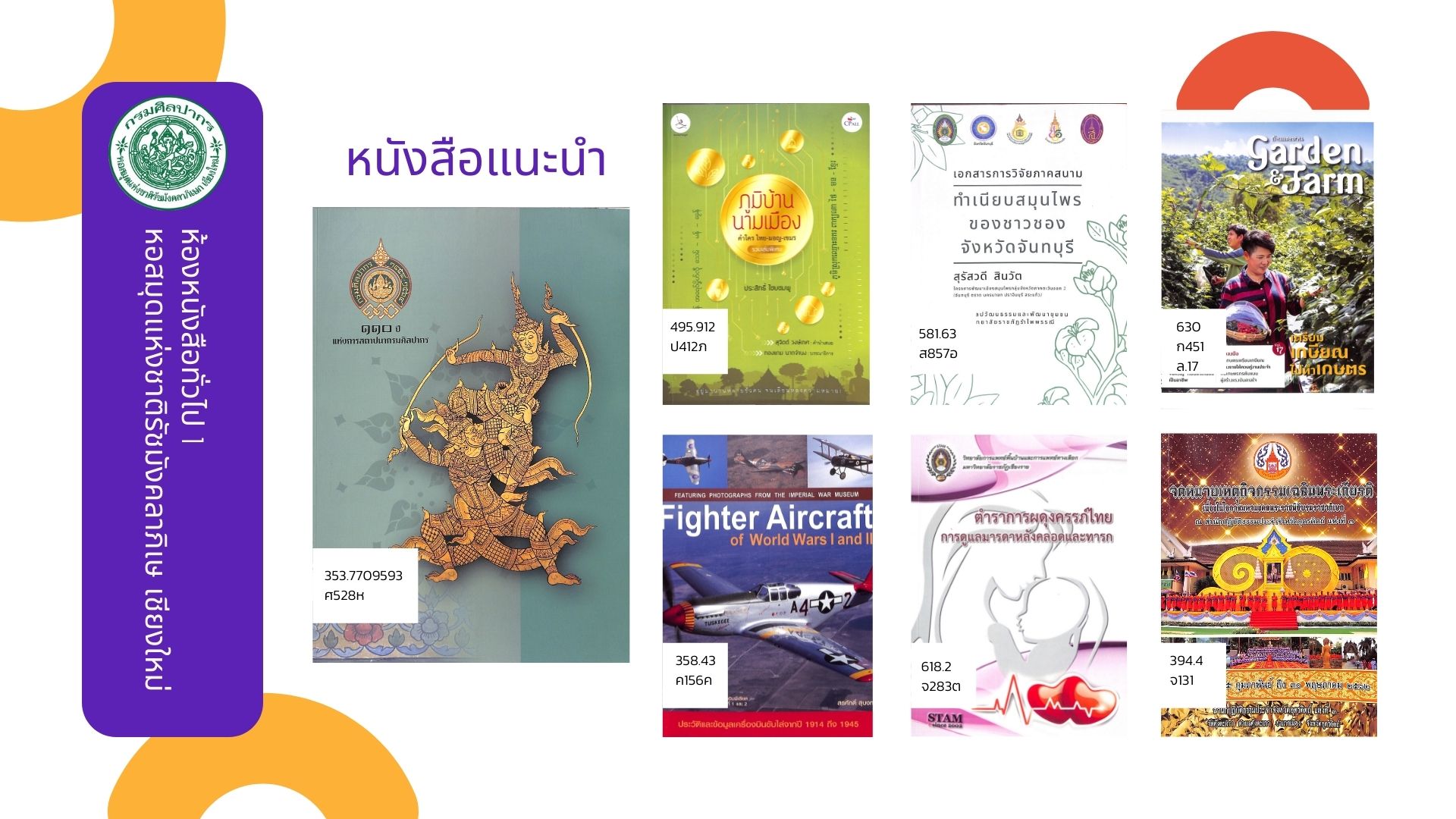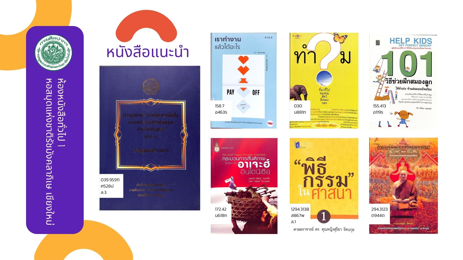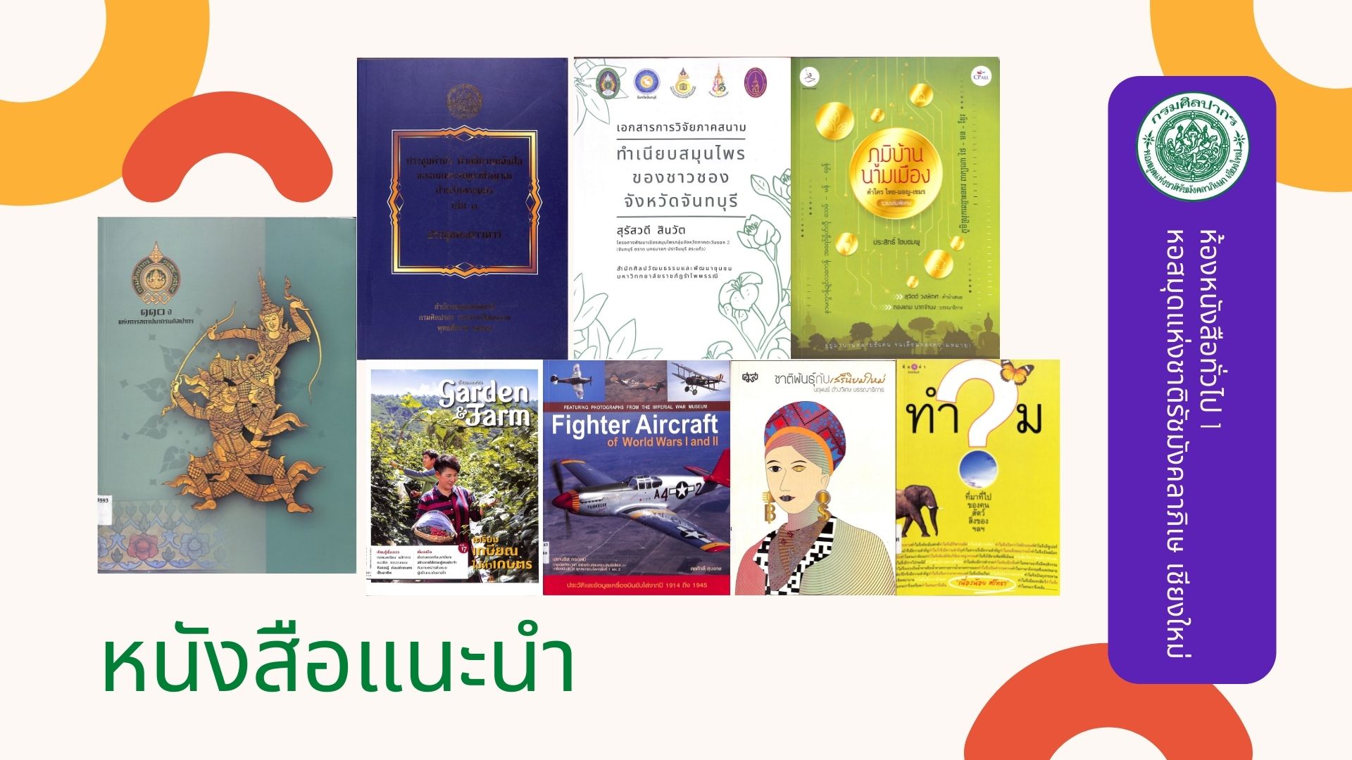 หอสมุดแห่งชาติรัชมังคลาภิเษก เชียงใหม่ ขอแนะนำหนังสือน่าอ่าน ประจำเดือนธันวาคม ๒๕๖๔ ที่จัดให้บริการ ณ ห้องหนังสือทั่วไป ๑ ทั้งหนังสือทั่วไปและหนังสือที่จัดพิมพ์โดยกรมศิลปากรที่น่าสนใจ โดยผู้ใช้บริการสามารถเข้าชมหนังสือแนะนำ พร้อมรายละเอียดได้ที่ หนังสือแนะนำ และเข้าชมรายการหนังสือใหม่ประจำเดือนได้ที่ ข่าวประชาสัมพันธ์ หรือ เฟซบุ๊ก (Facebook) นอกจากนี้ยังสามารถสืบค้นข้อมูลทรัพยากรสารสนเทศของทางหน่วยงานได้ที่ บริการสืบค้นข้อมูลทรัพยากร โดยผู้ที่สนใจสามารถเข้าใช้บริการหนังสือตัวเล่มจริงได้ที่ ห้องหนังสือทั่วไป ๑ ตามวันเวลาทำการของหน่วยงาน >> เปิด : วันอังคาร-วันเสาร์ เวลา ๐๙.๐๐-๑๗.๐๐ น. ปิด : วันอาทิตย์ - วันจันทร์ และวันหยุดตามประกาศของทางราชการ สอบถามข้อมูลเพิ่มเติมได้ที่ ๐๕๓ - ๘๐๘๕๕๑ ต่อ ๑๙ : เฟซบุ๊ก (Facebook) หอสมุดแห่งชาติรัชมังคลาภิเษก เชียงใหม่ และ อีเมล (E-mail) : nlt.chiangmai.hotmail.com