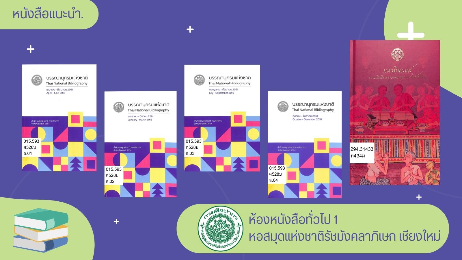 หอสมุดแห่งชาติรัชมังคลาภิเษก เชียงใหม่ ขอแนะนำหนังสือที่จัดพิมพ์โดยกรมศิลปากร ซึ่งจัดให้บริการ ณ ห้องหนังสือทั่วไป ๑ โดยผู้ใช้บริการสามารถเข้าชมหนังสือแนะนำ พร้อมรายละเอียดได้ที่ หนังสือแนะนำ และเข้าชมรายการหนังสือใหม่ประจำเดือนได้ที่ ข่าวประชาสัมพันธ์ หรือ เฟซบุ๊ก (Facebook) นอกจากนี้ยังสามารถสืบค้นข้อมูลทรัพยากรสารสนเทศของทางหน่วยงานได้ที่ บริการสืบค้นข้อมูลทรัพยากร โดยผู้ที่สนใจสามารถเข้าใช้บริการหนังสือตัวเล่มจริงได้ที่ ห้องหนังสือทั่วไป ๑ ตามวันเวลาทำการของหน่วยงาน >> เปิด : วันอังคาร-วันเสาร์ เวลา ๐๙.๐๐-๑๗.๐๐ น. ปิด : วันอาทิตย์ - วันจันทร์ และวันหยุดตามประกาศของทางราชการ สอบถามข้อมูลเพิ่มเติมได้ที่ ๐๕๓ - ๘๐๘๕๕๑ ต่อ ๑๙ : เฟซบุ๊ก (Facebook) หอสมุดแห่งชาติรัชมังคลาภิเษก เชียงใหม่ และ อีเมล (E-mail) : nlt.chiangmai.hotmail.com