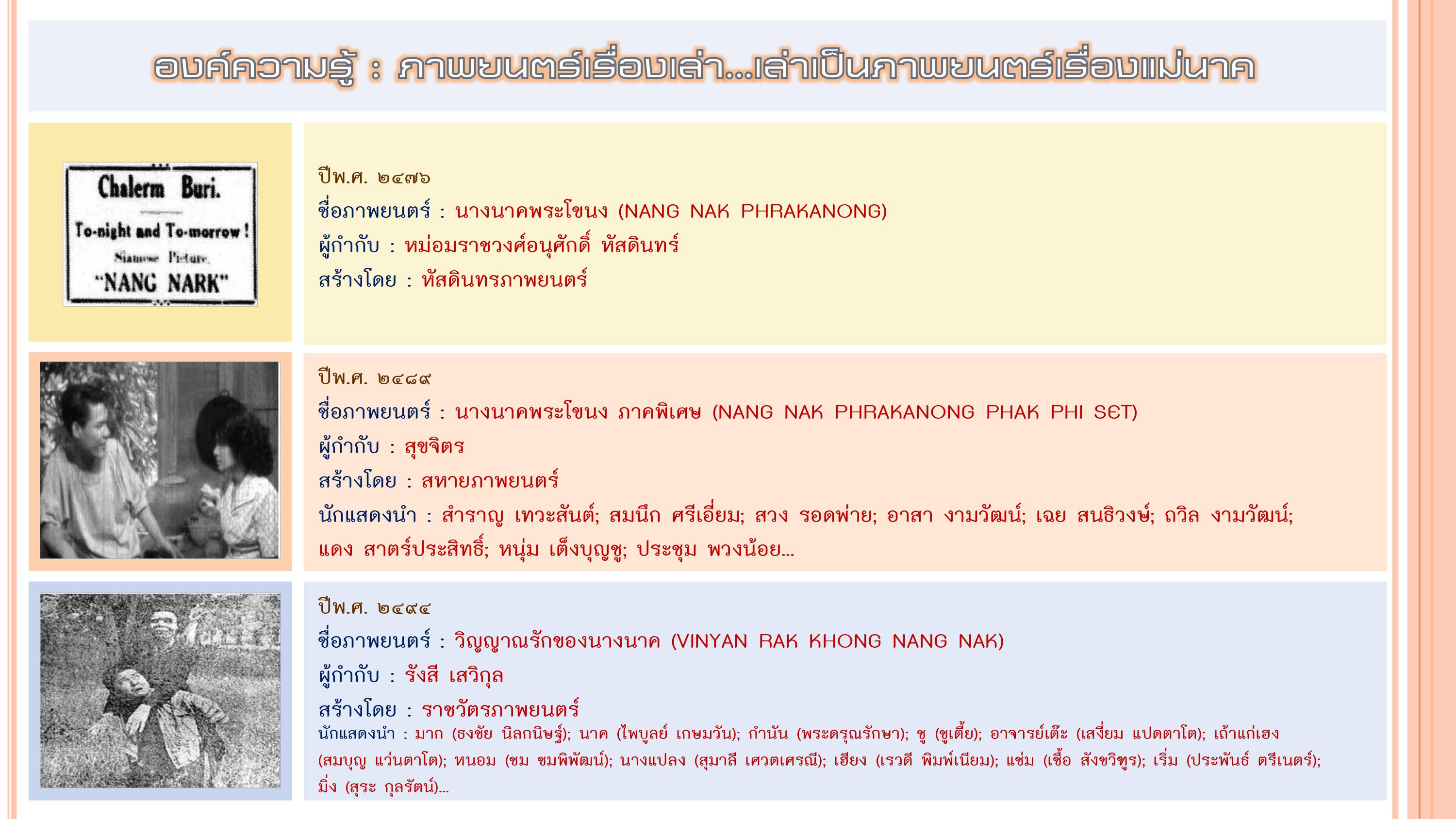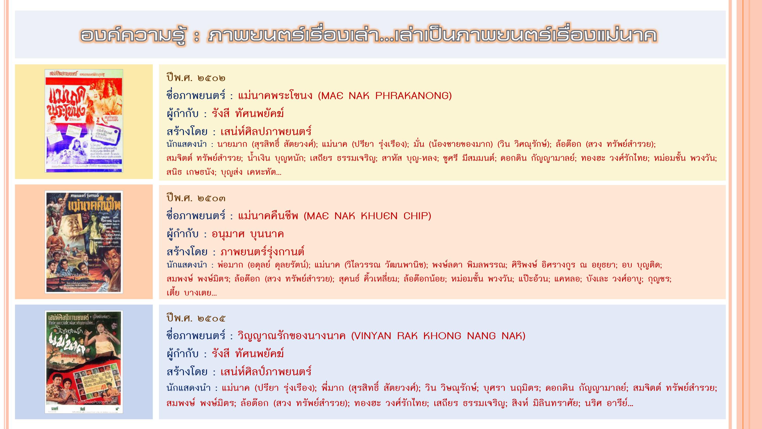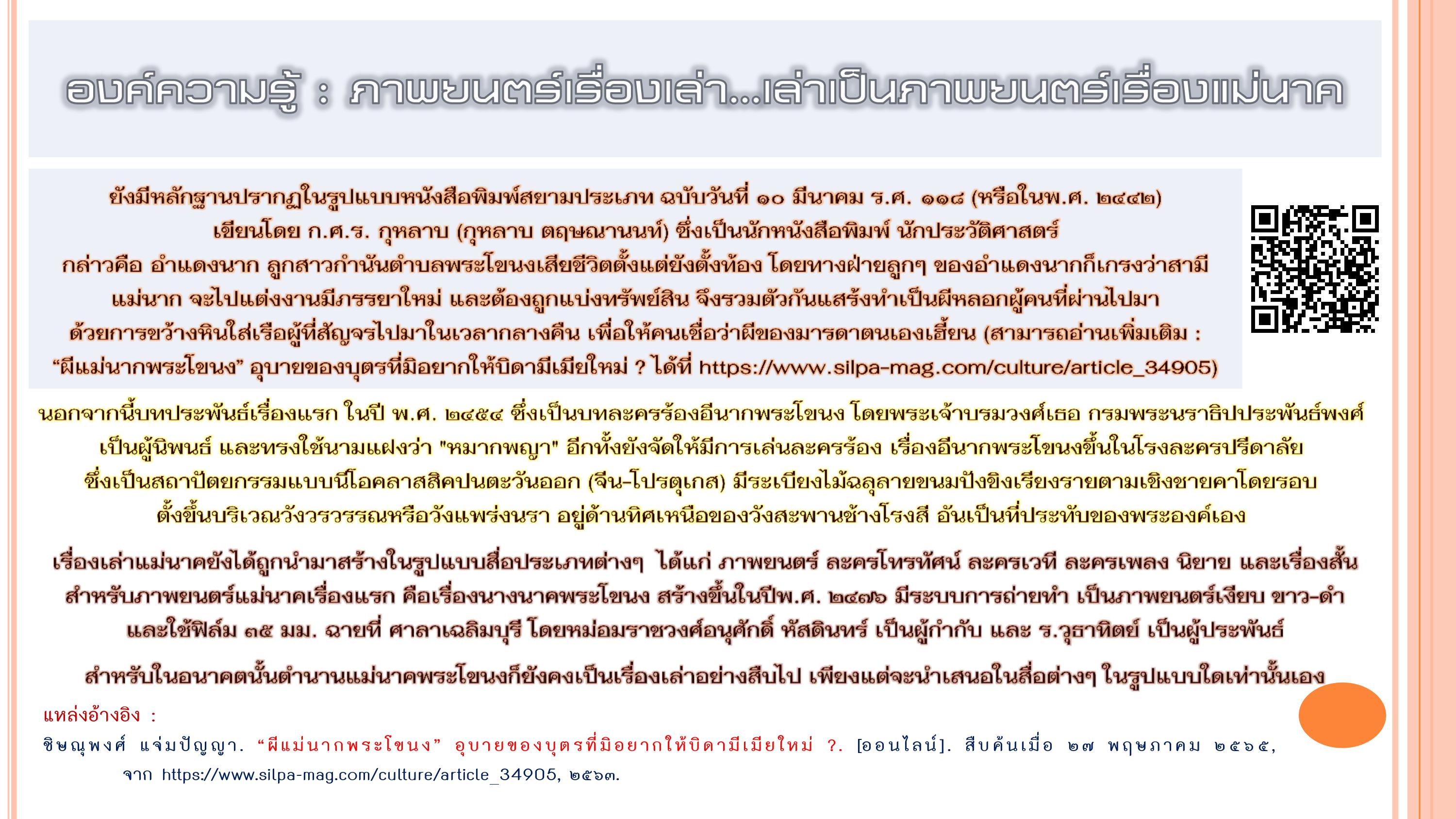 ชิษณุพงศ์ แจ่มปัญญา. “ผีแม่นากพระโขนง” อุบายของบุตรที่มิอยากให้บิดามีเมียใหม่ ?. [ออนไลน์]. สืบค้นเมื่อ ๒๗ พฤษภาคม ๒๕๖๕,