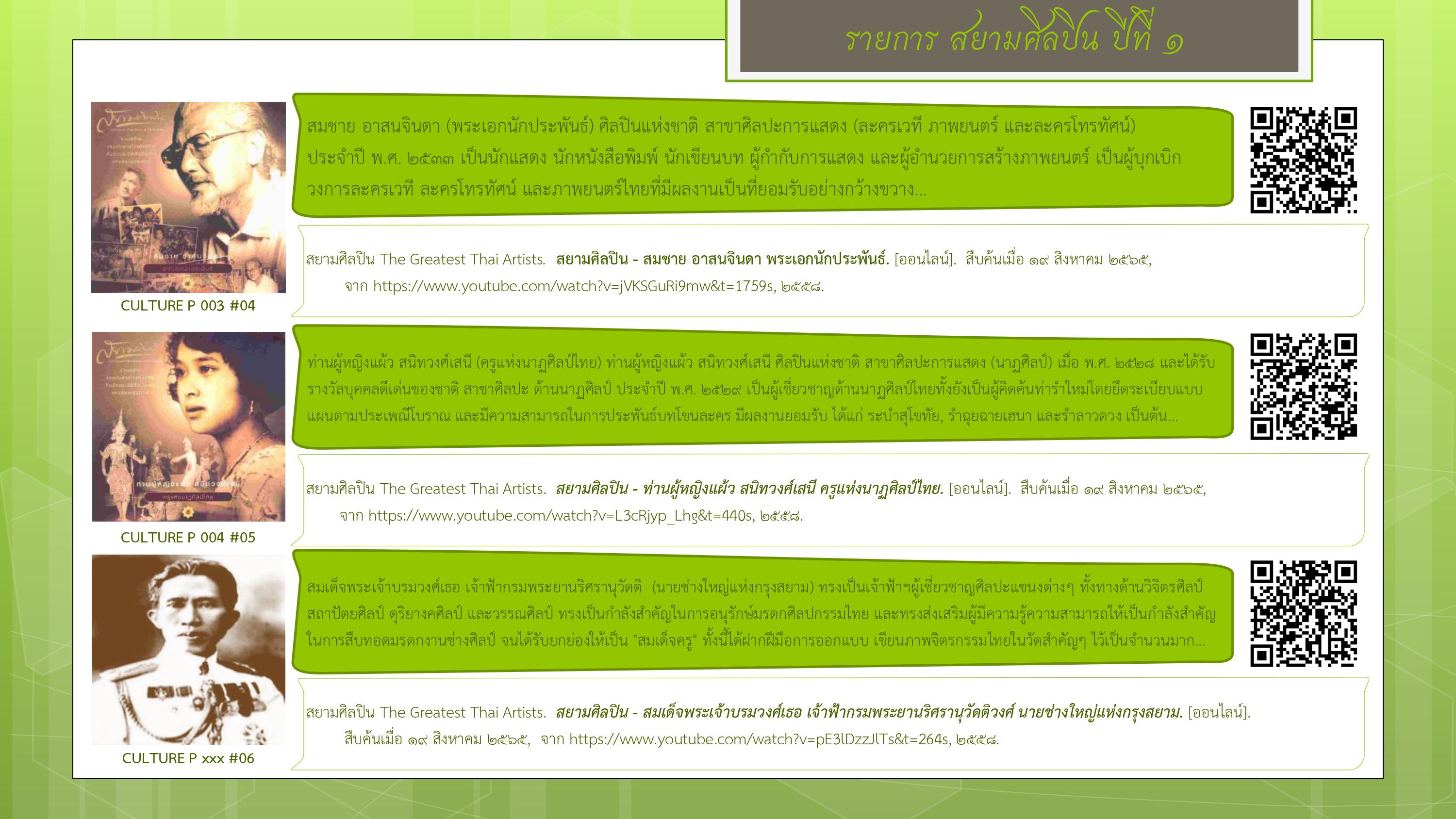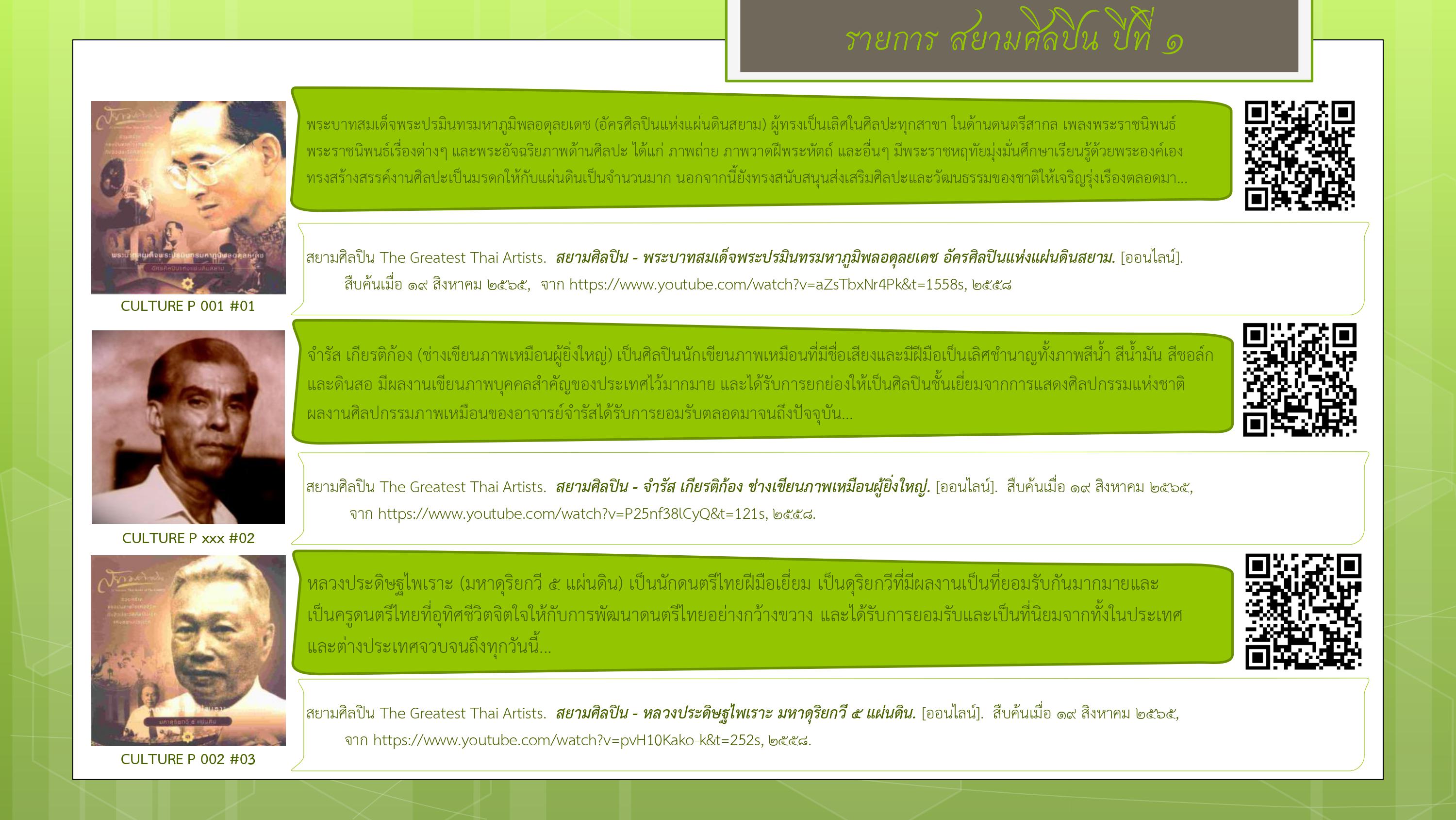 รายการ สยามศิลปิน ปีที่ ๑ เป็นรายการสารคดีอัตชีวประวัติศิลปินไทย ซึ่งผลิตขึ้นในนาม สำนักงานคณะกรรมการวัฒนธรรมแห่งชาติ และมูลนิธิศิลปินแห่งชาติ ในปีนี้ทางรายการได้จัดทำไว้เป็น ๑๒ ตอน ได้แก่ พระบาทสมเด็จพระปรมินทรมหาภูมิพลอดุลยเดช (อัครศิลปินแห่งแผ่นดินสยาม), จำรัส เกียรติก้อง (ช่างเขียนภาพเหมือนผู้ยิ่งใหญ่), หลวงประดิษฐไพเราะ (มหาดุริยกวี ๕ แผ่นดิน), สมชาย อาสนจินดา (พระเอกนักประพันธ์), ท่านผู้หญิงแผ้ว สนิทวงศ์เสนี (ครูแห่งนาฏศิลป์ไทย), สมเด็จพระเจ้าบรมวงศ์เธอ เจ้าฟ้ากรมพระยานริศรานุวัดติ (นายช่างใหญ่แห่งกรุงสยาม), ศาสตราจารย์ศิลป์ พีระศรี (บิดาแห่งศิลปะสมัยใหม่ของไทย), กุหลาบ สายประดิษฐ์ (สุภาพบุรุษศรีบูรพา), หลวงวิจิตรวาทการ (นักสู้ผู้พากเพียร), หม่อมราชวงศ์มิตรารุณ เกษมศรี (ครูช่างสถาปัตยกรรมไทย), พระเจนดุริยางค์ (ผู้วางรากฐานดุริยางคศิลป์ของไทย) และพระบาทสมเด็จพระพุทธเลิศหล้านภาลัย (ธ ผู้สร้างศาสตร์และศิลป์แผ่นดินไทย)