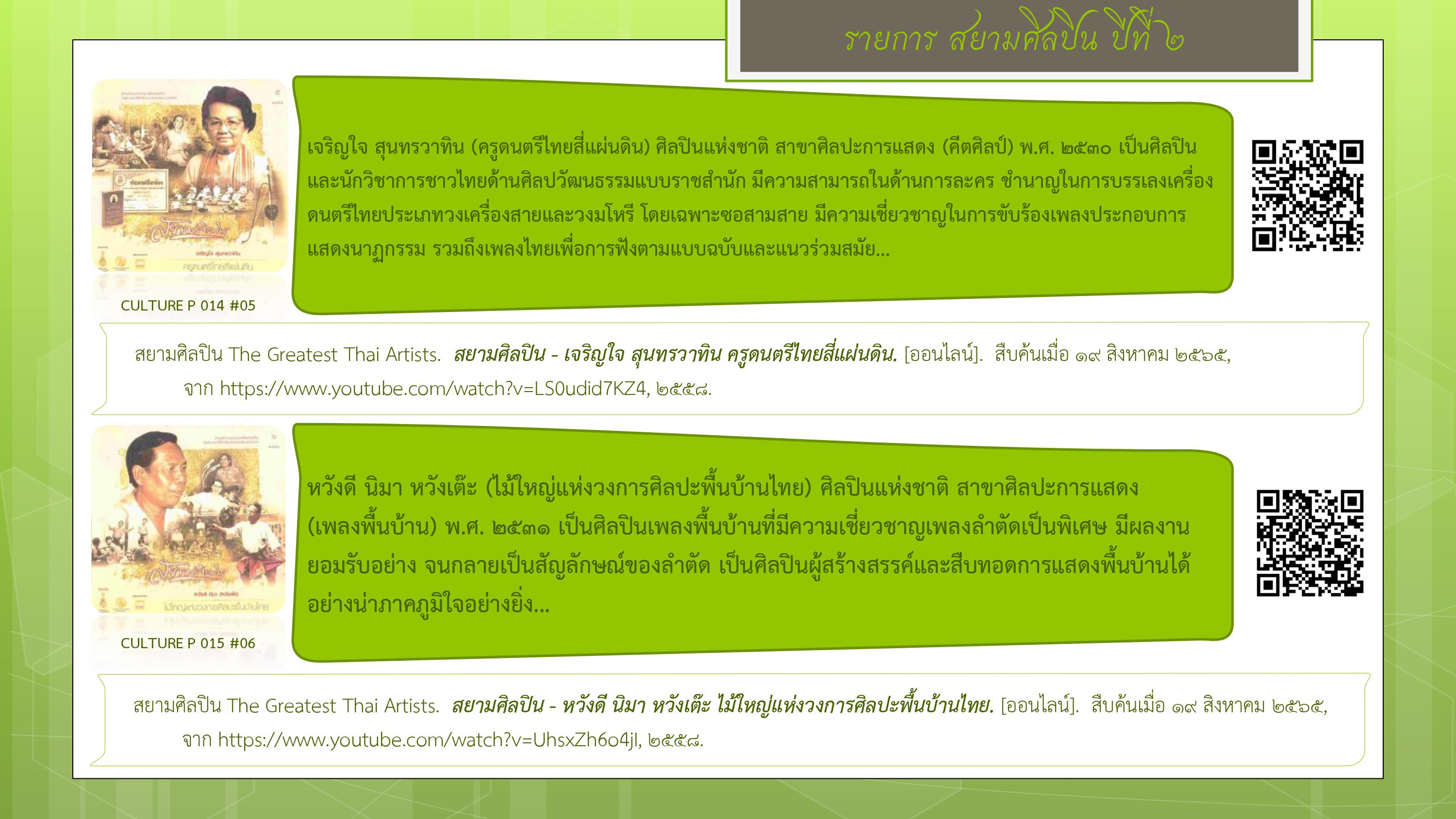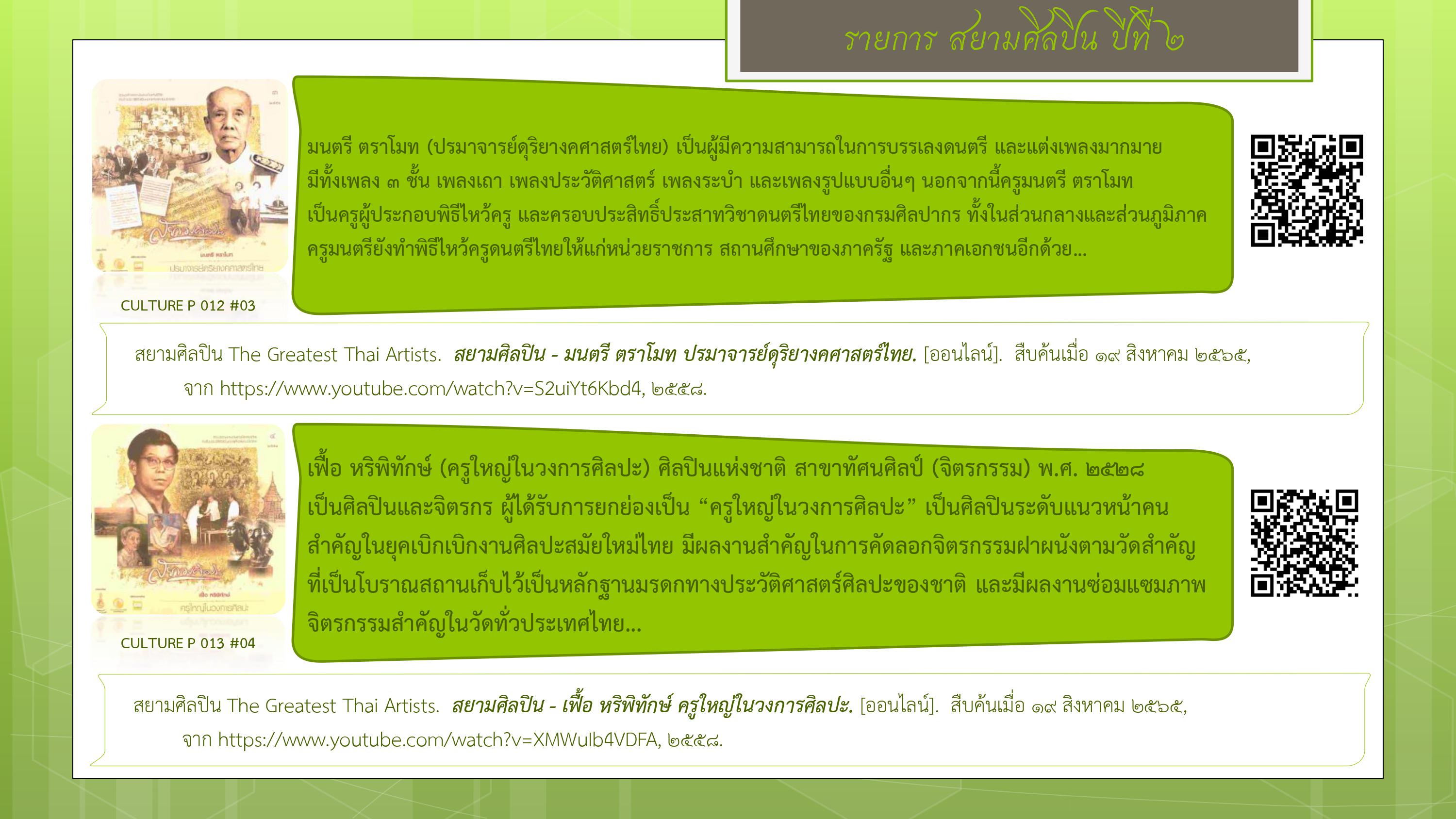 รายการ สยามศิลปิน ปีที่ ๒ เป็นรายการสารคดีอัตชีวประวัติศิลปินไทย ซึ่งผลิตขึ้นในนาม สำนักงานคณะกรรมการวัฒนธรรมแห่งชาติ และมูลนิธิศิลปินแห่งชาติ ในปีนี้ทางรายการได้จัดทำไว้เป็น ๑๒ ตอน ได้แก่ พระบาทสมเด็จพระพุทธยอดฟ้าจุฬาโลกมหาราช (พระปฐมบรมกษัตริย์แห่งจักรีวงศ์), สุนทรภู่ (กวีแก้วแห่งกรุงรัตนโกสินทร์), มนตรี ตราโมท (ปรมาจารย์ดุริยางคศาสตร์ไทย), เฟื้อ หริพิทักษ์ (ครูใหญ่ในวงการศิลปะ), เจริญใจ สุนทรวาทิน (ครูดนตรีไทยสี่แผ่นดิน), หวังดี นิมา หวังเต๊ะ (ไม้ใหญ่แห่งวงการศิลปะพื้นบ้านไทย), สวัสดิ์ ตันติสุข (ศิลปินอาวุโสผู้ไม่เคยหยุดการศึกษาและสร้างสรรค์), อังคาร กัลยาณพงศ์ (ปณิธานแห่งกวี), พินิจ สุวรรณะบุณย์ (ผู้ฝากผลงานไว้ในแผ่นดิน), อาจินต์ ปัญจพรรค์ (ร่ายยาวแห่งชีวิต), เรืออากาศตรีศาสตราจารย์พิเศษ ดร.แมนรัตน์ ศรีกรานนท์ (ดุริยางคศิลปินแผ่นดินสยาม) และดร.ประเวศ ลิมปรังษี (ผู้สืบสานงานสถาปัตยกรรมไทยแห่งสยาม)