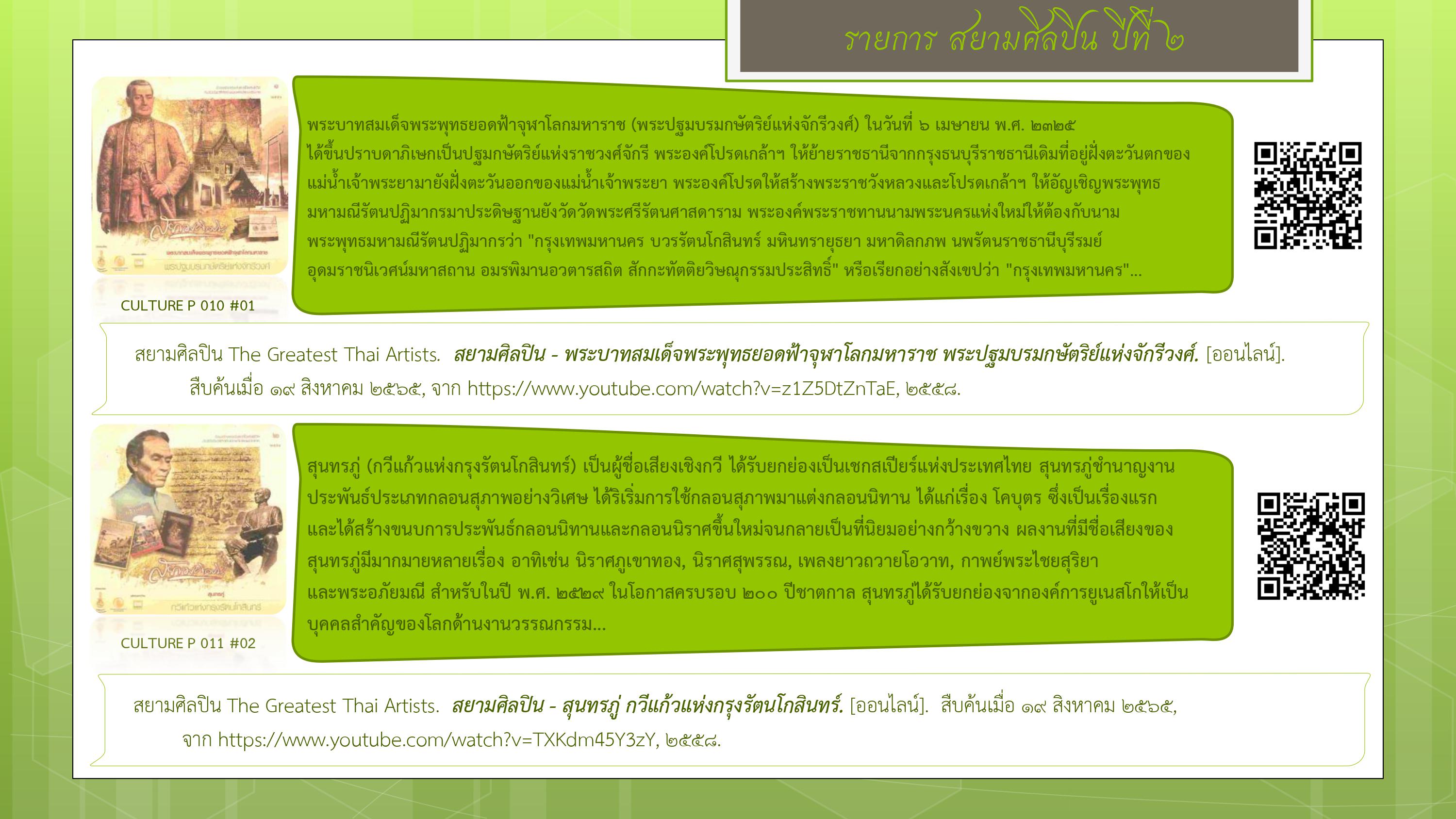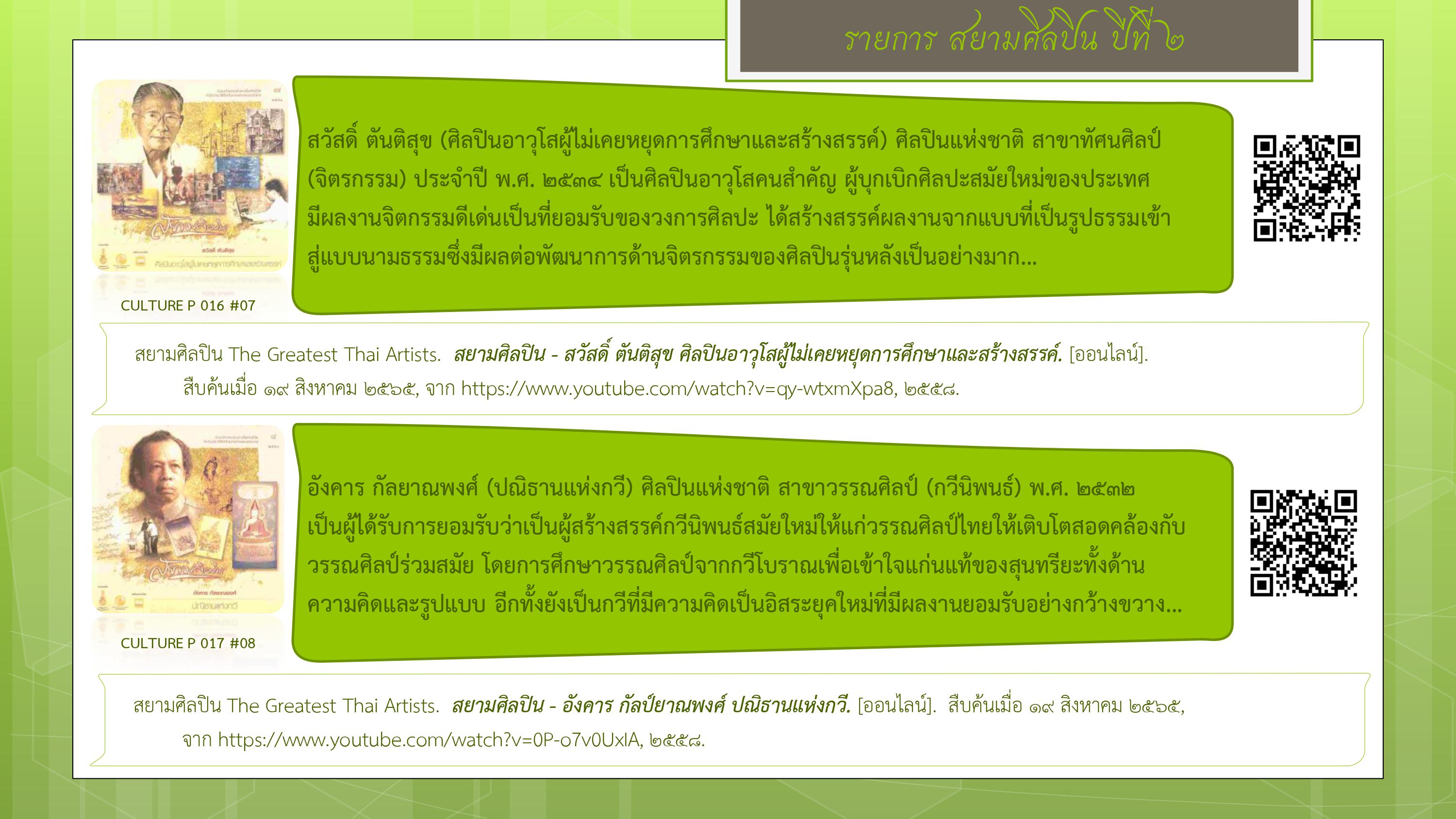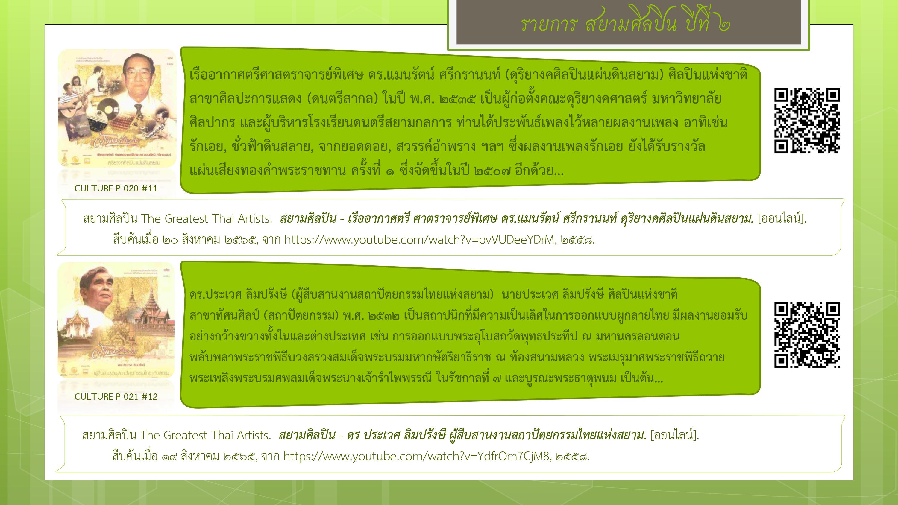 รายการ สยามศิลปิน ปีที่ ๒ เป็นรายการสารคดีอัตชีวประวัติศิลปินไทย ซึ่งผลิตขึ้นในนาม สำนักงานคณะกรรมการวัฒนธรรมแห่งชาติ และมูลนิธิศิลปินแห่งชาติ ในปีนี้ทางรายการได้จัดทำไว้เป็น ๑๒ ตอน ได้แก่ พระบาทสมเด็จพระพุทธยอดฟ้าจุฬาโลกมหาราช (พระปฐมบรมกษัตริย์แห่งจักรีวงศ์), สุนทรภู่ (กวีแก้วแห่งกรุงรัตนโกสินทร์), มนตรี ตราโมท (ปรมาจารย์ดุริยางคศาสตร์ไทย), เฟื้อ หริพิทักษ์ (ครูใหญ่ในวงการศิลปะ), เจริญใจ สุนทรวาทิน (ครูดนตรีไทยสี่แผ่นดิน), หวังดี นิมา หวังเต๊ะ (ไม้ใหญ่แห่งวงการศิลปะพื้นบ้านไทย), สวัสดิ์ ตันติสุข (ศิลปินอาวุโสผู้ไม่เคยหยุดการศึกษาและสร้างสรรค์), อังคาร กัลยาณพงศ์ (ปณิธานแห่งกวี), พินิจ สุวรรณะบุณย์ (ผู้ฝากผลงานไว้ในแผ่นดิน), อาจินต์ ปัญจพรรค์ (ร่ายยาวแห่งชีวิต), เรืออากาศตรีศาสตราจารย์พิเศษ ดร.แมนรัตน์ ศรีกรานนท์ (ดุริยางคศิลปินแผ่นดินสยาม) และดร.ประเวศ ลิมปรังษี (ผู้สืบสานงานสถาปัตยกรรมไทยแห่งสยาม)