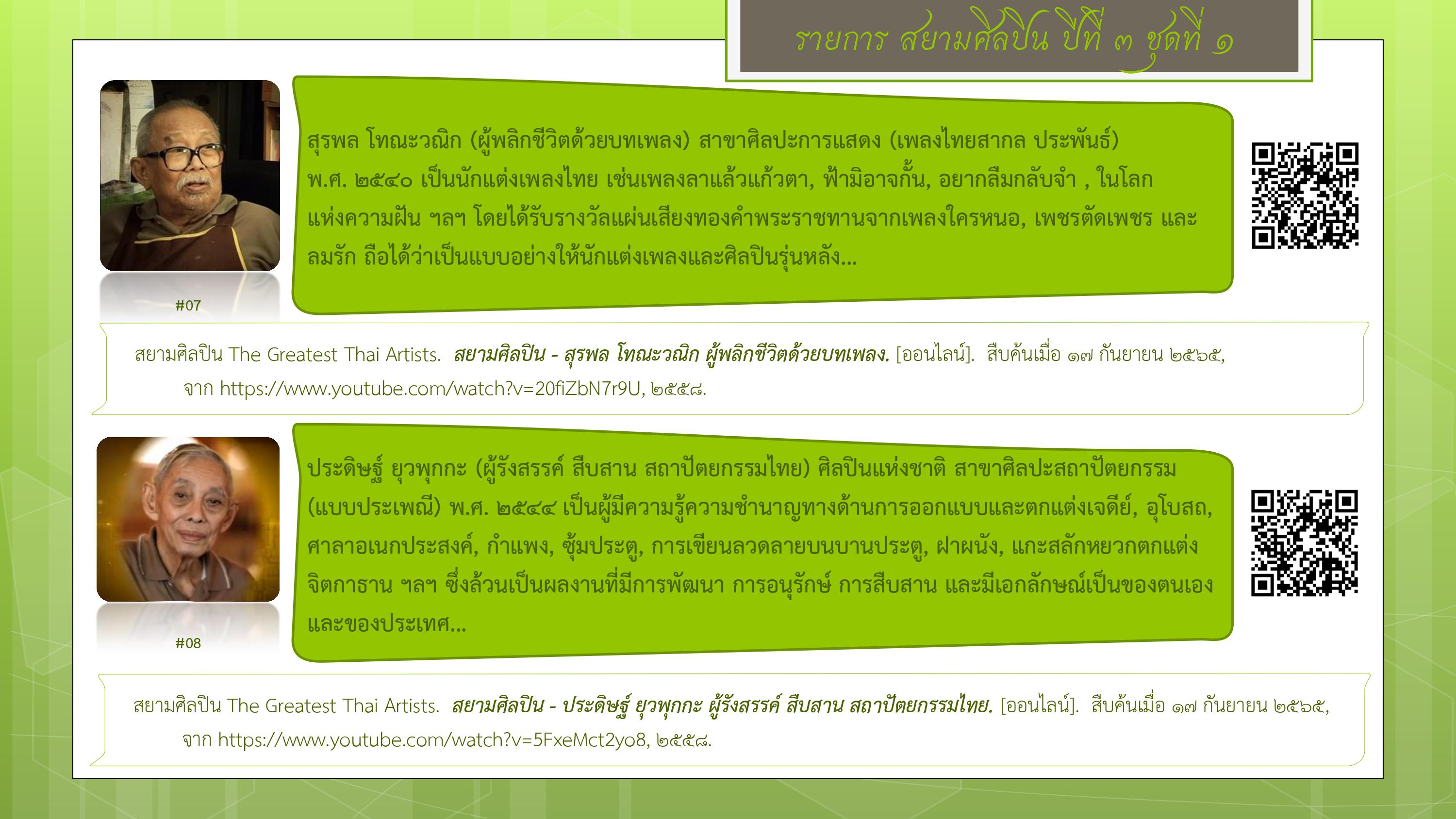 รายการ สยามศิลปิน ปีที่ ๓ ชุดที่ ๑ เป็นรายการสารคดีอัตชีวประวัติศิลปินไทย ซึ่งผลิตขึ้นในนาม กรมส่งเสริมวัฒนธรรม และมูลนิธิศิลปินแห่งชาติ ได้แก่ สมเด็จพระมหาธีรราชเจ้า (พระบาทสมเด็จพระมงกุฎเกล้าเจ้าอยู่หัว), ศาสตราจารย์เกียรติคุณชลูด นิ่มเสมอ (เสาหลักการศึกษาศิลปะสมัยใหม่ของไทย), เอื้อ สุนทรสนาน (ขุนพลเพลงแห่งกรุงรัตนโกสินทร์ คีตศิลปิน ๔ แผ่นดิน), พลอากาศตรีอาวุธ เงินชูกลิ่น (สถาปนิกเอกสถาปัตยกรรมไทย), เสนีย์ เสาวพงศ์ (นักเดินทางผู้ฝากรอยหมึกไว้บนผืนแผ่นดิน), ประยูร ยมเยี่ยม (แม่ครูเพลงพื้นบ้านคนสำคัญของแผ่นดิน ศิลปินของประชาชน), สุรพล โทณะวณิก (ผู้พลิกชีวิตด้วยบทเพลง), ประดิษฐ์ ยุวพุกกะ (ผู้รังสรรค์ สืบสาน สถาปัตยกรรมไทย), หม่อมราชวงศ์คึกฤทธิ์ ปราโมช (ปราชญ์แห่งสยาม และบุคคลสำคัญของโลก), แท้ ประกาศวุฒิสาร (สุภาพบุรุษเสือแท้)