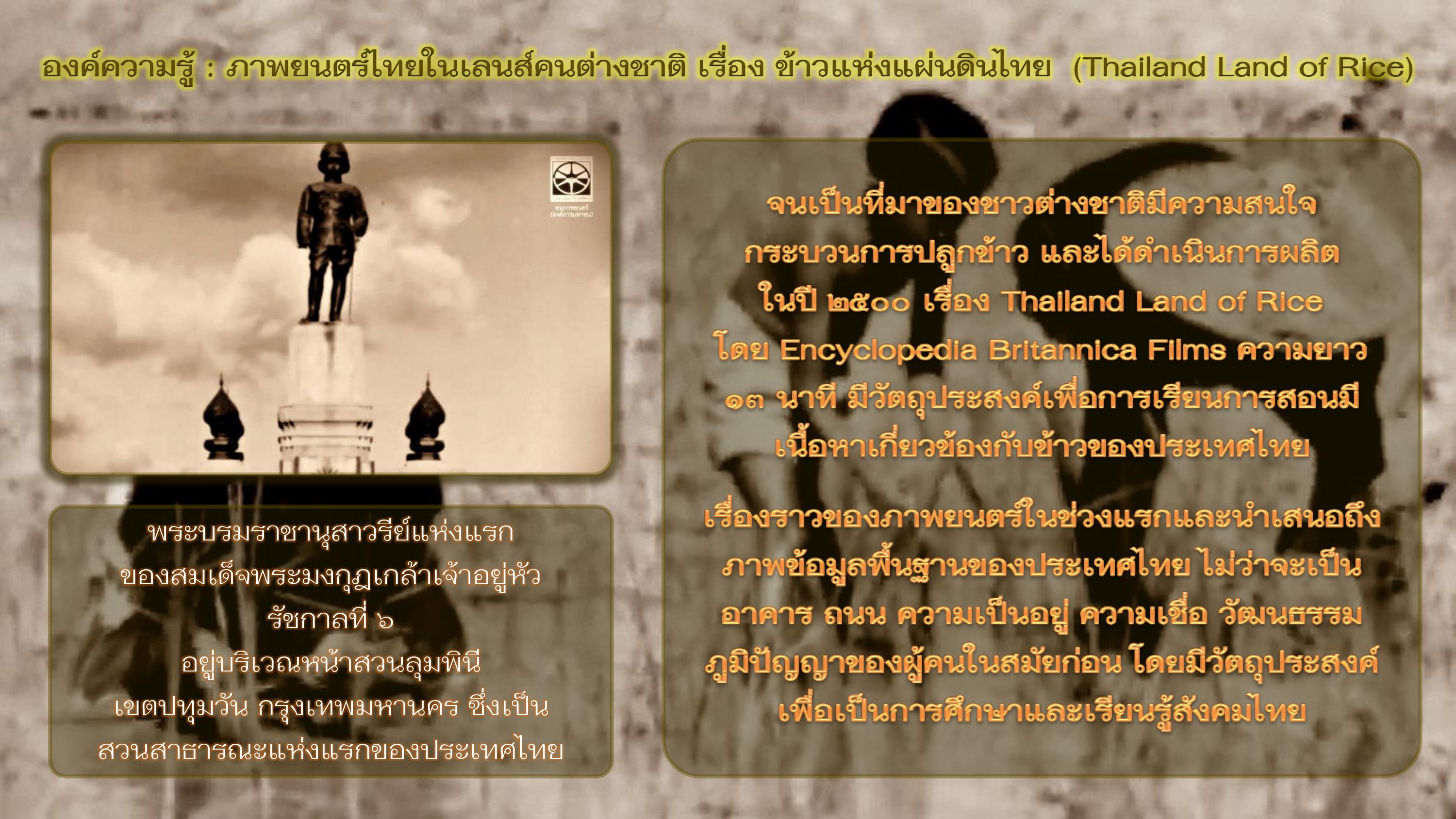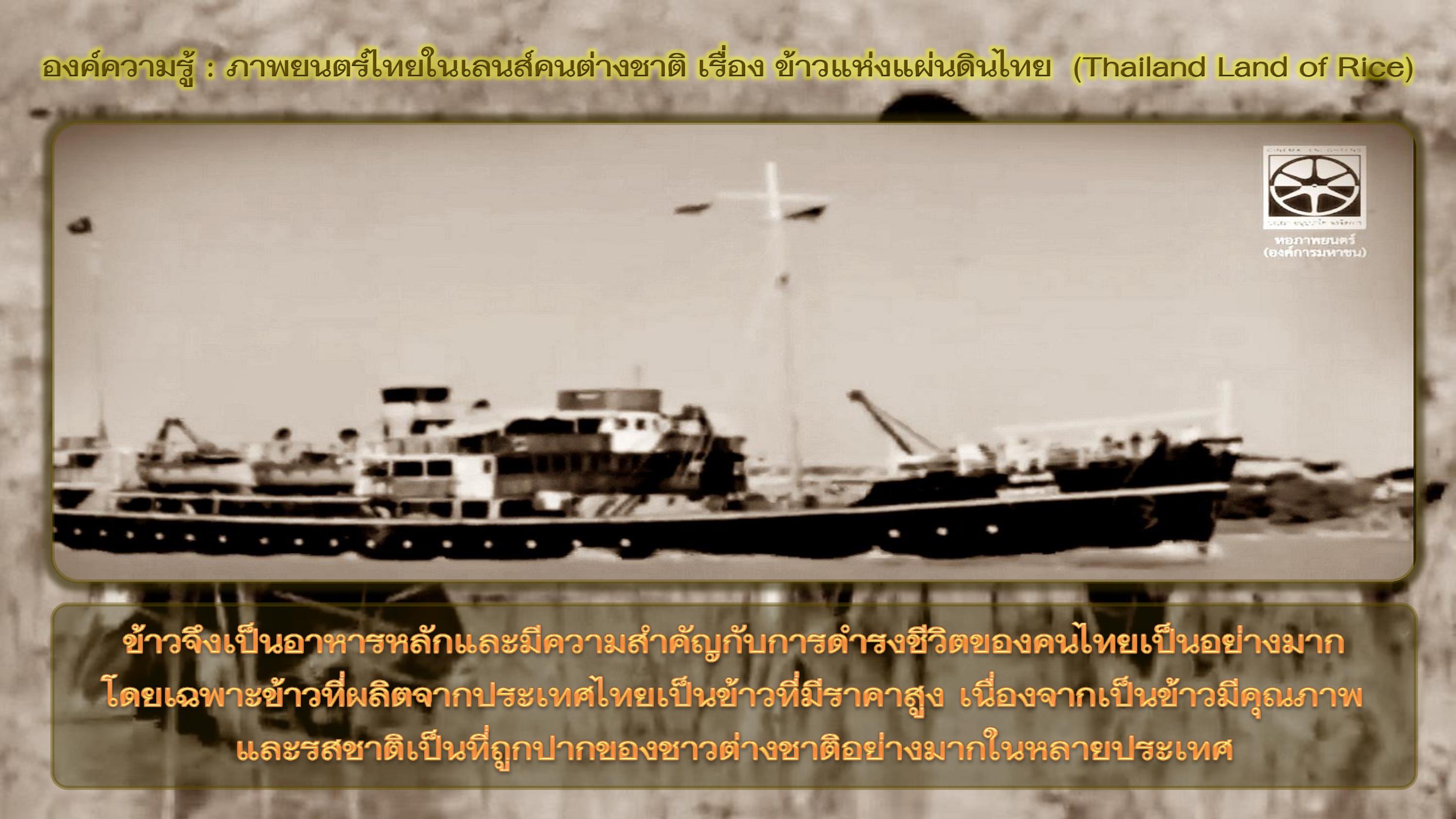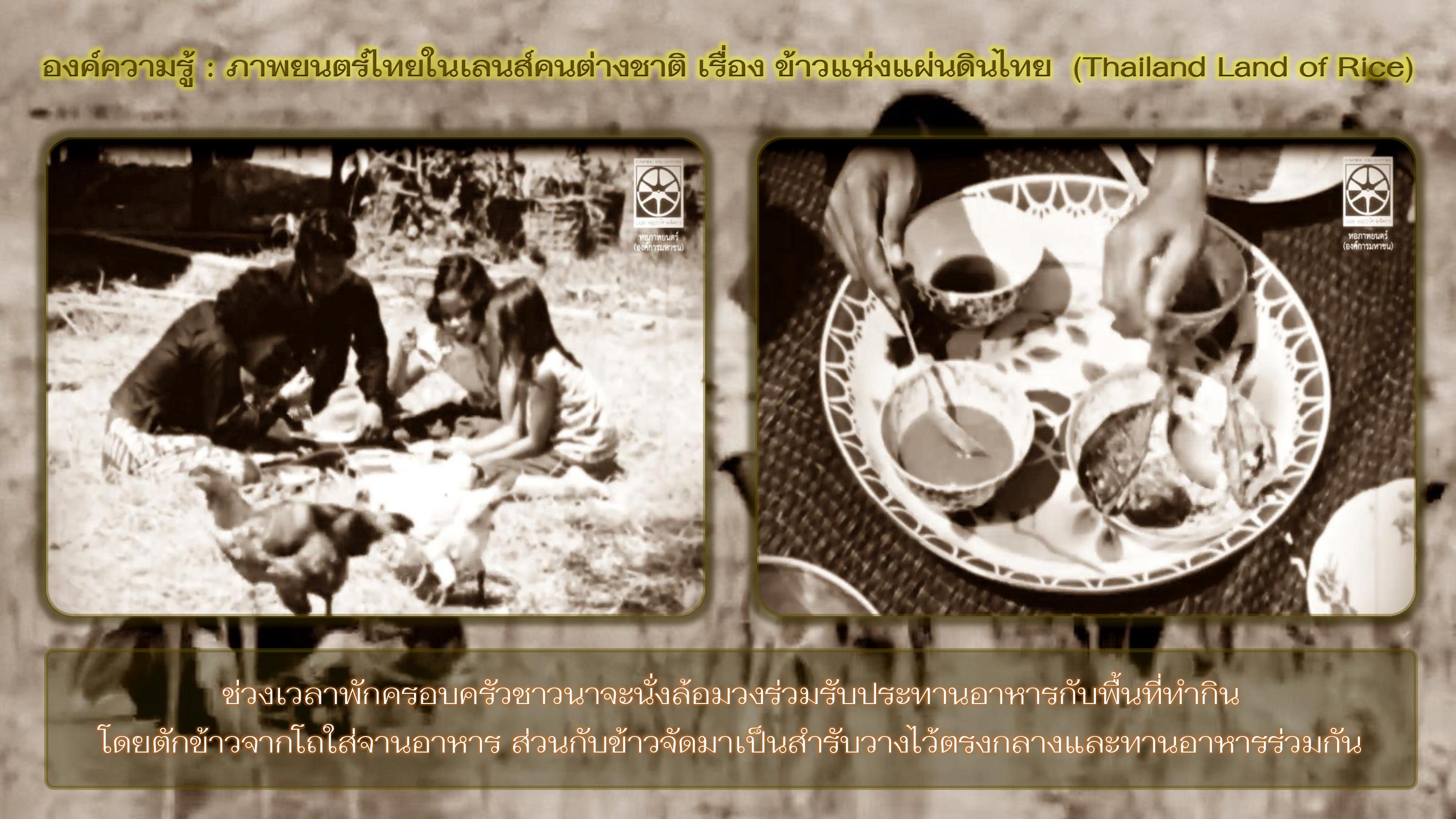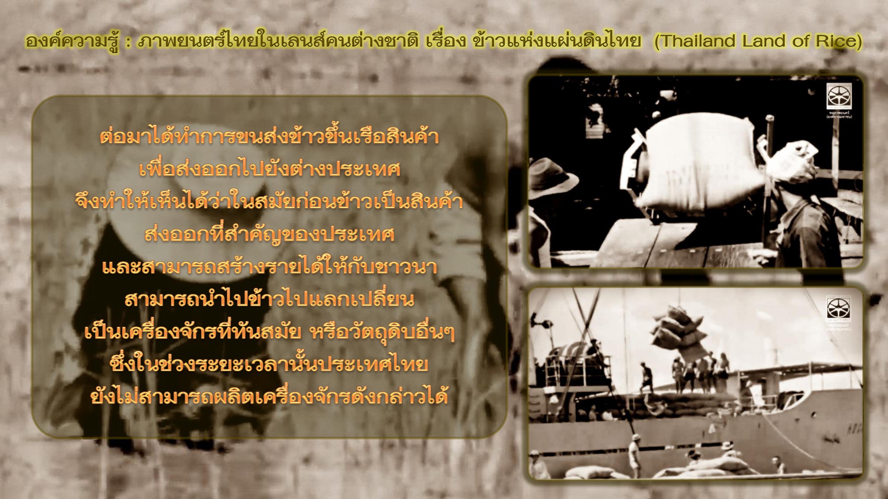 ในสมัยโบราณข้าวมีบทบาทที่สำคัญต่อวิถีชีวิตแห่งชีวิตของคนไทยและผูกพันกันมานาน ในอดีตการทำนาข้าวได้ใช้แรงงานสัตว์ไม่ว่าจะเป็นวัวหรือควายในการไถนา และการใช้แรงงานคนเป็นส่วนใหญ่ ข้าวจึงเป็นปัจจัยสำคัญในการบริโภค หรือการแลกเปลี่ยนกับปัจจัยอื่นๆ ที่จำเป็นต่อการดำรงชีวิต เช่น เสื้อผ้า ยารักษาโรค หรืออาหารประเภทอื่นๆ ที่ไม่สามารถผลิตเองได้ ข้าวที่ผลิตจากประเทศไทยเป็นข้าวที่คุณภาพและมีความหลากหลายและเป็นที่สนใจอย่างมากจากชาวต่างชาติ จนเป็นที่มาของชาวต่างชาติมีความสนใจกระบวนการปลูกข้าว และได้ดำเนินการผลิตในปี ๒๕๐๐ เรื่อง Thailand Land of Rice โดย Encyclopedia Britannica Films ความยาว ๑๓ นาที มีวัตถุประสงค์เพื่อการเรียนการสอนมีเนื้อหาเกี่ยวข้องกับข้าวของประเทศไทย