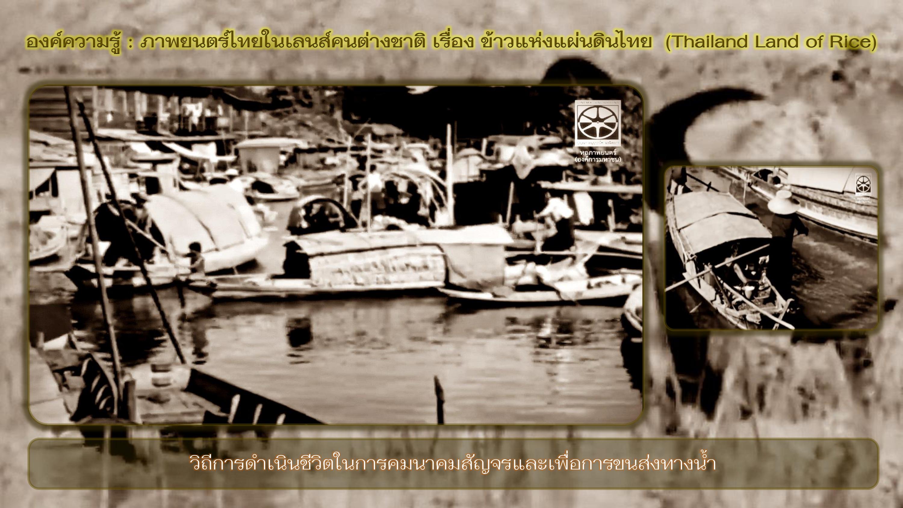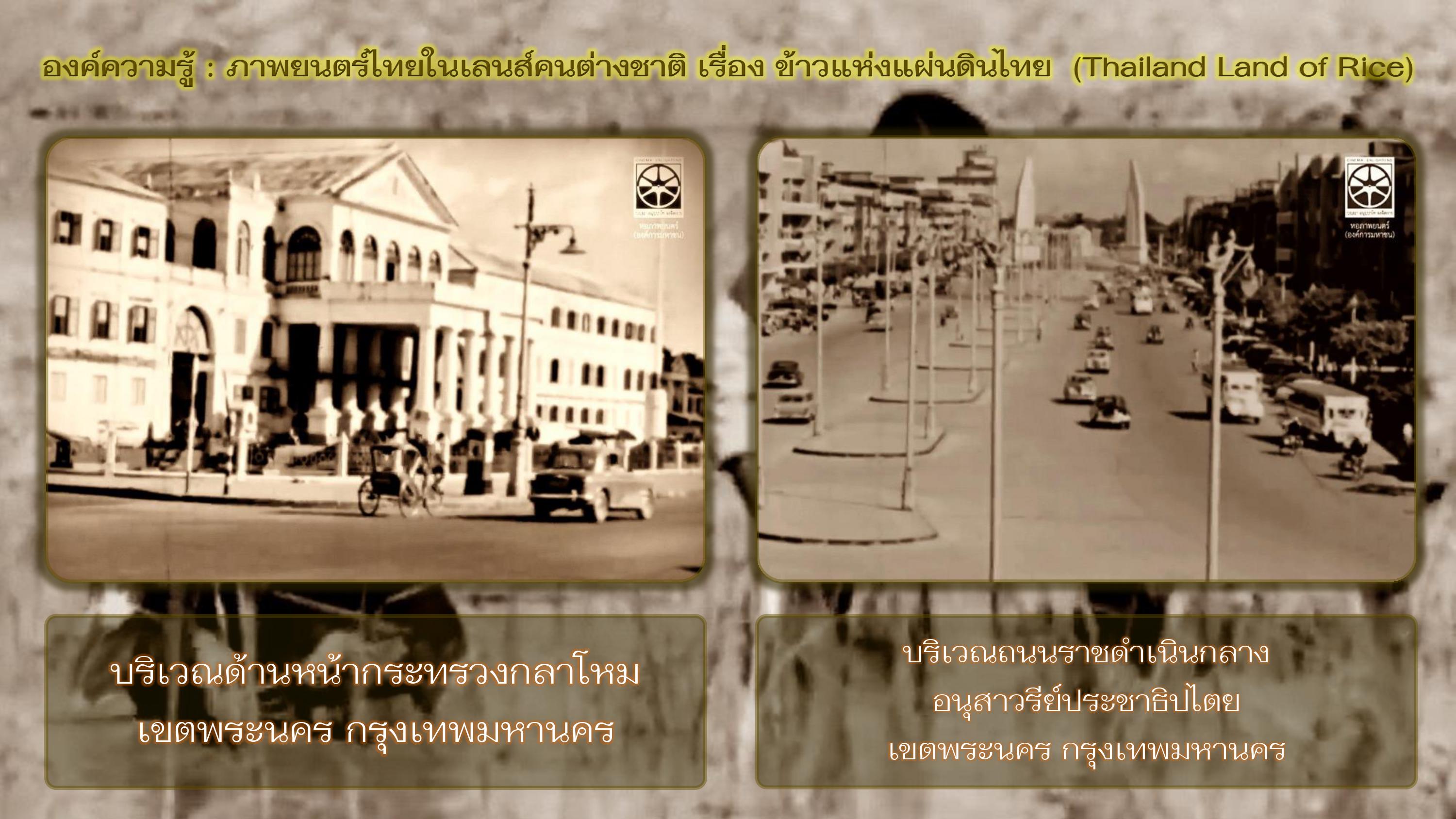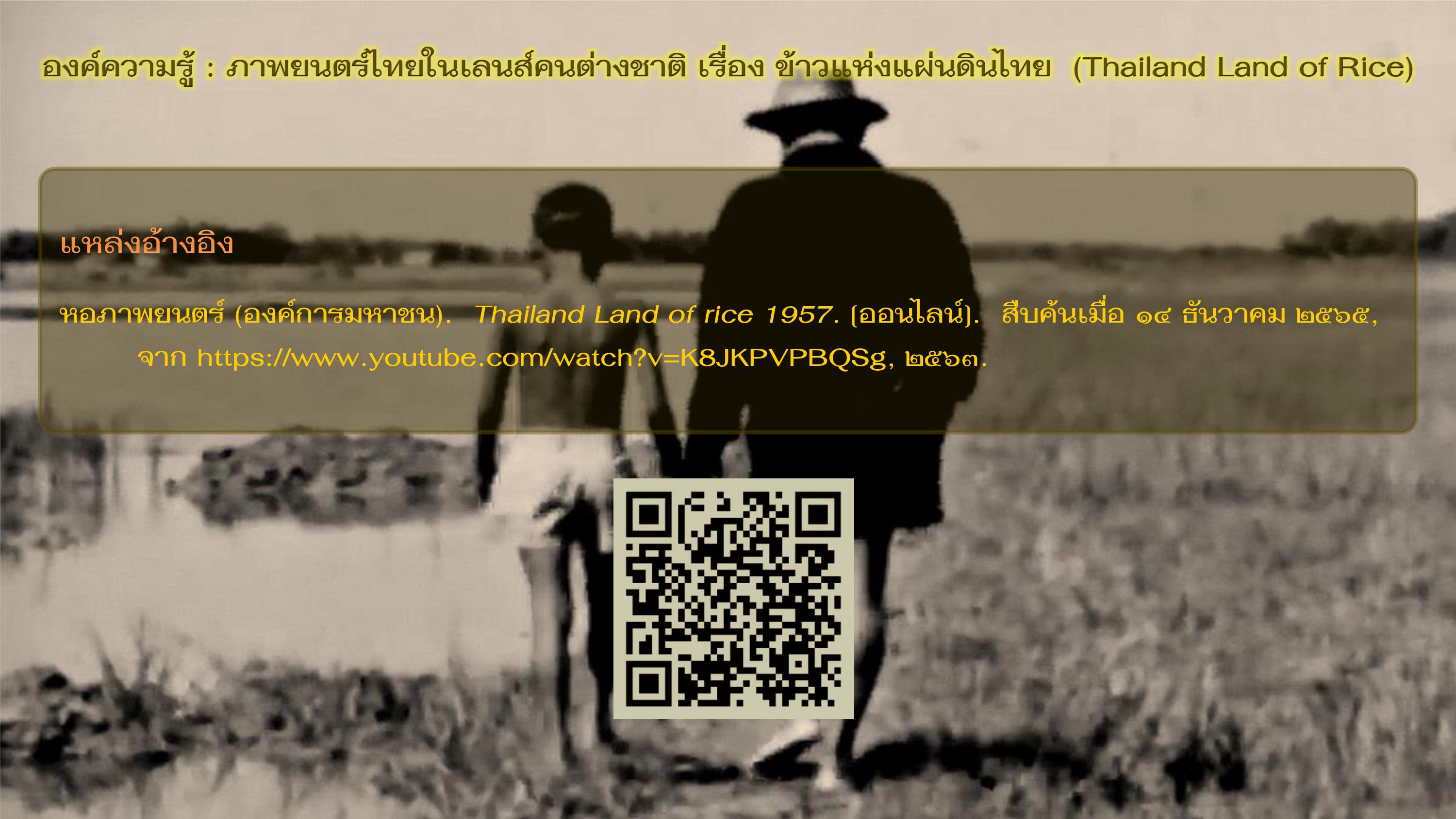 หอภาพยนตร์ (องค์การมหาชน). Thailand Land of rice 1957. [ออนไลน์]. สืบค้นเมื่อ ๑๔ ธันวาคม ๒๕๖๕, จาก https://www.youtube.com/watch?v=K8JKPVPBQSg, ๒๕๖๓.
