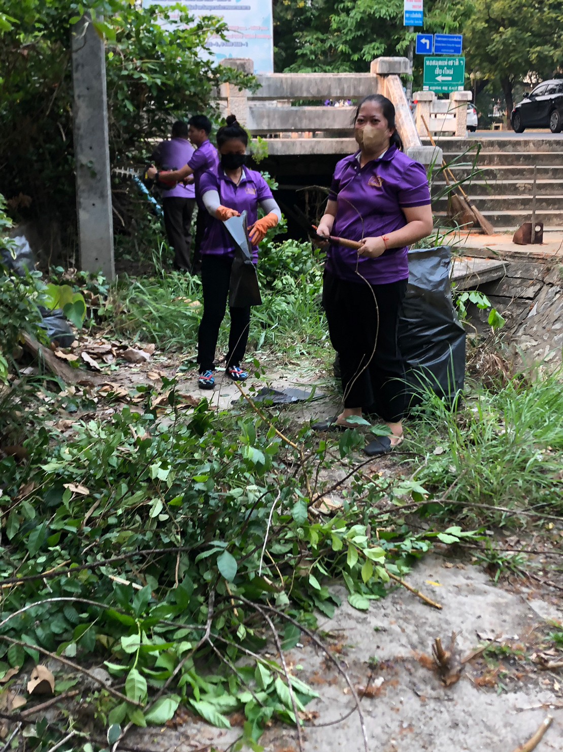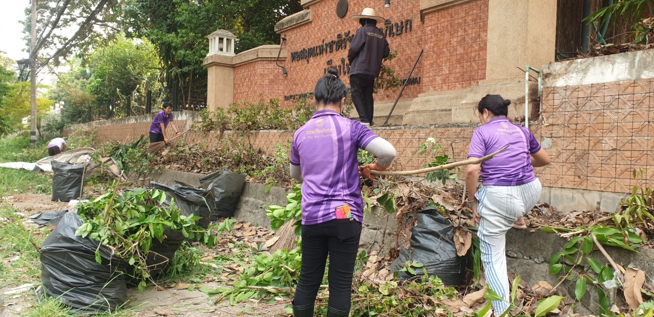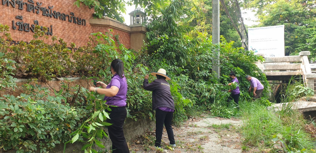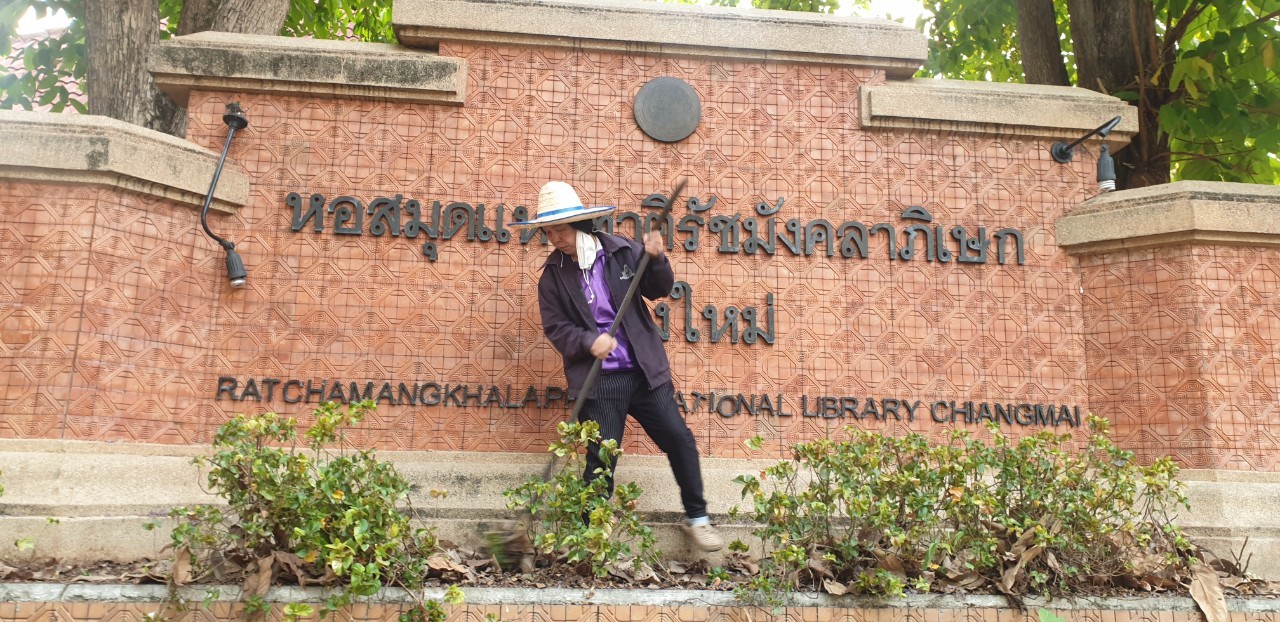 บุคลากรหอสมุดแห่งชาติรัชมังคลาภิเษก เชียงใหม่ ร่วมกันทำความสะอาดบริเวณด้านหน้าหอสมุดแห่งชาติรัชมังคลาภิเษก เชียงใหม่ ในกิจกรรมจิตอาสาพัฒนาแหล่งเรียนรู้ทางวัฒนธรรม เนื่องในวันอนุรักษ์มรดกไทย ประจำปี ๒๕๖๖
