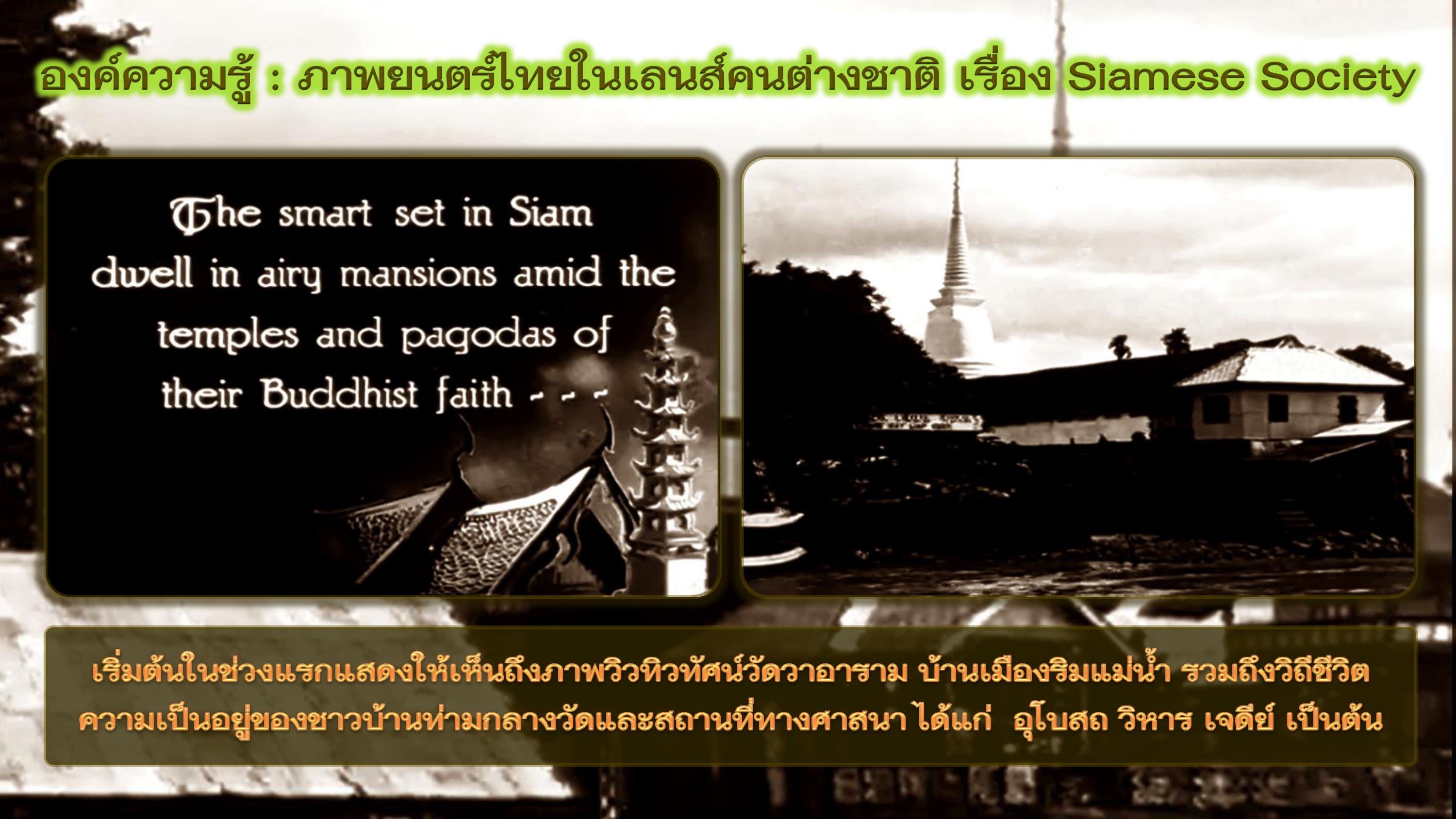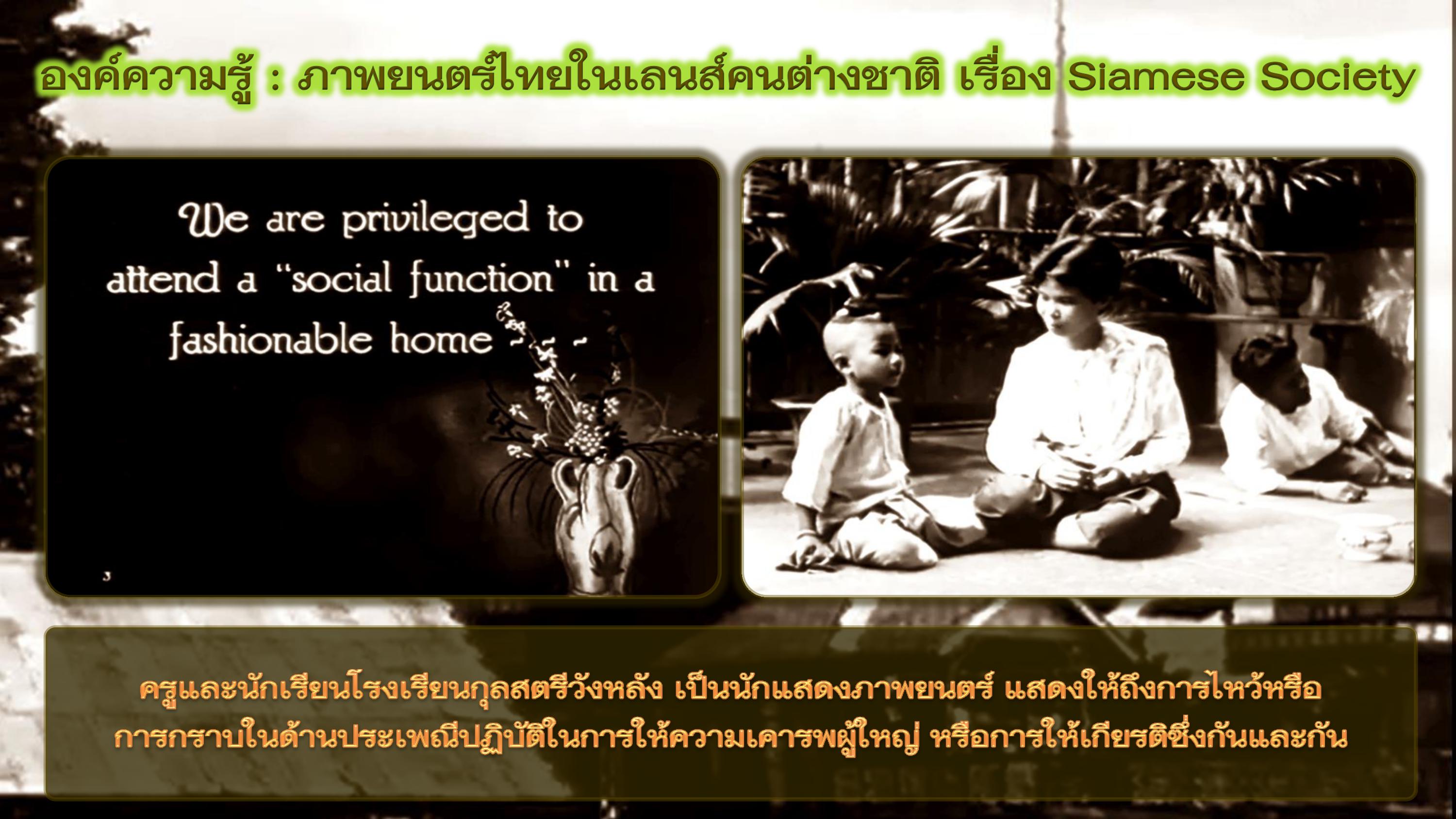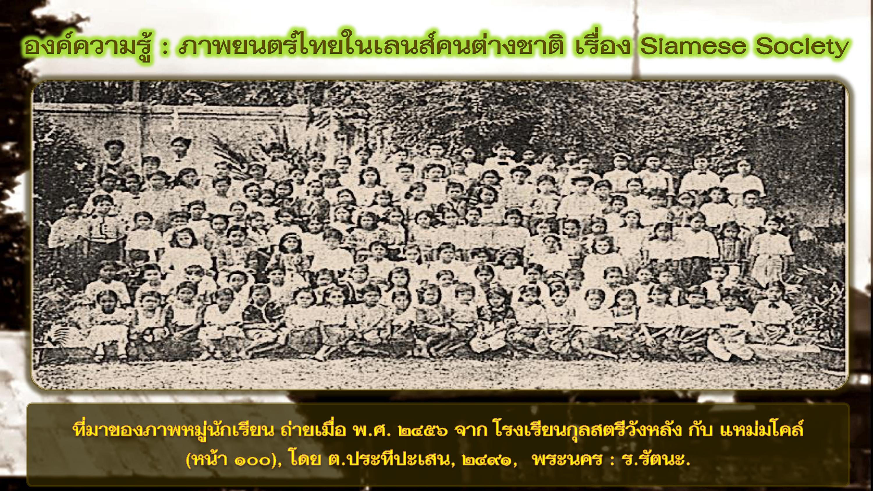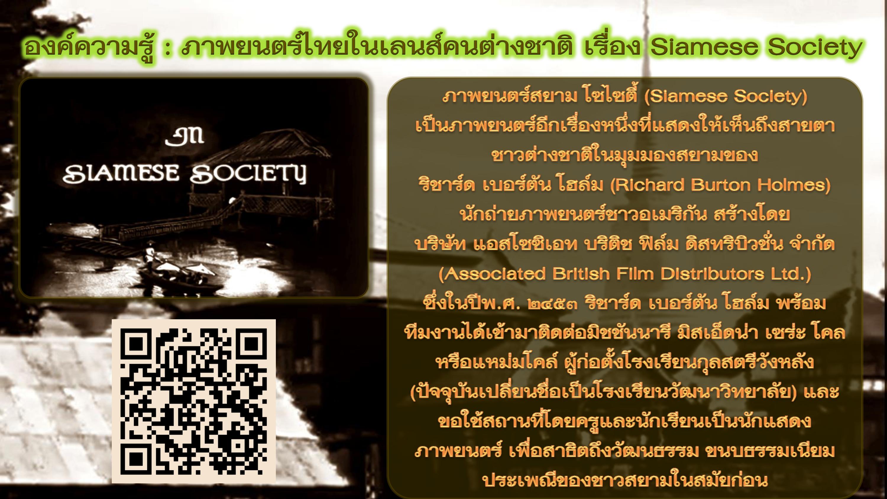 ภาพยนตร์สยาม โซไซตี้ (Siamese Society) เป็นภาพยนตร์อีกเรื่องหนึ่งที่แสดงให้เห็นถึงสายตาชาวต่างชาติในมุมมองสยามของ ริชาร์ด เบอร์ตัน โฮล์ม (Richard Burton Holmes) นักถ่ายภาพยนตร์ชาวอเมริกัน สร้างโดย บริษัท แอสโซซิเอท บริติช ฟิล์ม ดิสทริบิวชั่น จำกัด (Associated British Film Distributors Ltd.) ซึ่งในปีพ.ศ. ๒๔๕๓ ริชาร์ด เบอร์ตัน โฮล์ม พร้อมทีมงานได้เข้ามาติดต่อมิชชันนารี มิสเอ็ดน่า เซร่ะ โคล หรือแหม่มโคล ผู้ก่อตั้งโรงเรียนกุลสตรีวังหลัง (ปัจจุบันเปลี่ยนชื่อเป็นโรงเรียนวัฒนาวิทยาลัย) และขอใช้สถานที่โดยครูและนักเรียนเป็นนักแสดงภาพยนตร์ เพื่อสาธิตถึงวัฒนธรรม ขนบธรรมเนียมประเพณีของชาวสยามในสมัยก่อน...