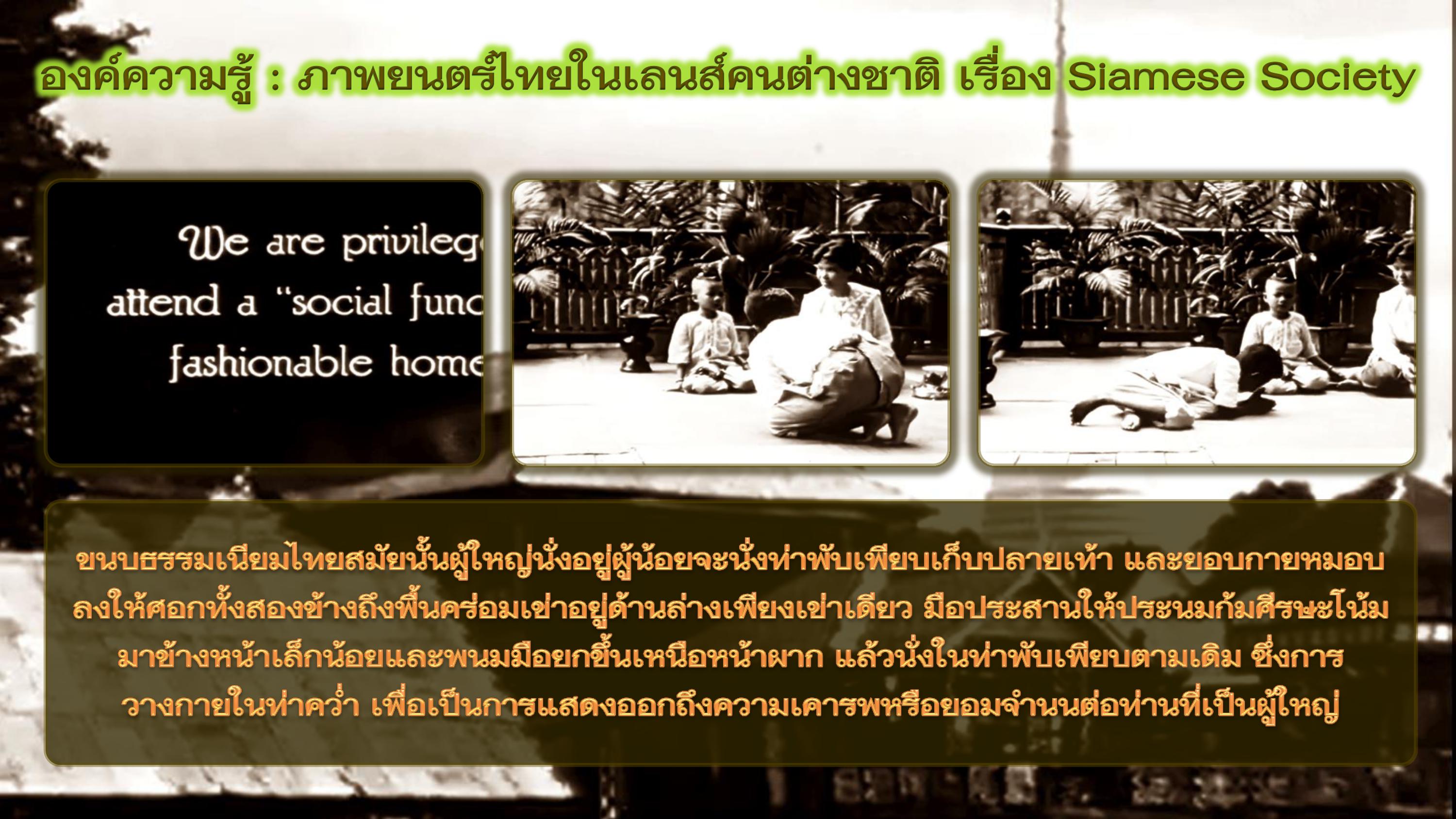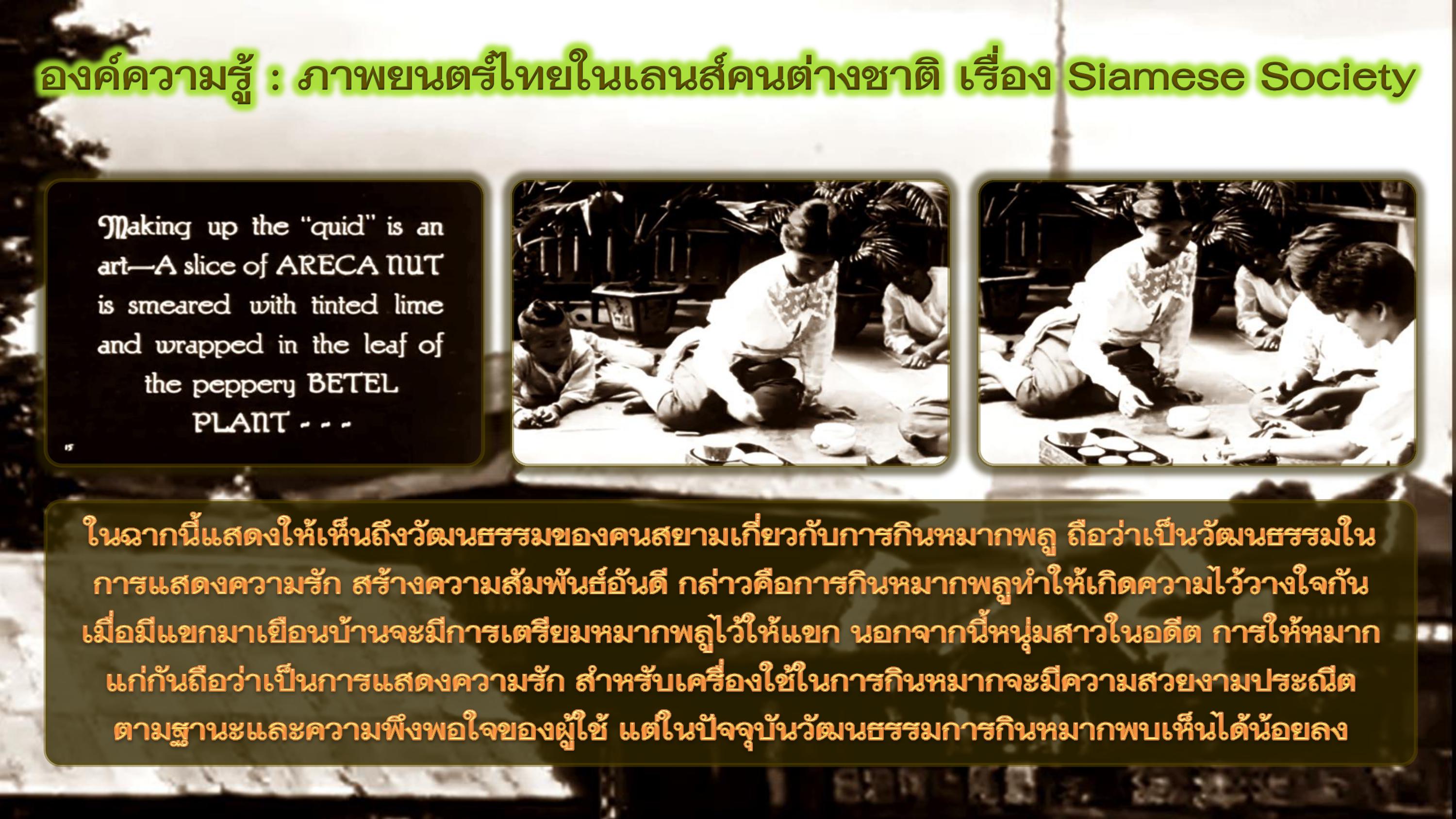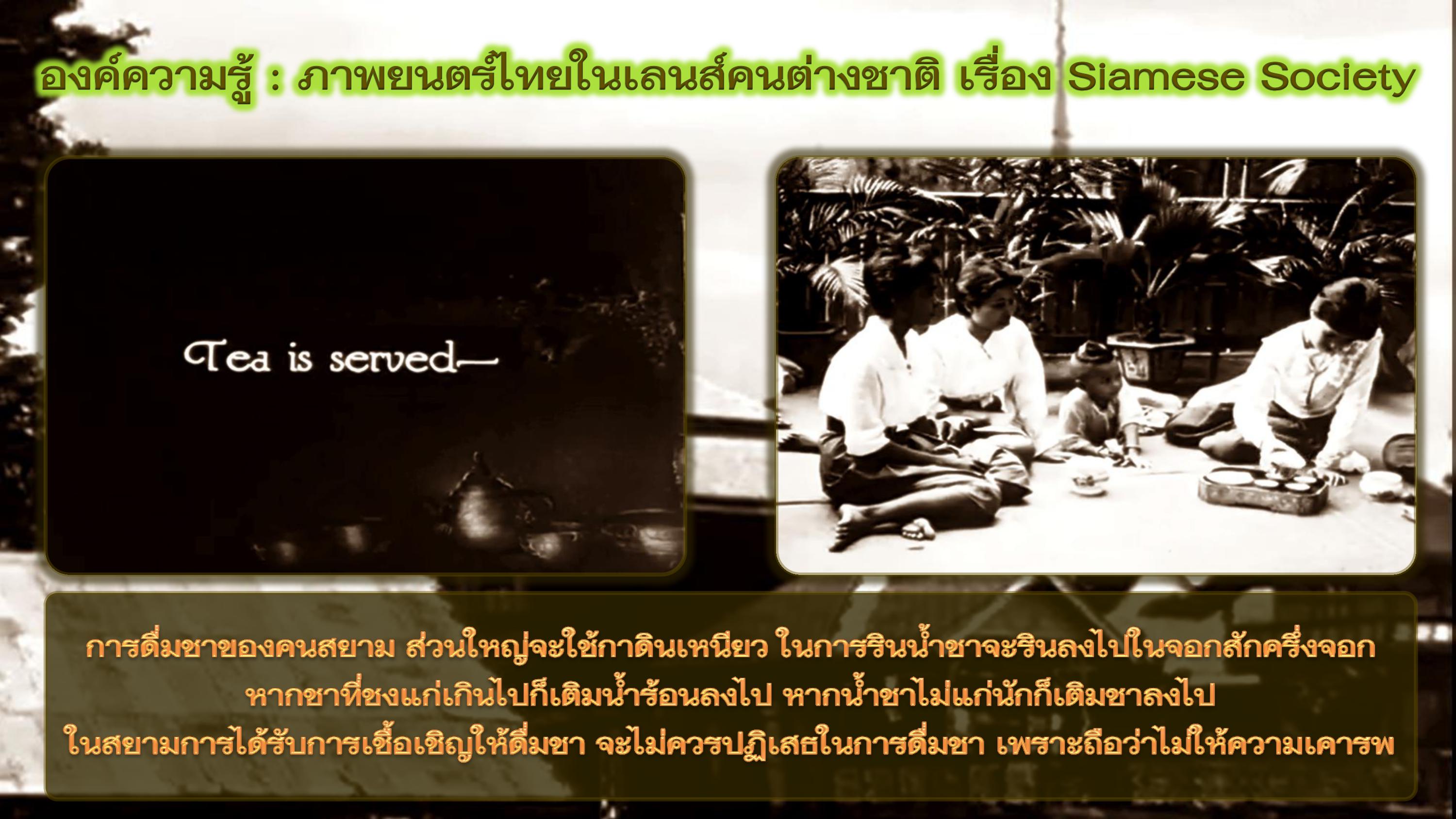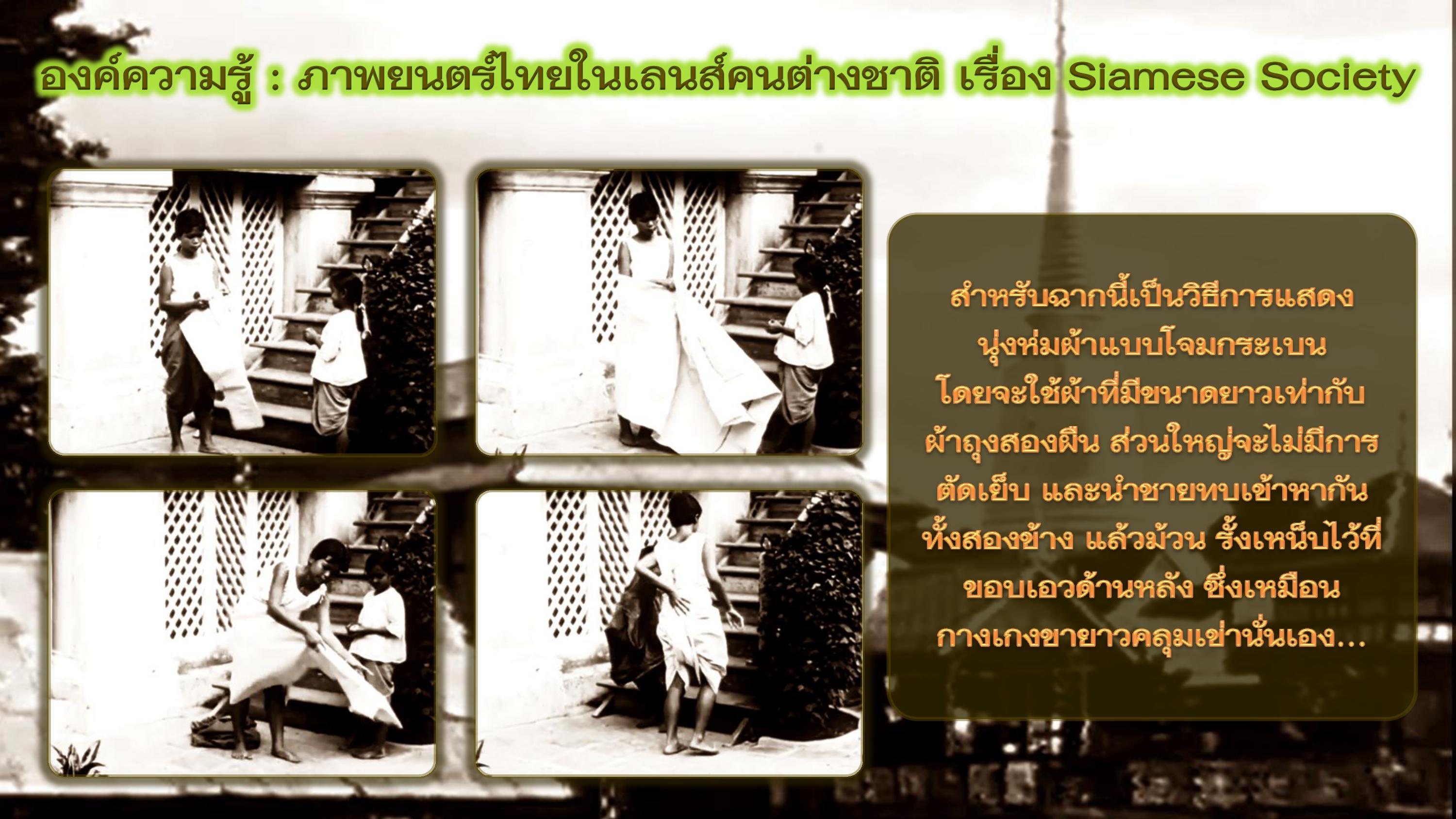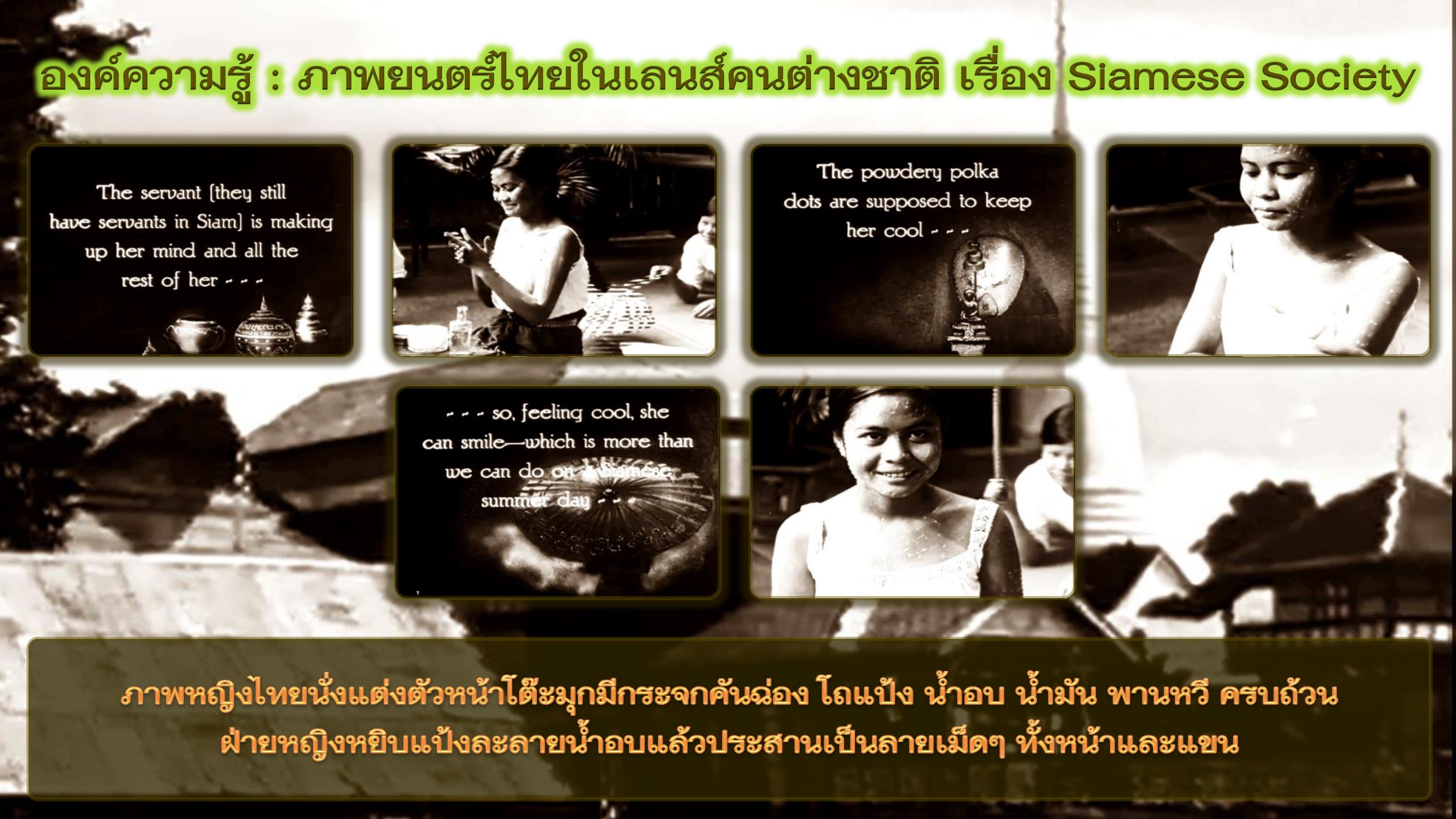 ภาพยนตร์สยาม โซไซตี้ (Siamese Society) เป็นภาพยนตร์อีกเรื่องหนึ่งที่แสดงให้เห็นถึงสายตาชาวต่างชาติในมุมมองสยามของ ริชาร์ด เบอร์ตัน โฮล์ม (Richard Burton Holmes) นักถ่ายภาพยนตร์ชาวอเมริกัน สร้างโดย บริษัท แอสโซซิเอท บริติช ฟิล์ม ดิสทริบิวชั่น จำกัด (Associated British Film Distributors Ltd.) ซึ่งในปีพ.ศ. ๒๔๕๓ ริชาร์ด เบอร์ตัน โฮล์ม พร้อมทีมงานได้เข้ามาติดต่อมิชชันนารี มิสเอ็ดน่า เซร่ะ โคล หรือแหม่มโคล ผู้ก่อตั้งโรงเรียนกุลสตรีวังหลัง (ปัจจุบันเปลี่ยนชื่อเป็นโรงเรียนวัฒนาวิทยาลัย) และขอใช้สถานที่โดยครูและนักเรียนเป็นนักแสดงภาพยนตร์ เพื่อสาธิตถึงวัฒนธรรม ขนบธรรมเนียมประเพณีของชาวสยามในสมัยก่อน...