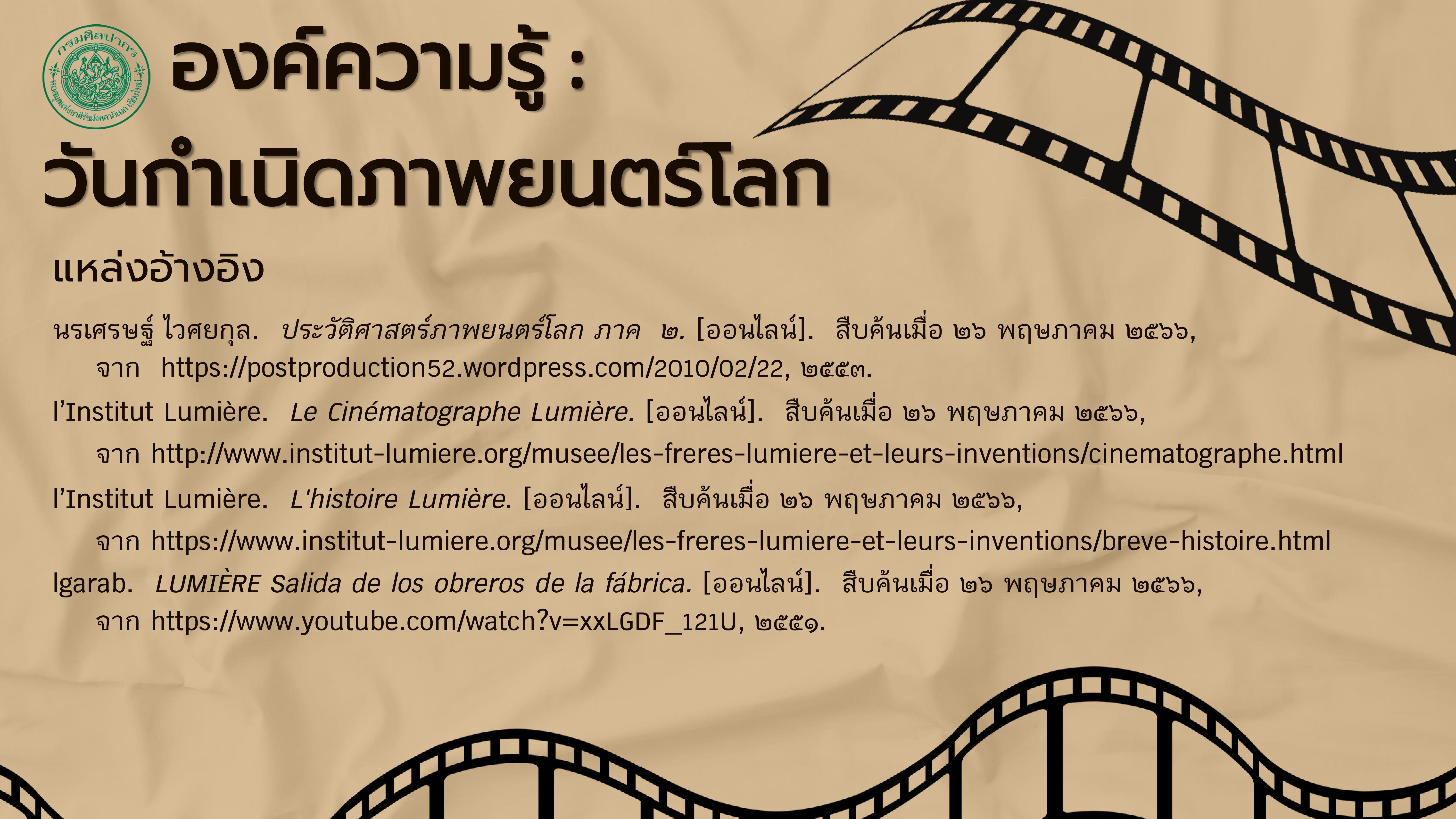 lgarab. LUMIÈRE Salida de los obreros de la fábrica. [ออนไลน์]. สืบค้นเมื่อ ๒๖ พฤษภาคม ๒๕๖๖, จาก https://www.youtube.com/watch?v=xxLGDF_121U, ๒๕๕๑.