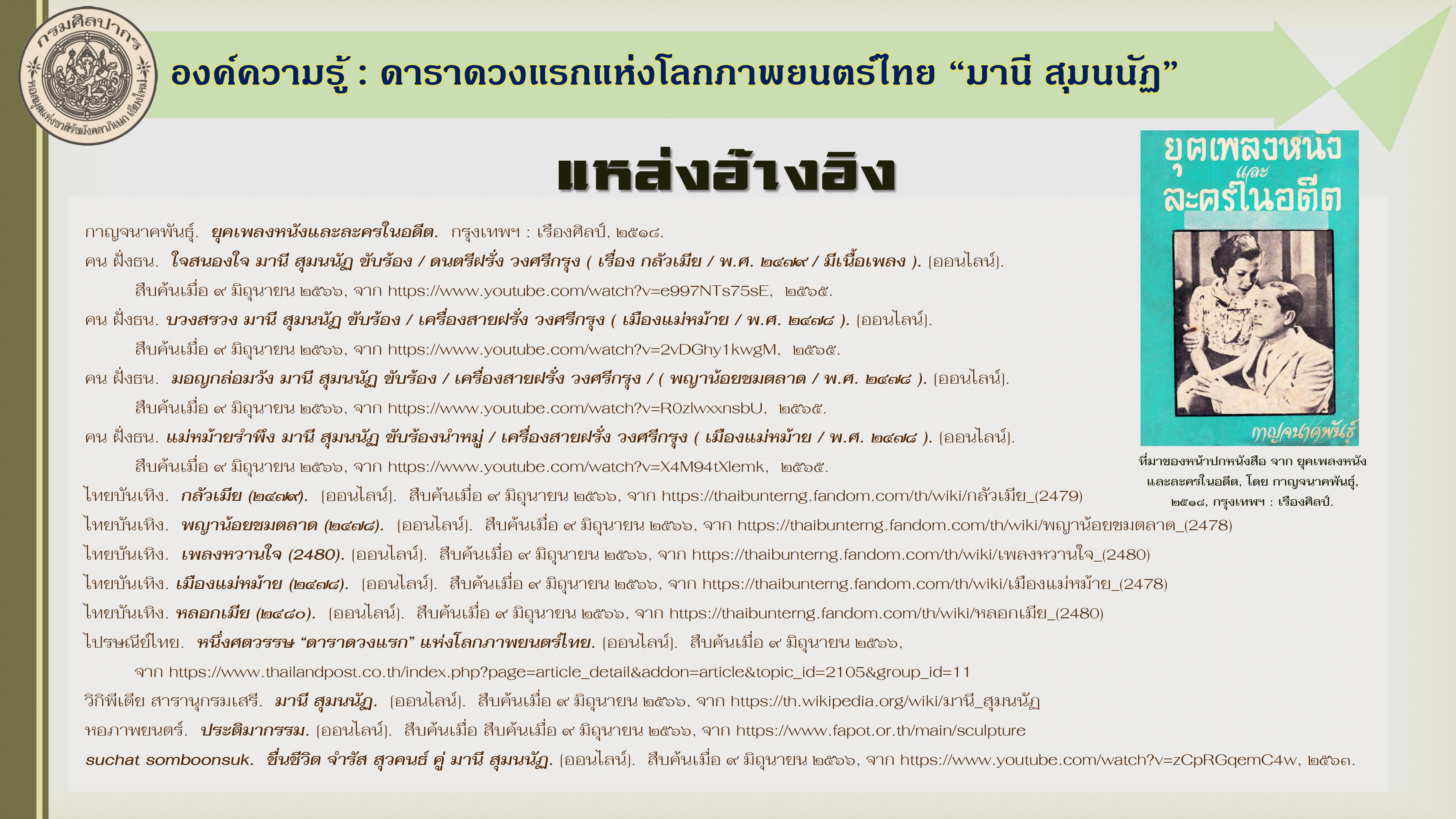 วิกิพีเดีย สารานุกรมเสรี. มานี สุมนนัฏ. [ออนไลน์]. สืบค้นเมื่อ ๙ มิถุนายน ๒๕๖๖, จาก https://th.wikipedia.org/wiki/มานี_สุมนนัฏ