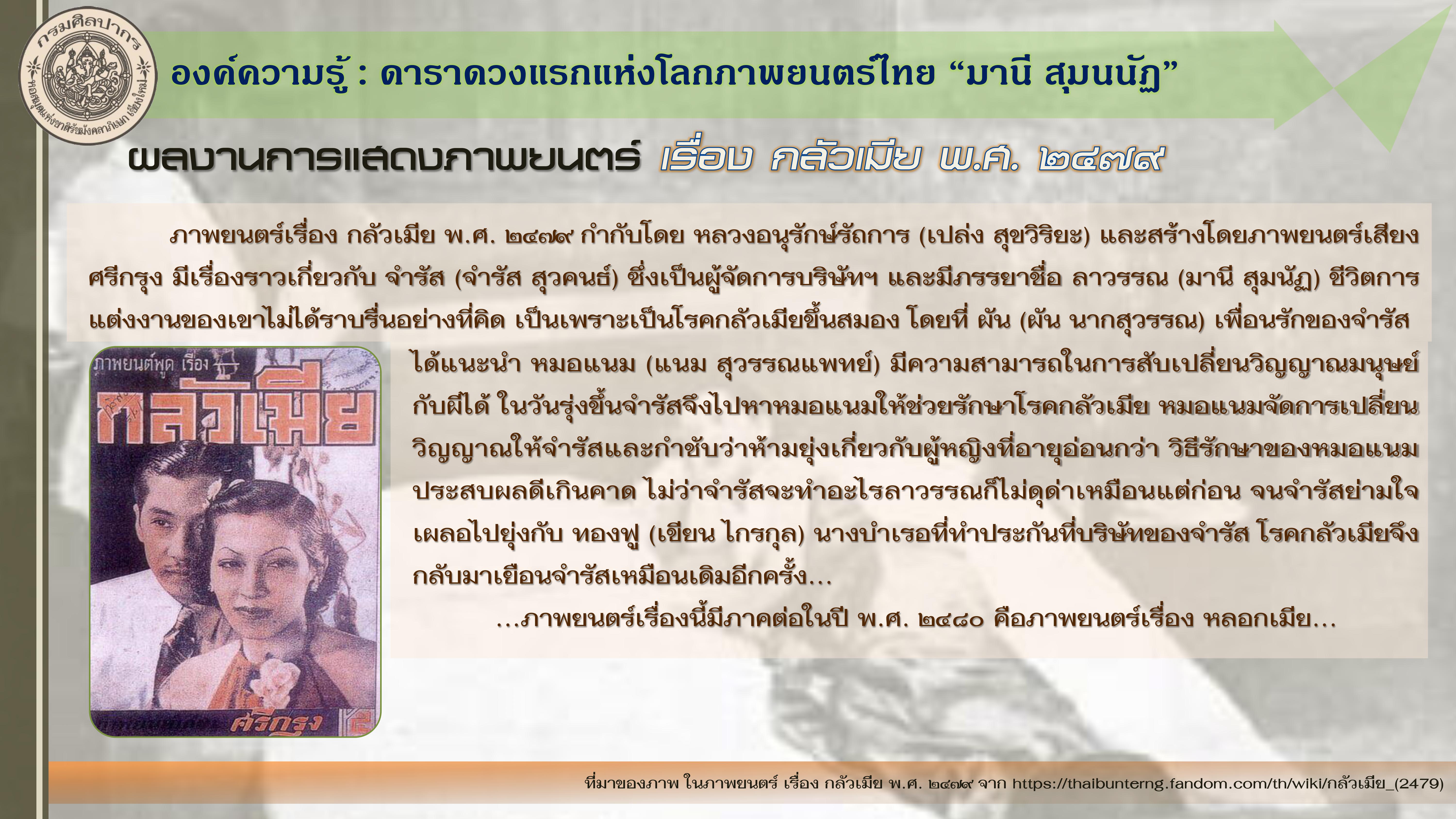 ไทยบันเทิง. กลัวเมีย (๒๔๗๙). [ออนไลน์]. สืบค้นเมื่อ ๙ มิถุนายน ๒๕๖๖, จาก https://thaibunterng.fandom.com/th/wiki/กลัวเมีย_(2479)