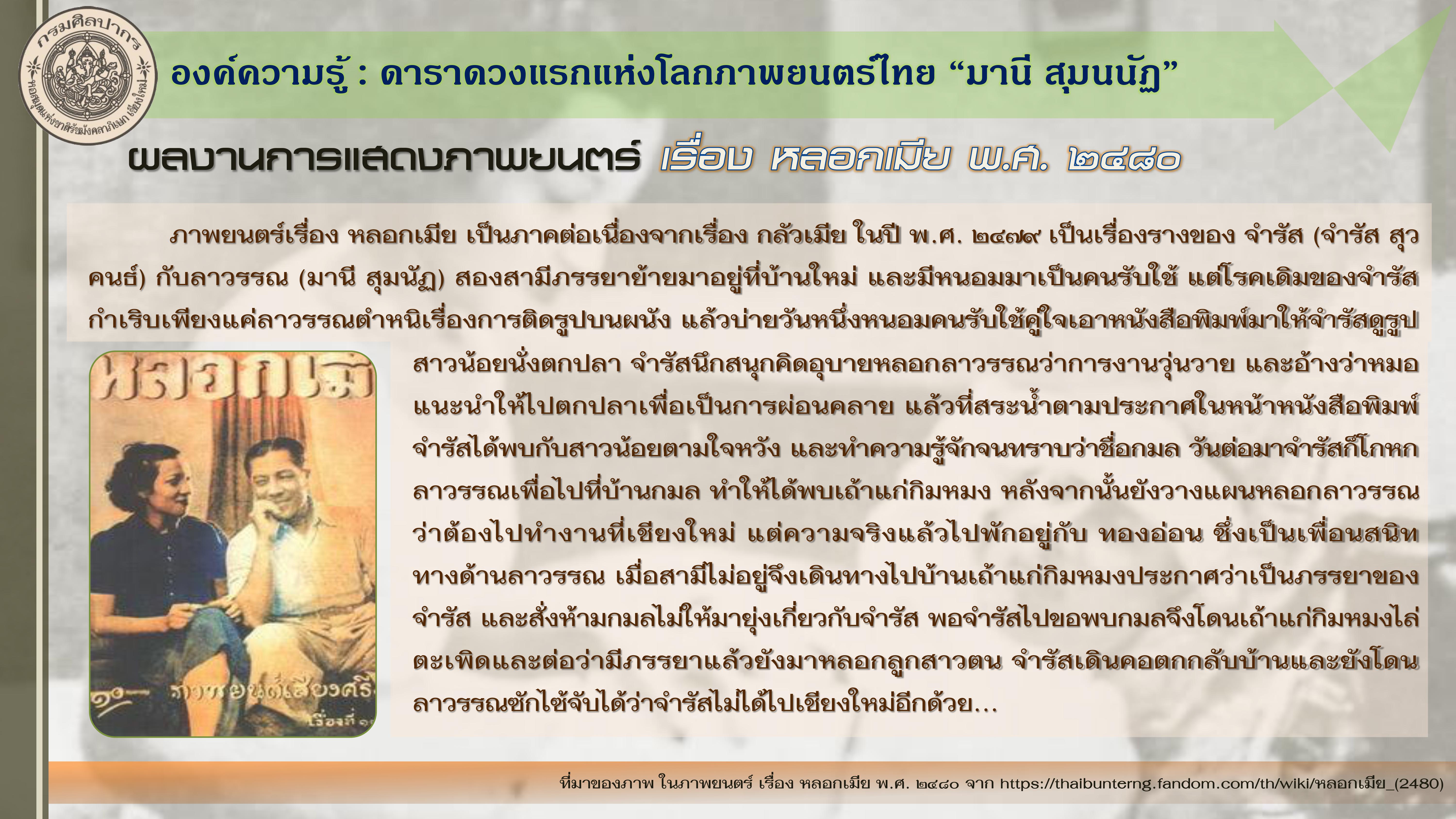 ไทยบันเทิง. หลอกเมีย (๒๔๘๐). [ออนไลน์]. สืบค้นเมื่อ ๙ มิถุนายน ๒๕๖๖, จาก https://thaibunterng.fandom.com/th/wiki/หลอกเมีย_(2480)