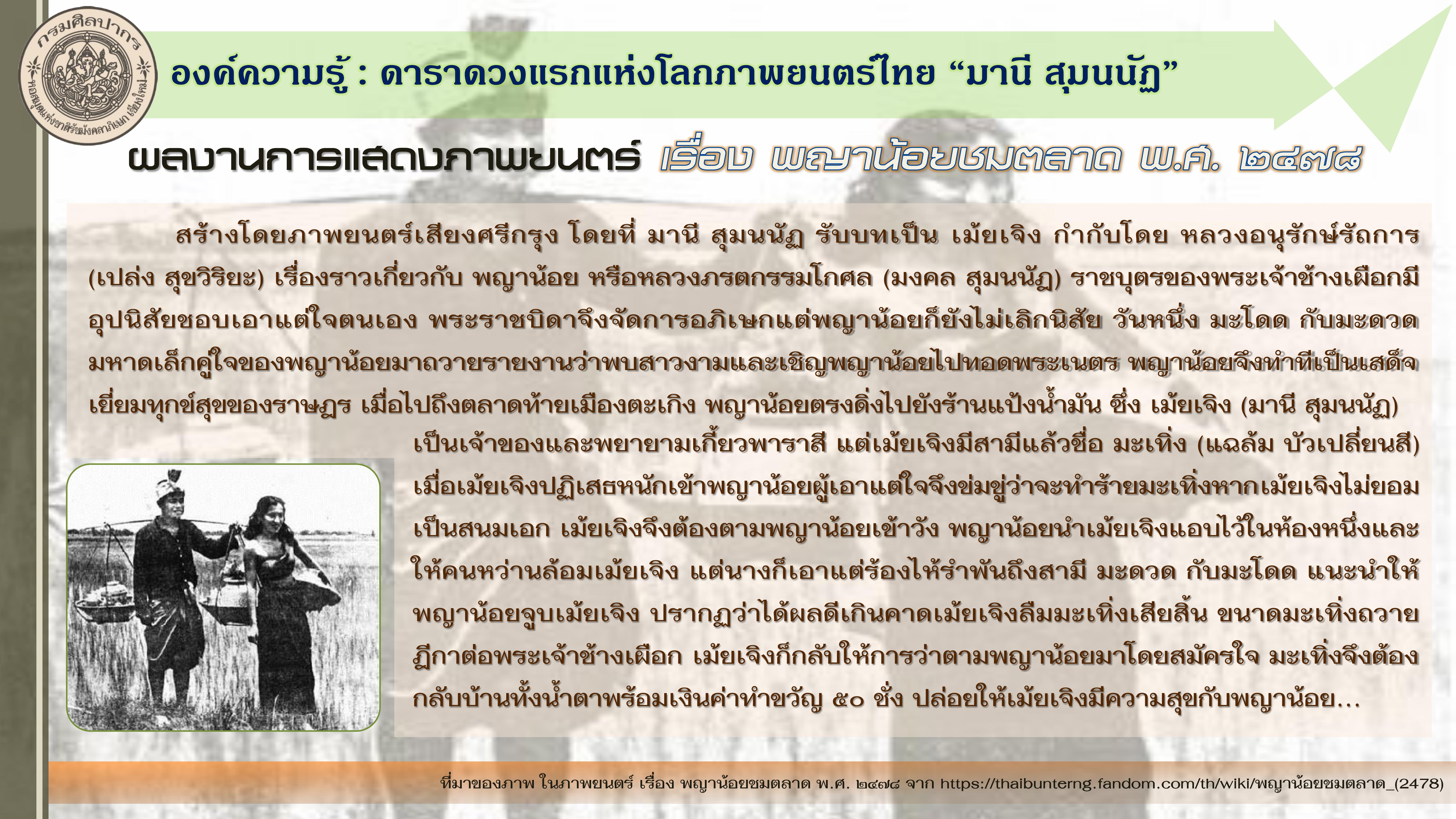 ไทยบันเทิง. พญาน้อยชมตลาด (๒๔๗๘). [ออนไลน์]. สืบค้นเมื่อ ๙ มิถุนายน ๒๕๖๖, จาก https://thaibunterng.fandom.com/th/wiki/พญาน้อยชมตลาด_(2478)