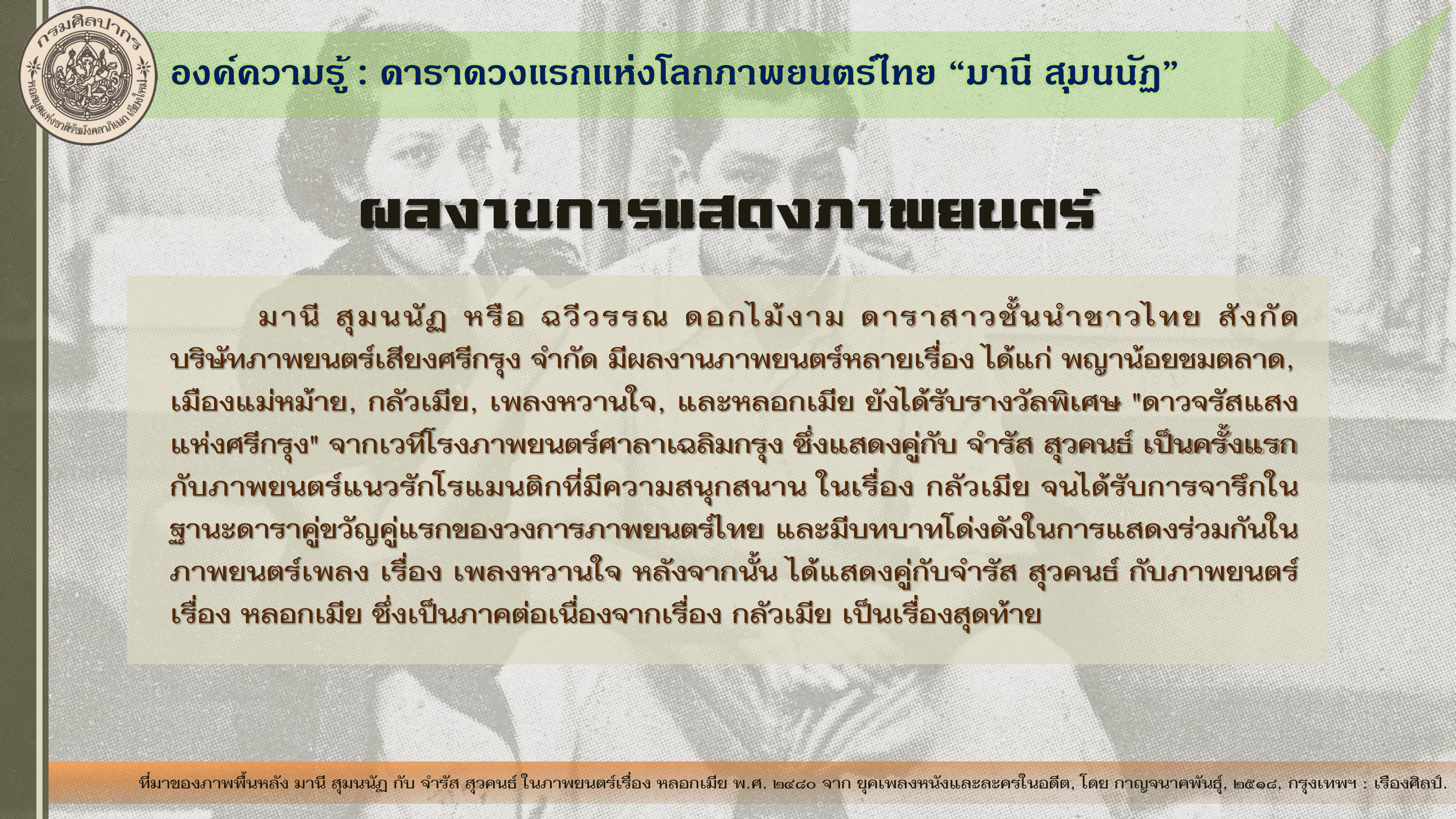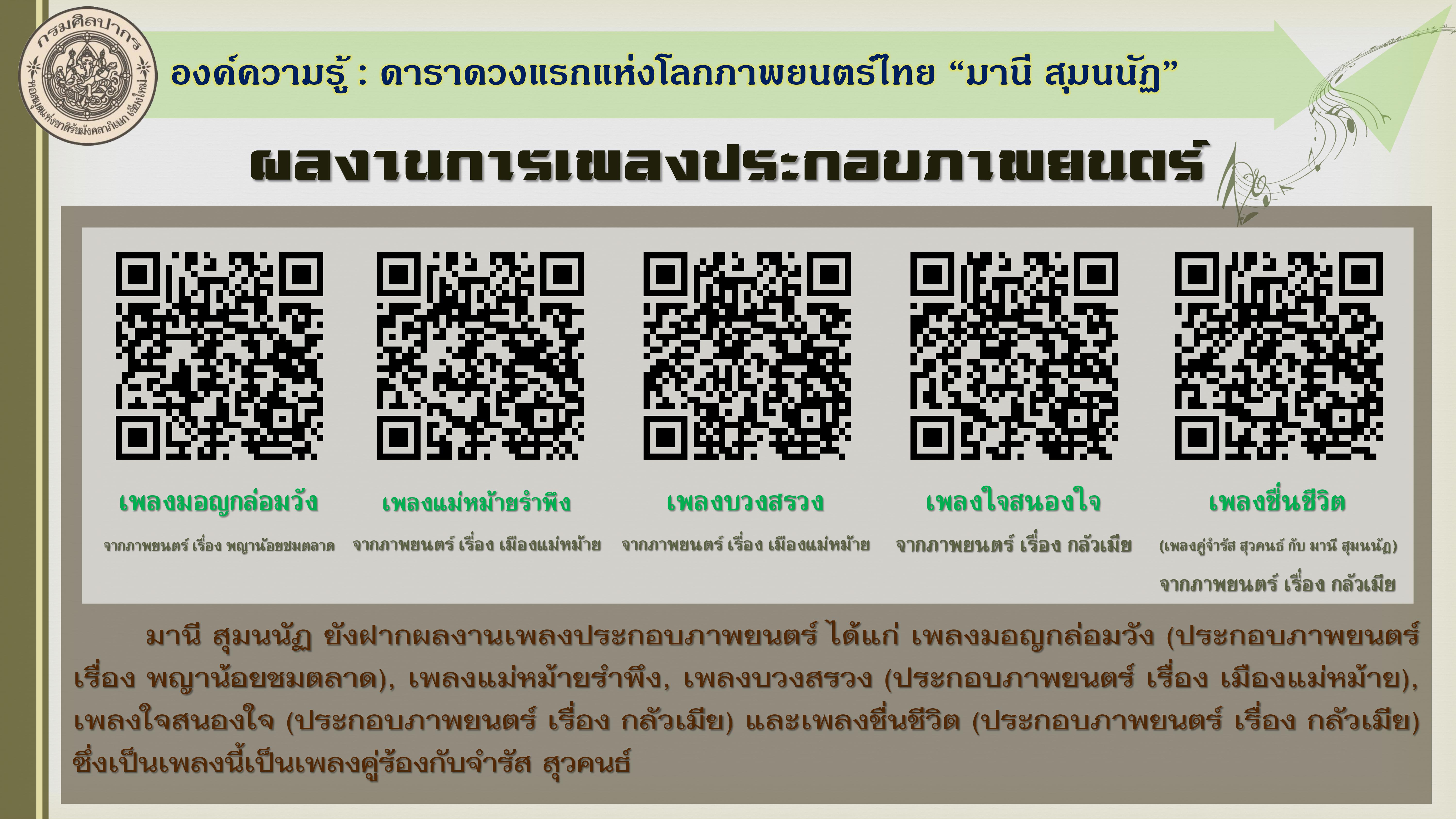 suchat somboonsuk. ชื่นชีวิต จำรัส สุวคนธ์ คู่ มานี สุมนนัฏ. [ออนไลน์]. สืบค้นเมื่อ ๙ มิถุนายน ๒๕๖๖, จาก https://www.youtube.com/watch?v=zCpRGqemC4w, ๒๕๖๓.