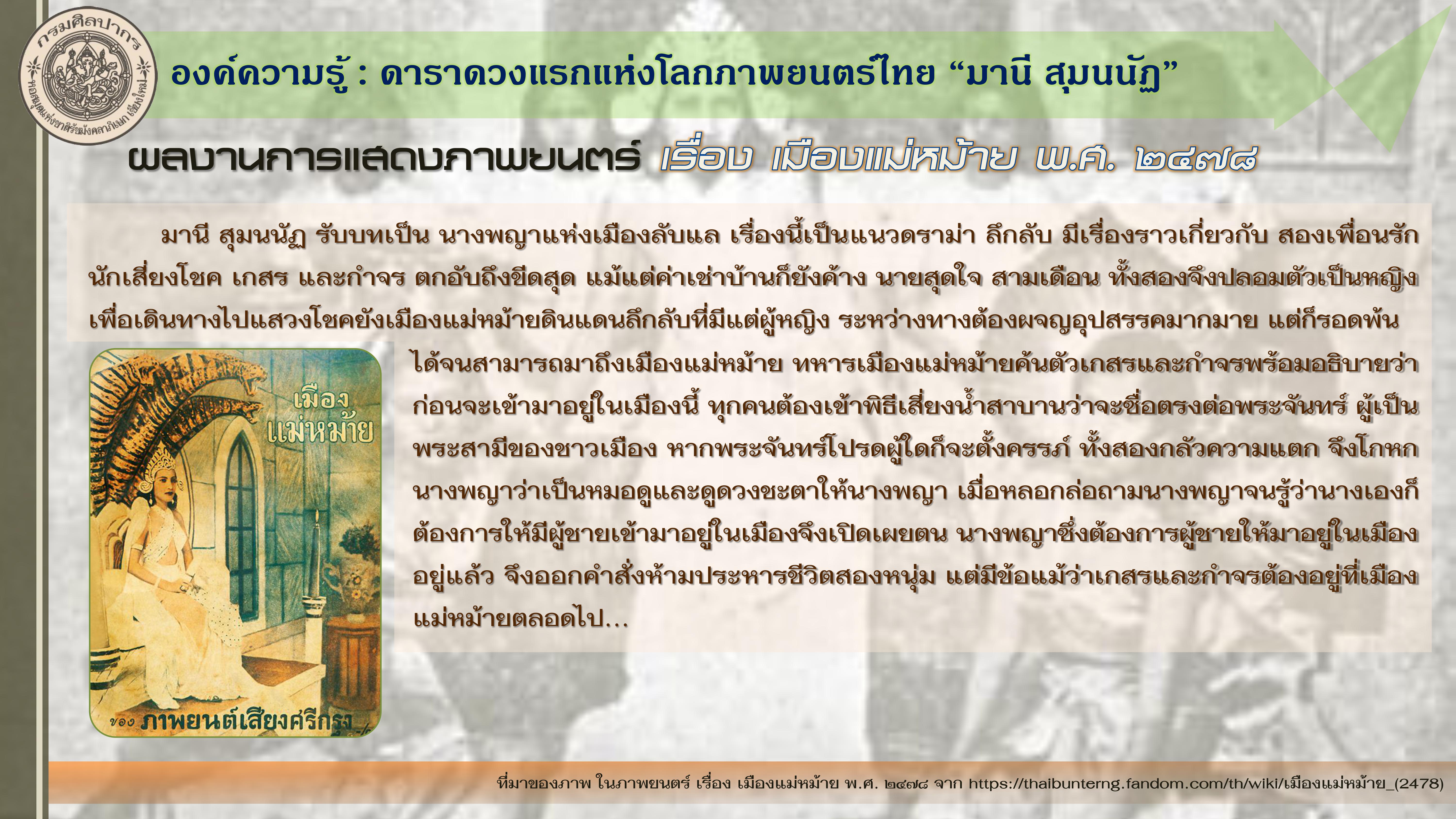 ไทยบันเทิง. เมืองแม่หม้าย (๒๔๗๘). [ออนไลน์]. สืบค้นเมื่อ ๙ มิถุนายน ๒๕๖๖, จาก https://thaibunterng.fandom.com/th/wiki/เมืองแม่หม้าย_(2478)