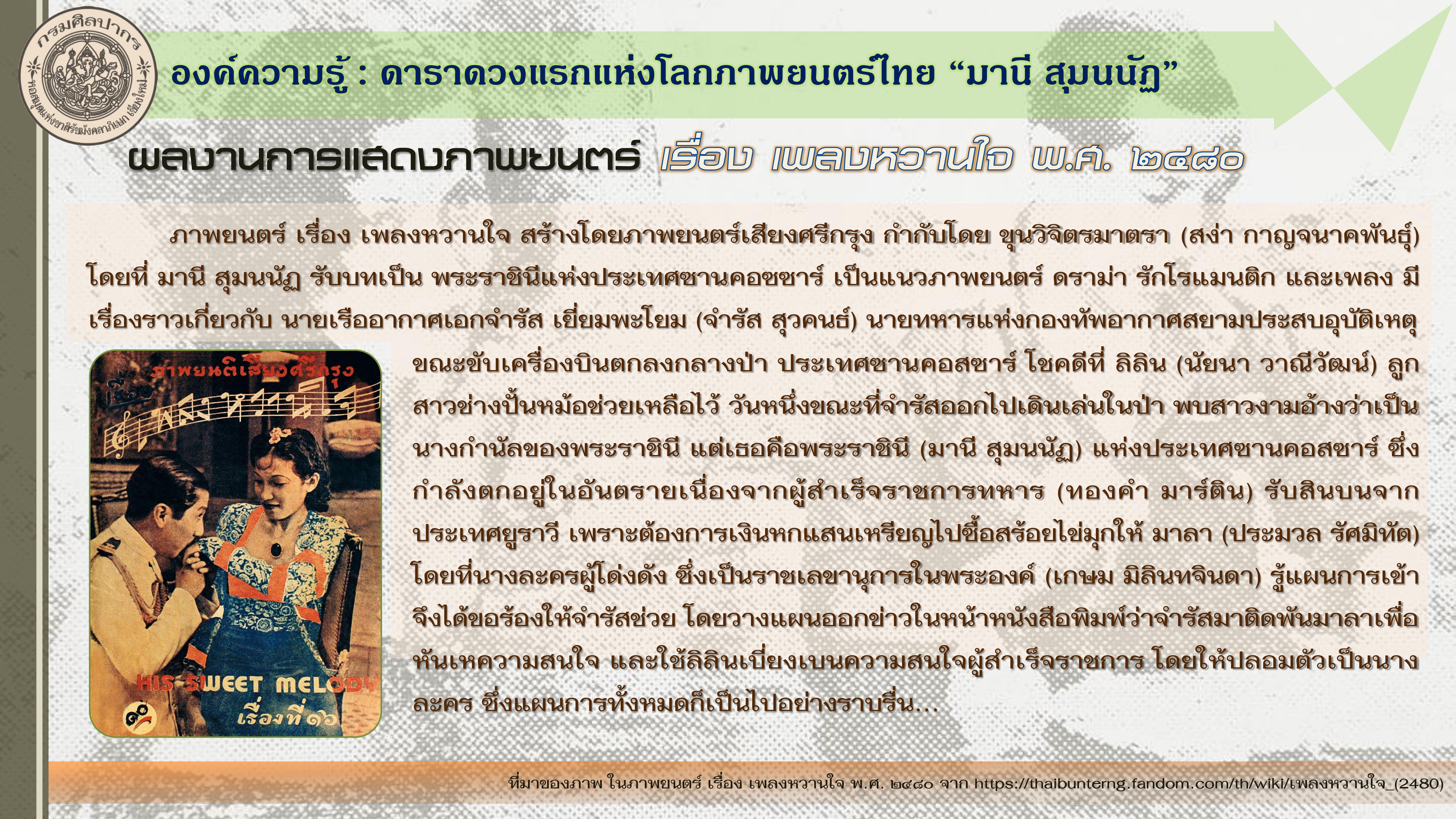 ไทยบันเทิง. เพลงหวานใจ (2480). [ออนไลน์]. สืบค้นเมื่อ ๙ มิถุนายน ๒๕๖๖, จาก https://thaibunterng.fandom.com/th/wiki/เพลงหวานใจ_(2480)