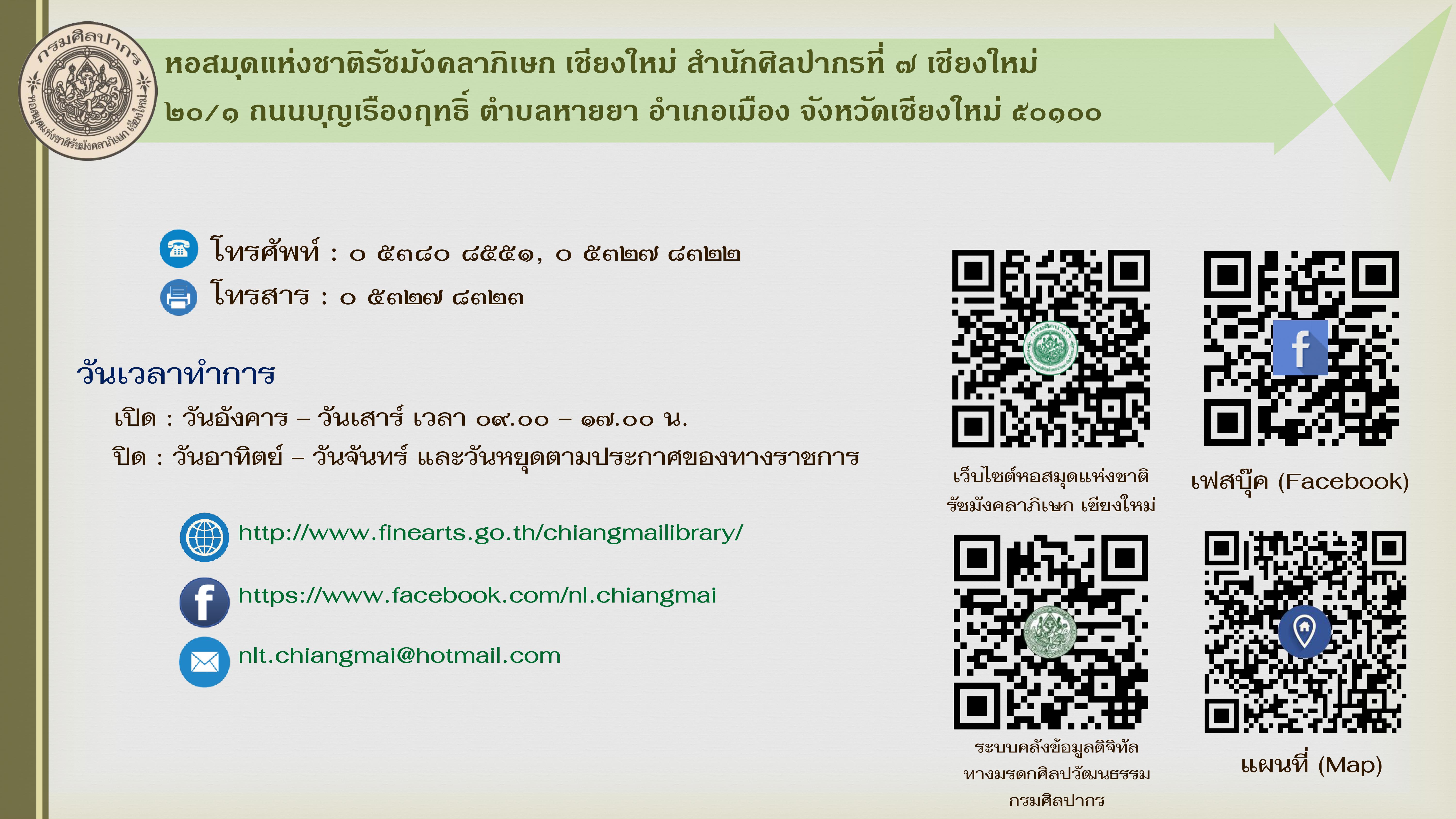 เรียบเรียงและรวบรวมโดย : นางสาวศิรดา เทพศิริ และนางสาวสุลวดี สุดใจ นักศึกษาฝึกประสบการณ์วิชาชีพ สาขาวิชาสารสนเทศศึกษา คณะมนุษย์ศาสตร์ มหาวิทยาลัยเชียงใหม่