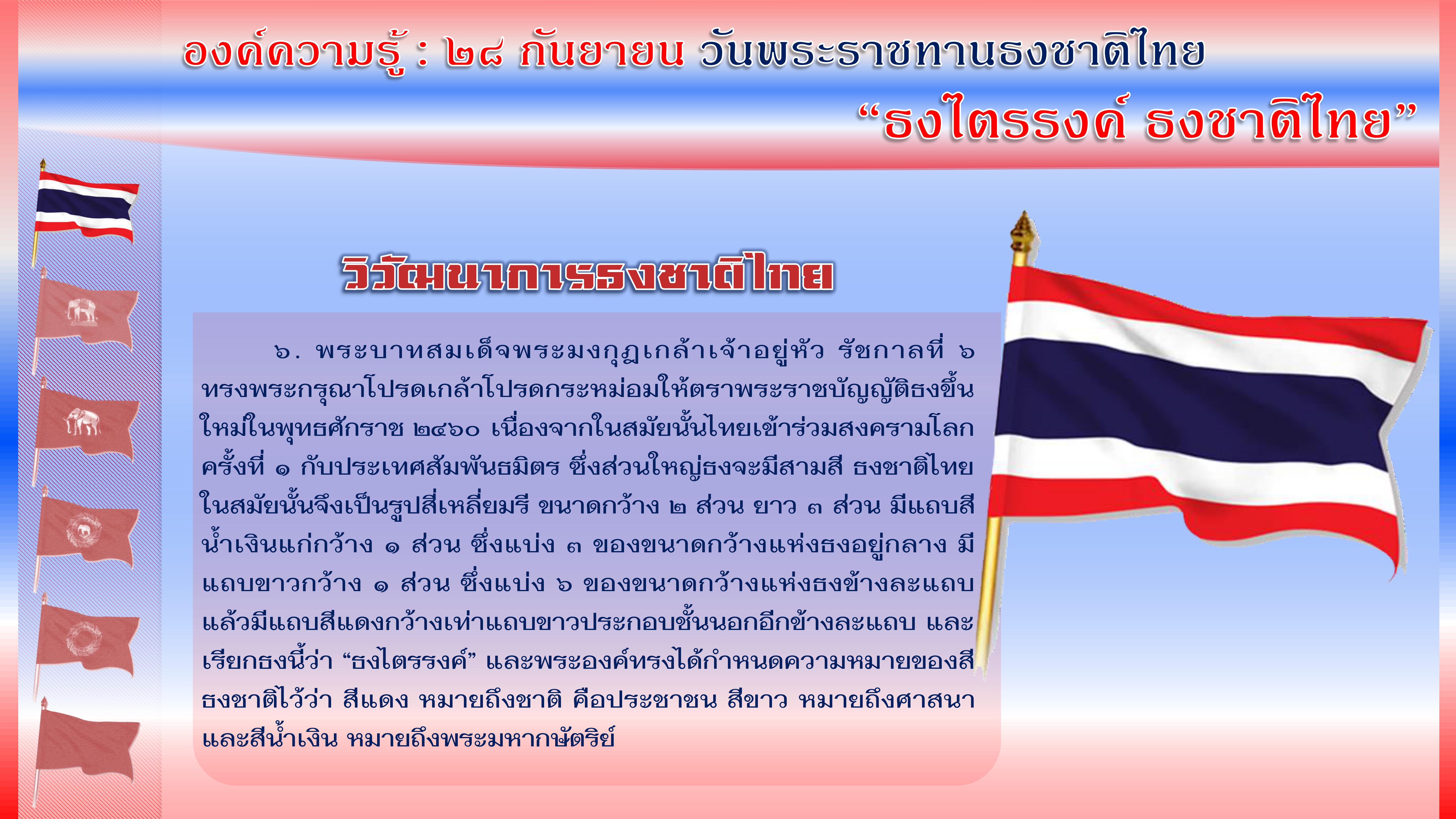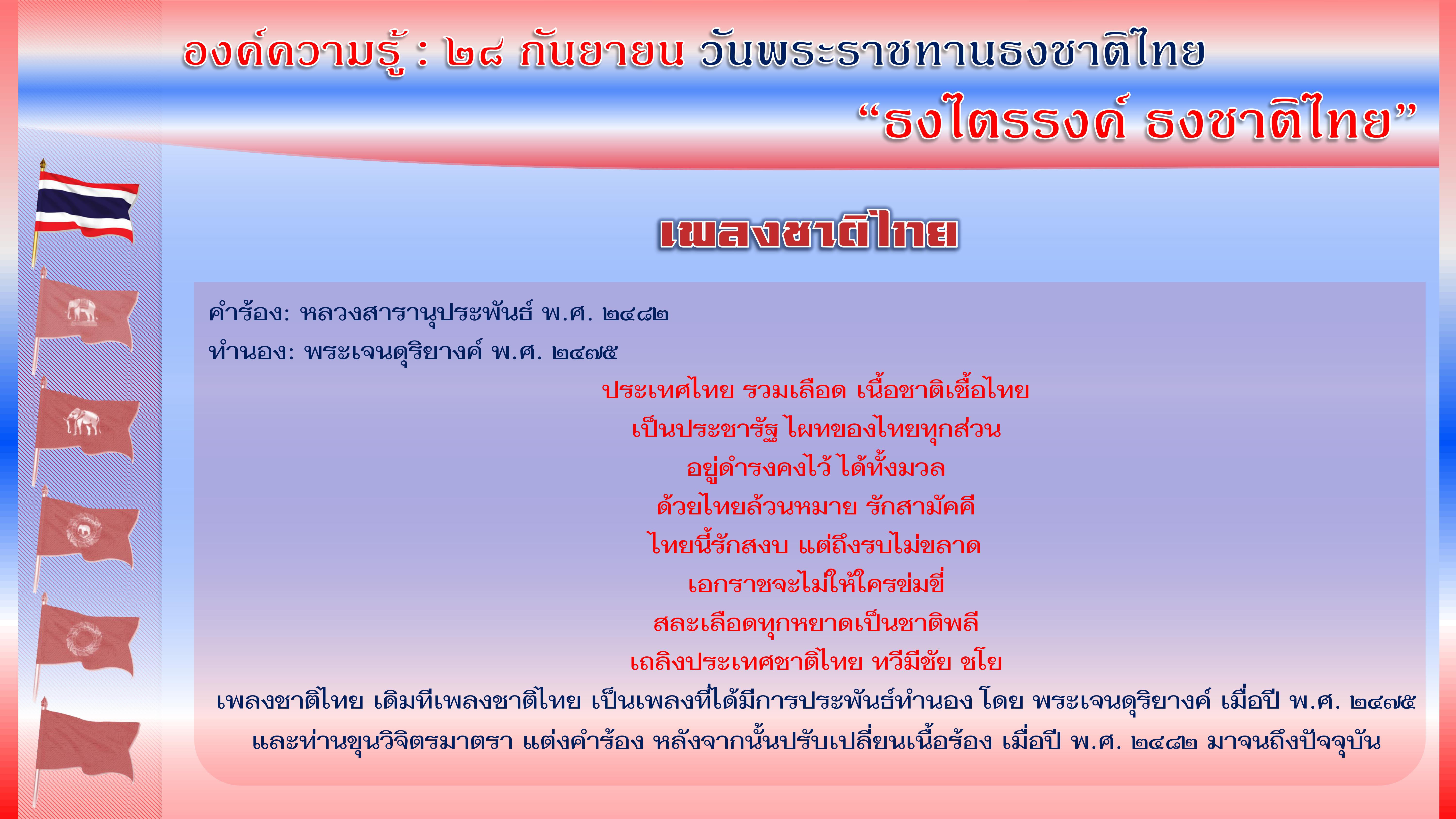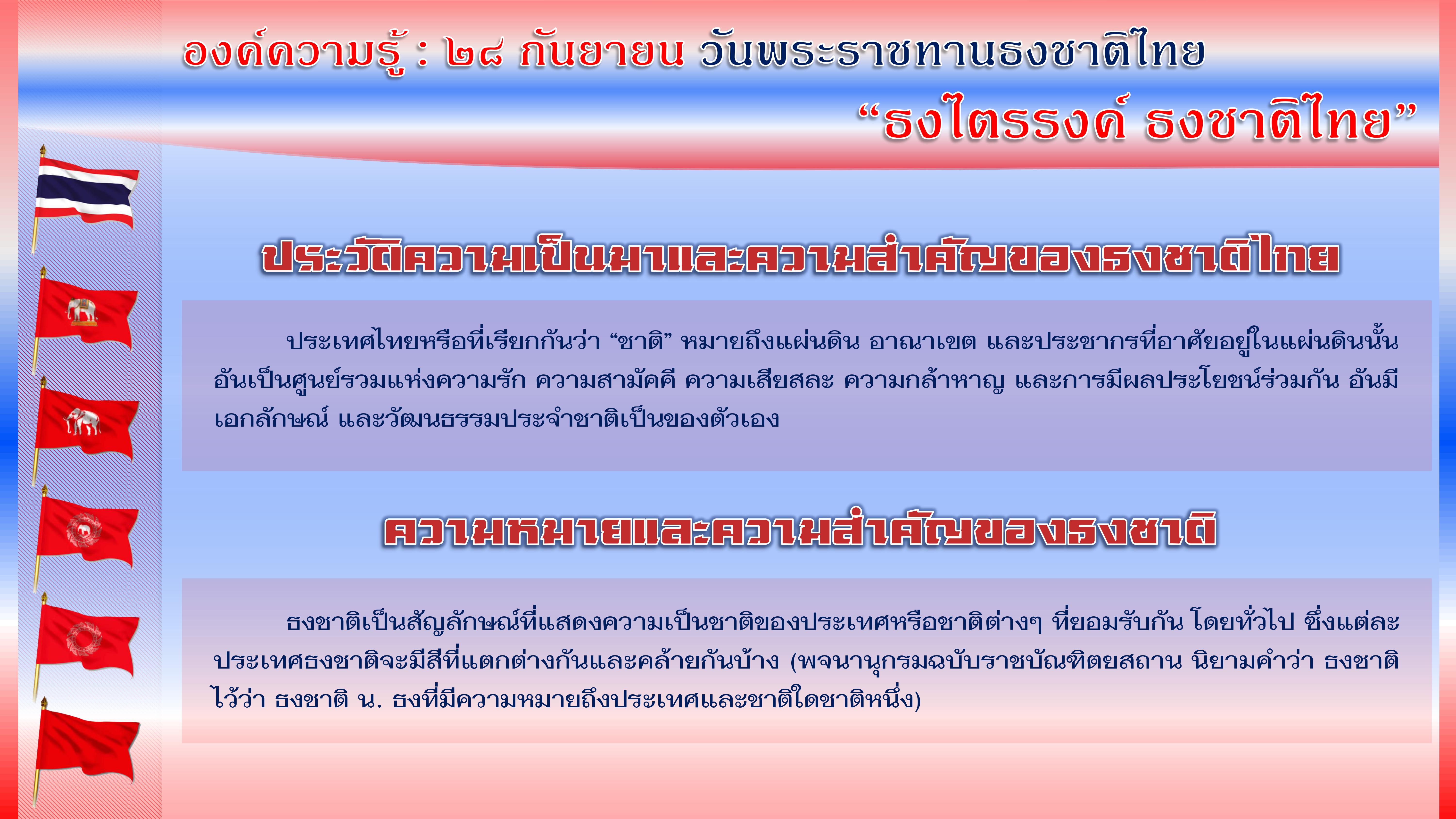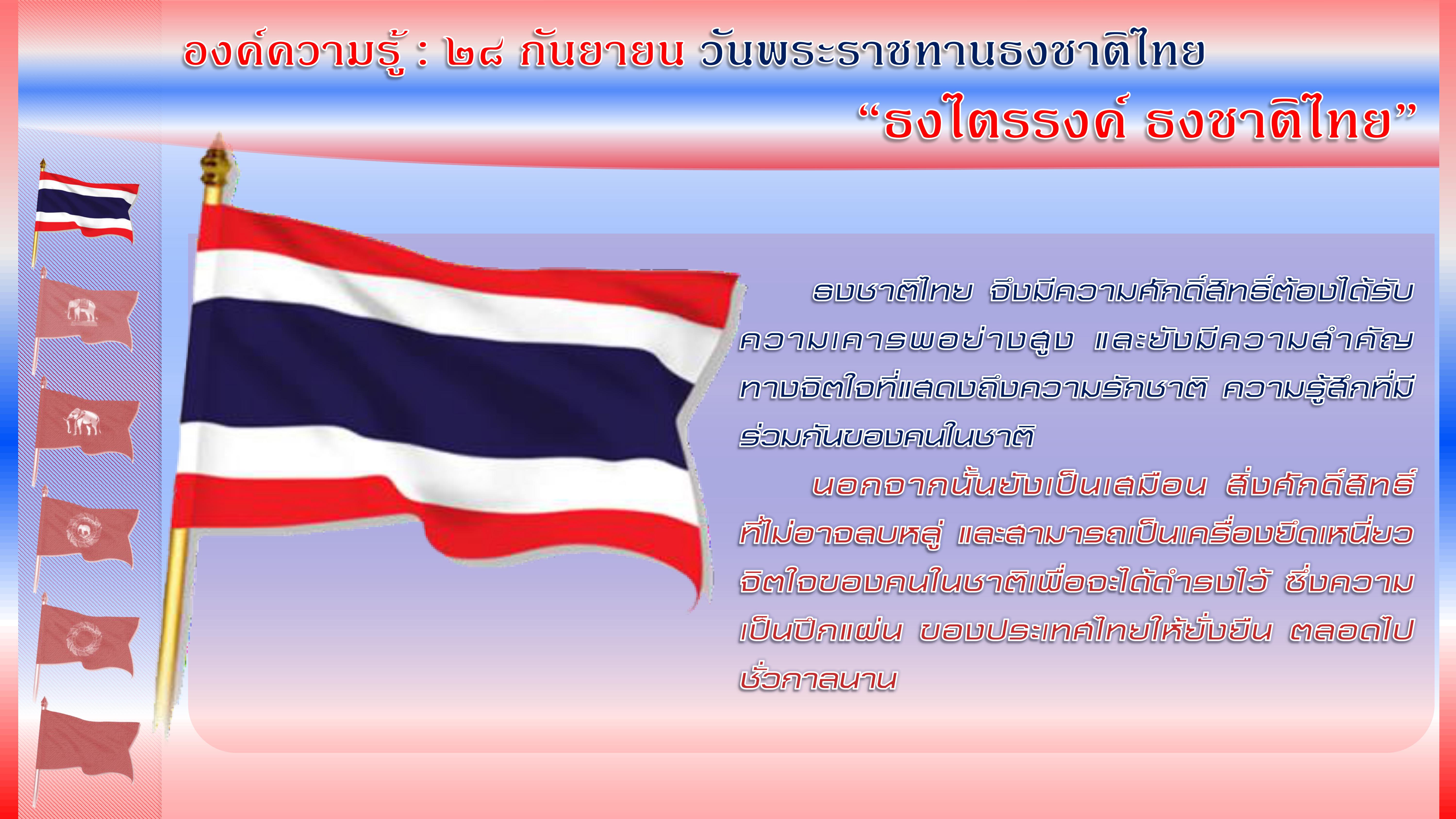 ธงชาติไทย เป็นสัญลักษณ์ของประเทศไทย หรือ ชาติไทย ที่บ่งบอก ถึงเอกลักษณ์และศักดิ์ศรีในความ เป็นไทยซึ่งมีความหมายแสดงความเป็นเอกราช อธิปไตยของชาติ รวมทั้งสถาบันชาติ ศาสนา พระมหากษัตริย์