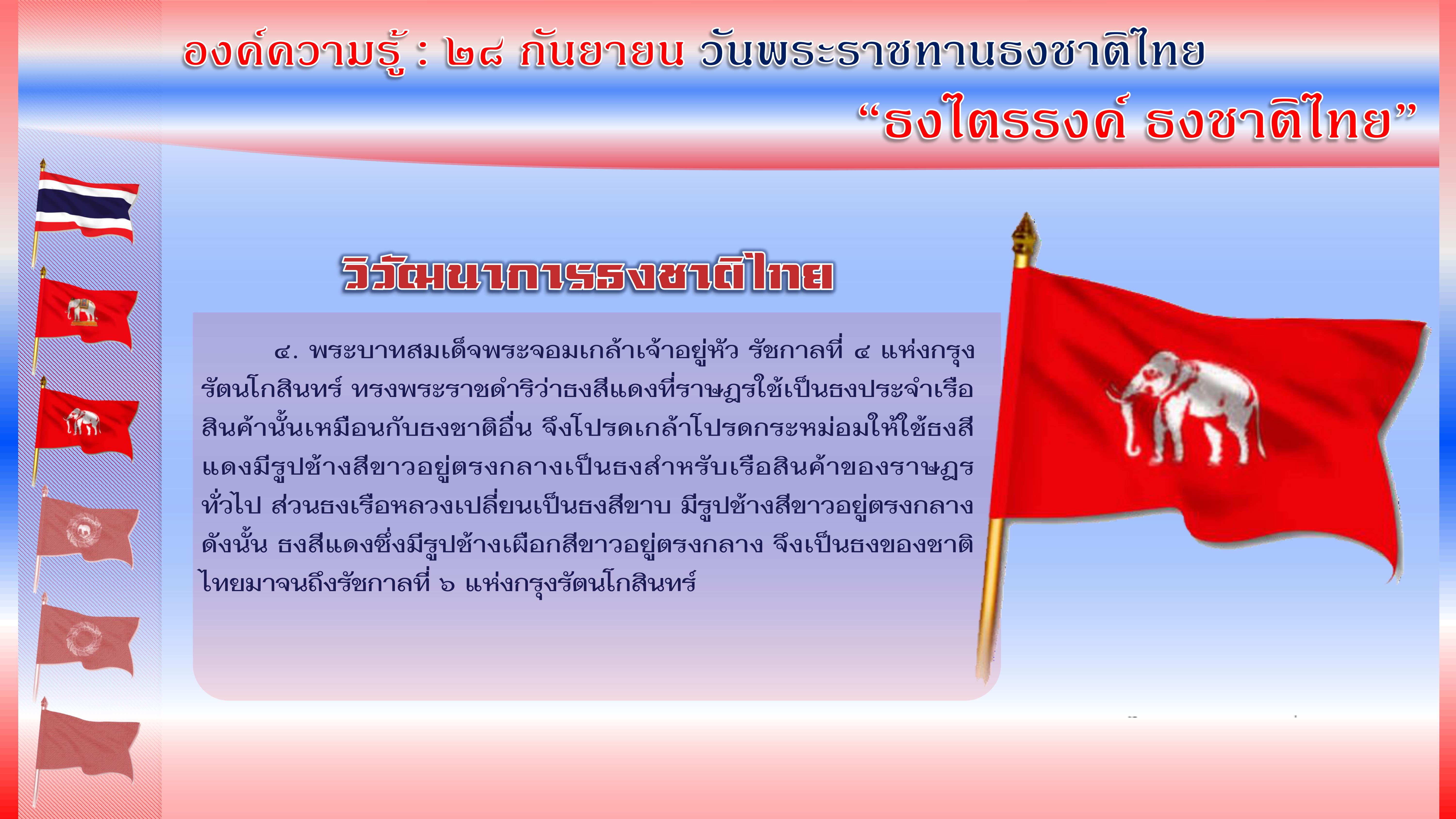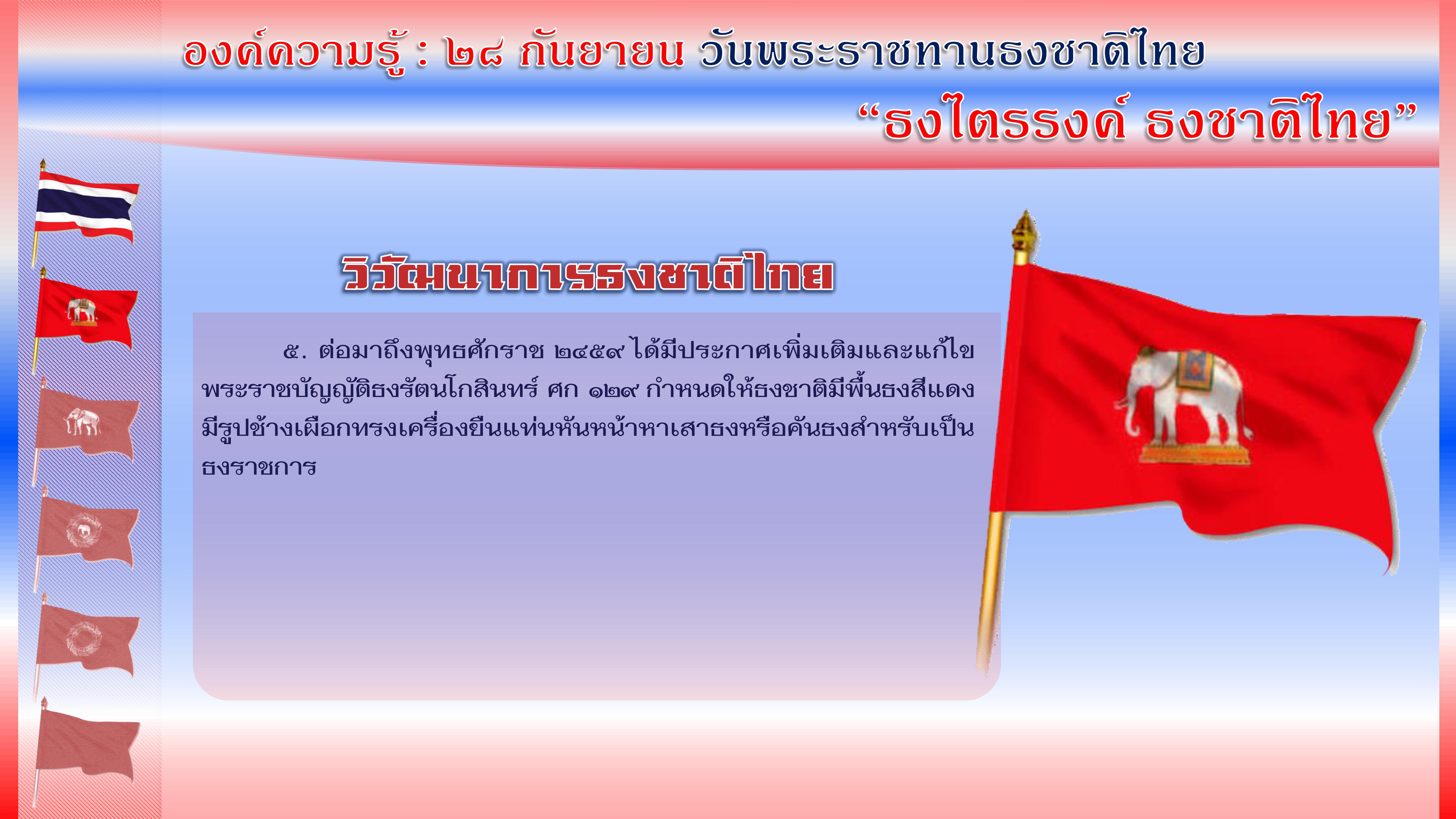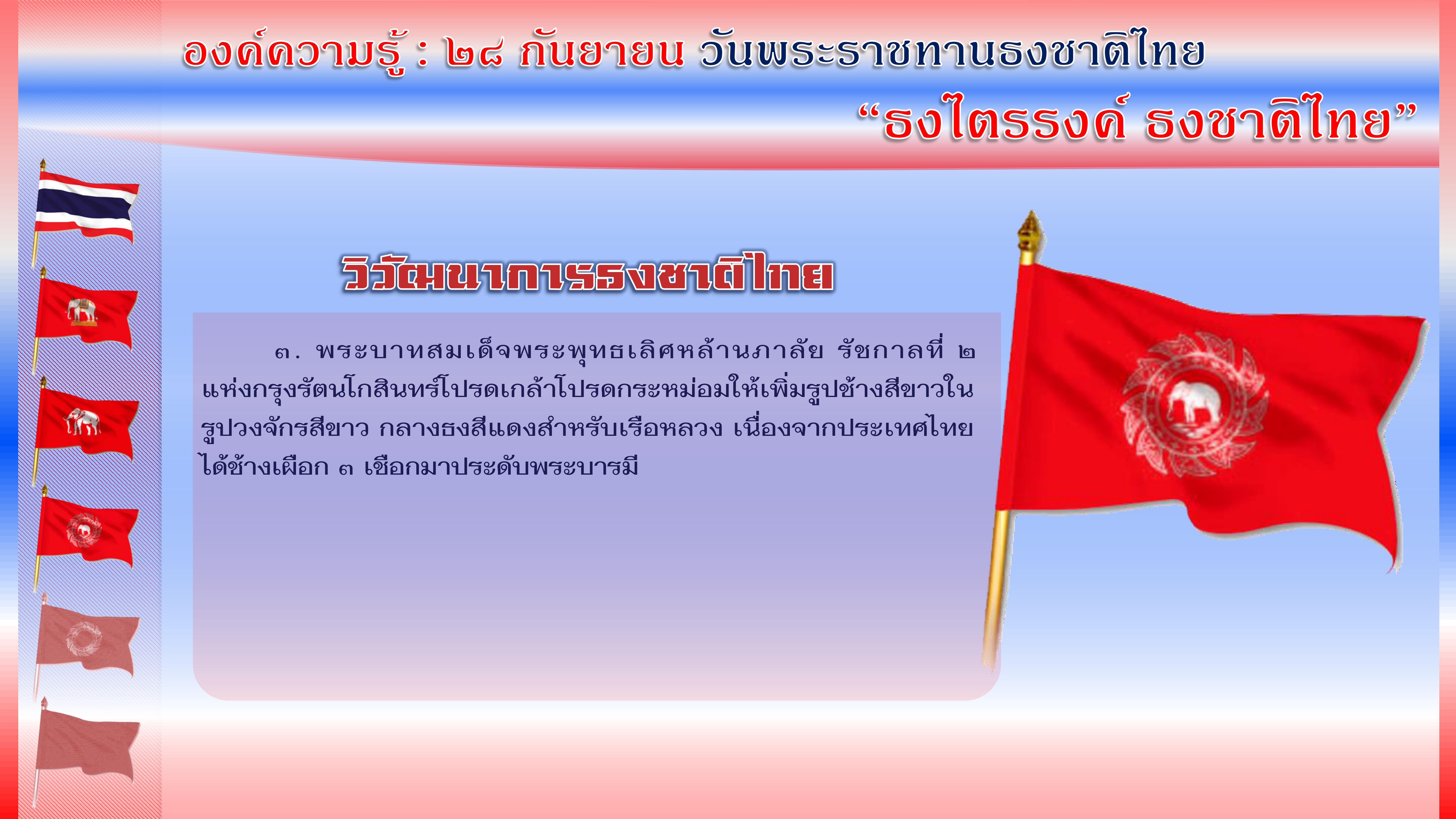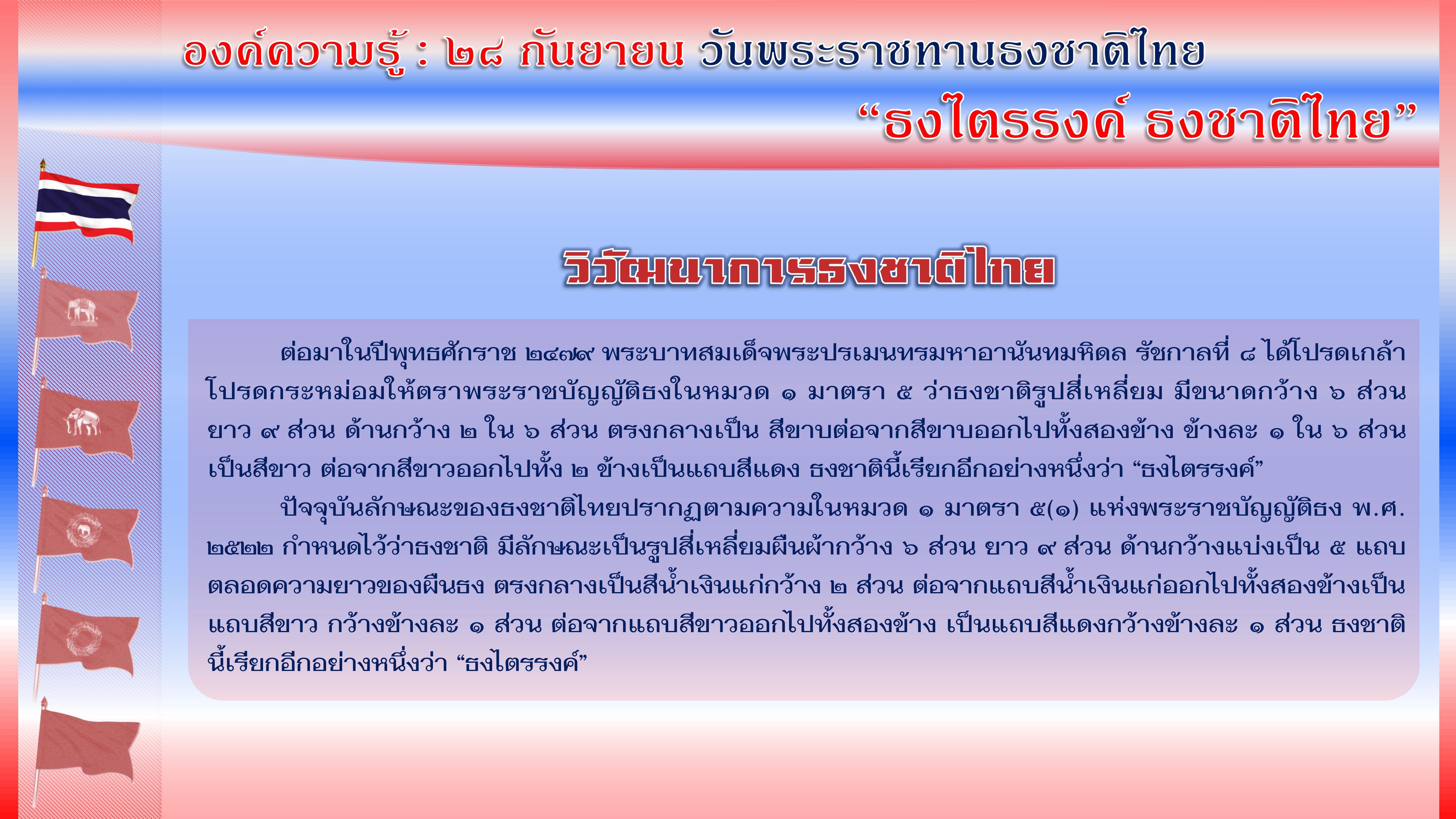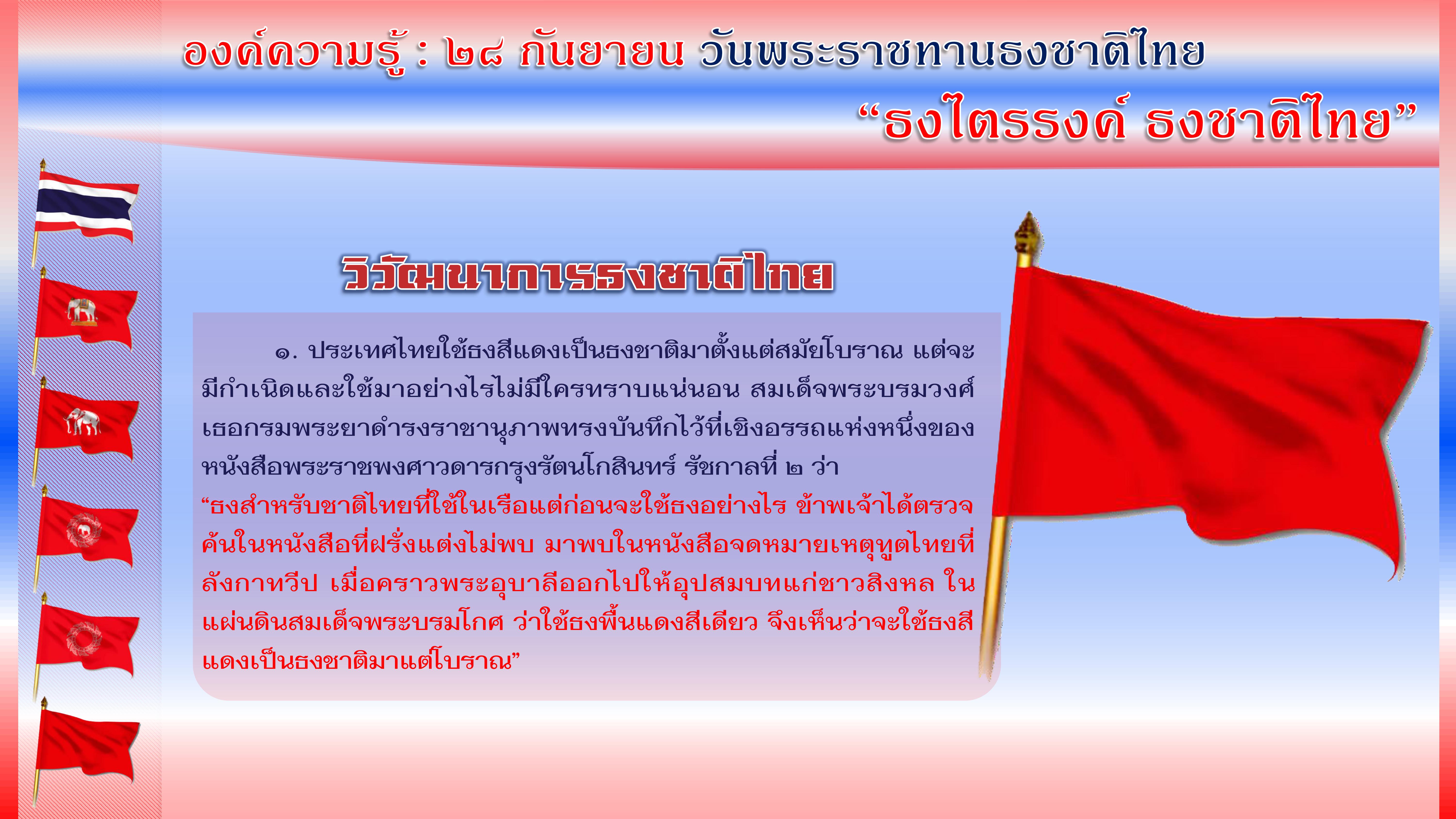 ธงชาติไทย เป็นสัญลักษณ์ของประเทศไทย หรือ ชาติไทย ที่บ่งบอก ถึงเอกลักษณ์และศักดิ์ศรีในความ เป็นไทยซึ่งมีความหมายแสดงความเป็นเอกราช อธิปไตยของชาติ รวมทั้งสถาบันชาติ ศาสนา พระมหากษัตริย์